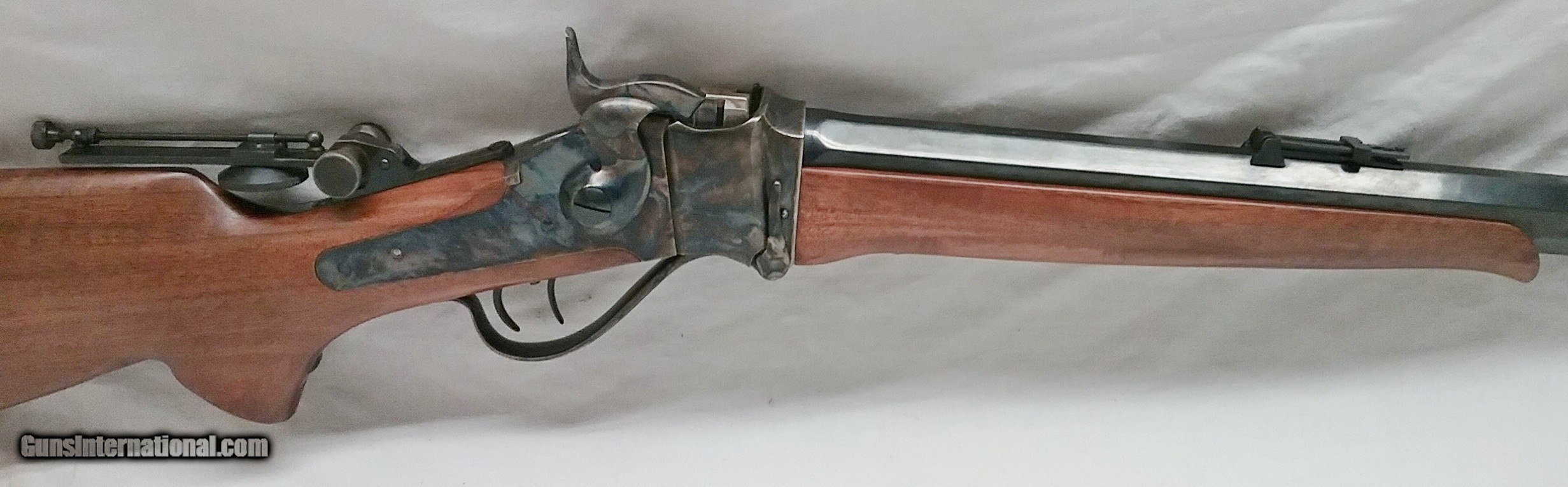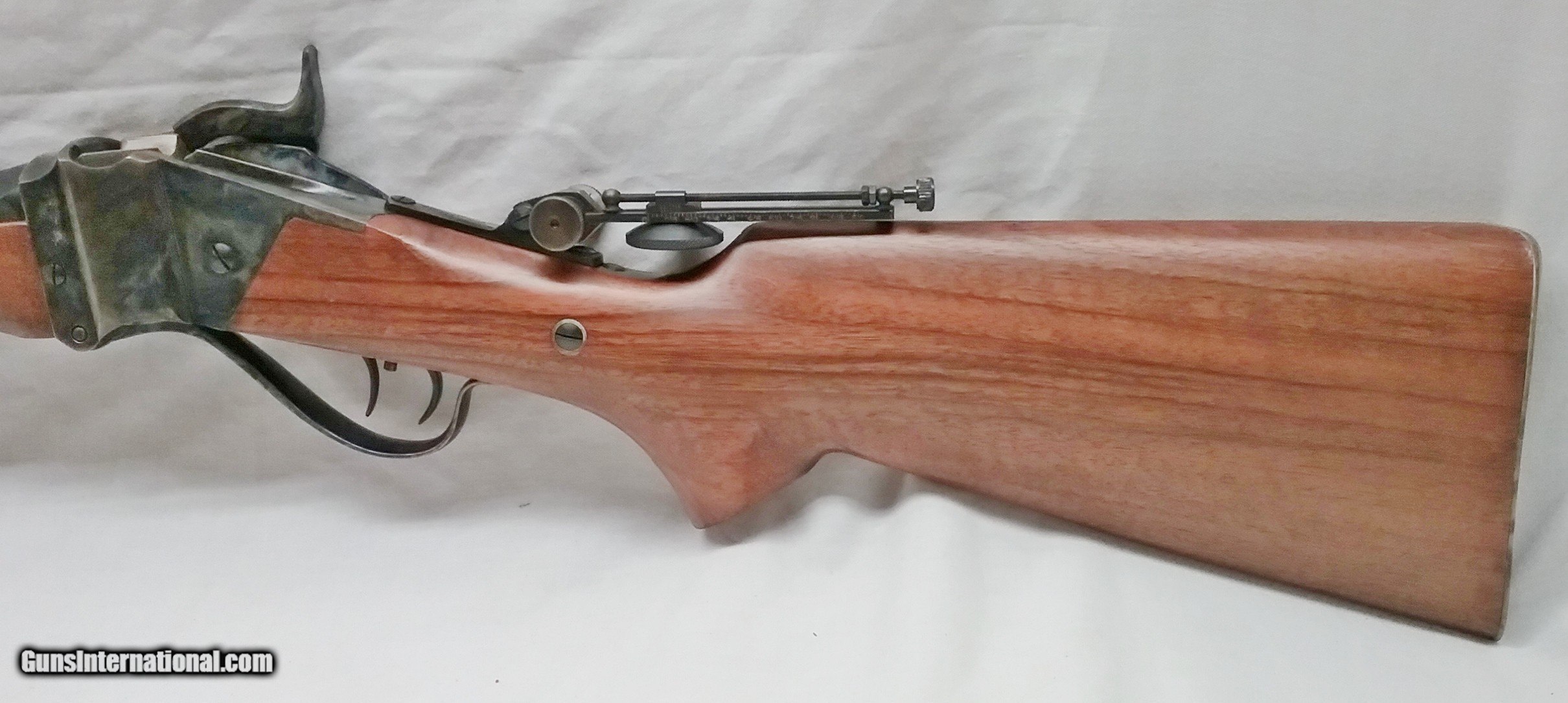 Description: This .45-70 Sharps - Model 1874 rifle has a blued tapered octagon 1-1/8" to 1" x 30" barrel with 1:18 twist that is fitted with a Lee Shavers Long Range Creedmore tang sight with windage and elevation in the base and a Spirit Level front globe sight. Also, includes a ladder rear sight. The bore is very good. Stamped on the top flat is Dixie Gun Works Inc Calibre 45-70 2 1/10. Both the P grade European Walnut buttstock and forend are in very good condition and mounted to the color case hardened action that has double set triggers. Comes with a color case hardened butt plate and sight inserts for the globe front sight. Length of pull is 14-1/4". Overall length is 47” and weight is 11.4 lbs. Our stock number is #P-32-90. Please Note: Need an FFL to purchase. Please include this information with your order. No orders will be processed without required license. Very good factory wood to metal fit - made by David Pedersoli for Dixie Gun Works. Condition: Very Good - In Box. SOLD Rifle Caliber: .45-70 Government Manufacturer: Pedersoli Model: 1874 Sharps Bore: Rifled Condition: Very Good Metal Condition: Very Good Wood Condition: Very Good Bore Condition: Very Good Barrels: One Barrel Type: Tapered Octagon Action: Single Shot Triggers: Double Set Stock: P grade European Walnut Fore End: P grade European Walnut Butt Pad: Metal LOP: 14-1/4 Finish: Blued/Color Case Hardened Weight: 11.4 lbs. Sights: Adjustable Extras: Read Description Item Location: OR |