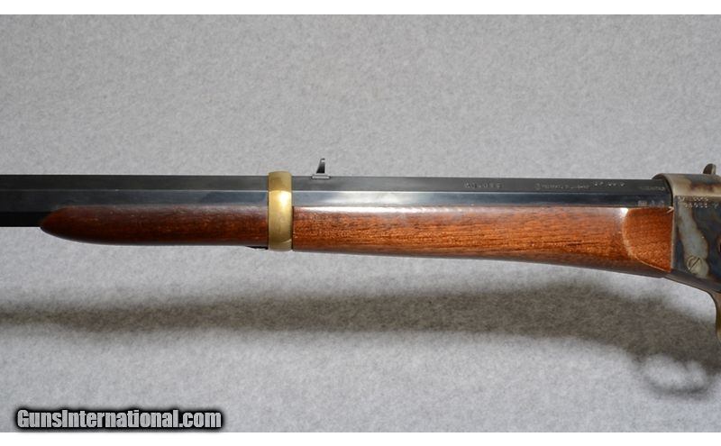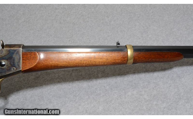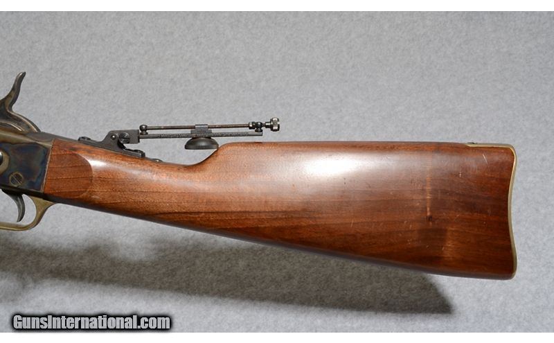 Description: This is a classic reproduction of a rolling block 45-70 frontier rifle that is excellent for big game hunting. The vernier sight makes it a great gun for distance shooting. .45-70 Government SOLD Chambers: Rolling Block Metal Condition: Excellent Wood Condition: Very good with slight handling dings. Bore Condition: Excellent Barrels: 26" Hexagonal Triggers: Factory single trigger Stock Dimensions: 14 1/2" LOP Fore End: Walnut Butt Pad: Brass metal butt plate Weight: 11 lbs. 2 ozs. Sights: Verier Sight Item Location: Tulalip, WA |