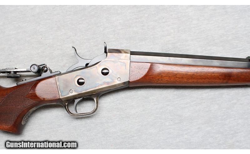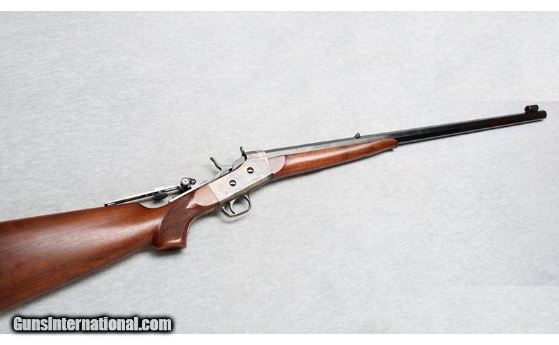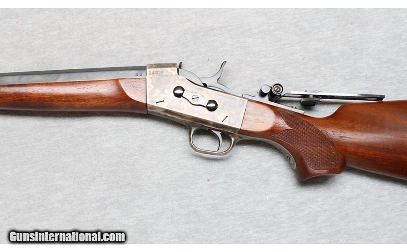 Description: Pedersoli Navy Arms Rolling Block .45-70 caliber rifle. Replica Rolling Block sporting rifle with 30" octagon heavy barrel, with excellent bore. Gun features a walnut stock and forend with steel buttplate, and a case-colored receiver. In excellent condition with light handling marks. .45-70 Government SOLD Metal Condition: Excellent Wood Condition: Excellent Bore Condition: Bright Barrels: 30 Inch heavy octagon barrel Triggers: Factotry Stock Dimensions: LOP 14 1/2 inches Fore End: Smooth Walnut Butt Pad: Metal Sights: "Aperture rear sight, Item Location: La Vista, NE |