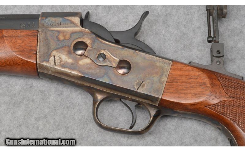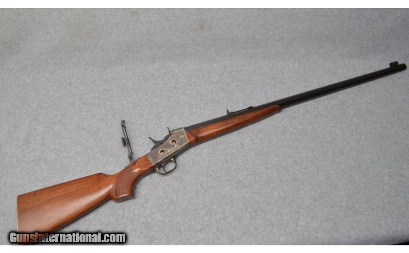 Description: This Pedersoli Rolling Block in .45-70 Government shows true craftsmanship. The smooth walnut stocks are in excellent condition showing little use. The 30" blued octogon barrel is just as nice with an excellent bore with bright shiny lands and grooves. The factory trigger is firm but crisp. There is case hardened coloring on the receiver frame and butt plate that are bright and clear. True Italian workmanship is very visable. No box. SOLD Manufacturer: S/N RO6XXX Caliber Info: .45-70 Government Metal Condition: Excellent with Case Hardened Coloring Receiver and Blued Barrel Wood Condition: Excellent Smooth Walnut Bore Condition: Excellent, Bright and Shiny Rifling Barrels: 30" Blued Octogon Triggers: Factory Single Stock: Smooth Walnut with Checkered Pistol Grip Stock Dimensions: 14 1/2" LOP Fore End: Smooth Walnut Butt Pad: Case Hardened Colored Weight: 10 LBS 3 Ounce Sights: Barrel Mounted Adjustable, Plus Vernier Peep Rear and Enclosed Front Post Item Location: West Chester, OH |
