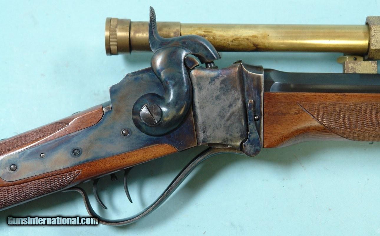 Description: 32705- PEDERSOLI SHARPS BLACK POWDER MODEL 1863 PERCUSSION SPORTING RIFLE W/ MALCOLM STYLE SCOPE. 32” octagon .54 cal. barrel with nickel blade front and Lawrence patent rear sights. Double set triggers. Checkered walnut stock and forend. Near new with the original blue and case colors. Has all the original wood finish. Perfect working order and mint bore. Has seen very little use. Brass full length D.G.W. 4x15 scope with adjustable bases. Cross hairs needing replacement. Nice quality and priced reasonably. $1200. SOLD Rifle Caliber: .54 |