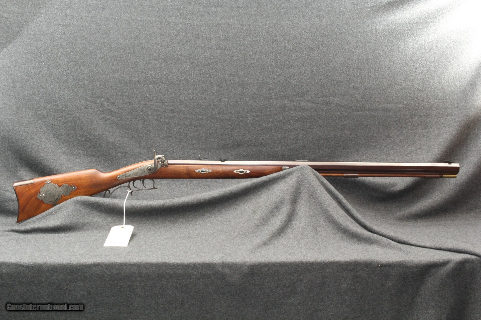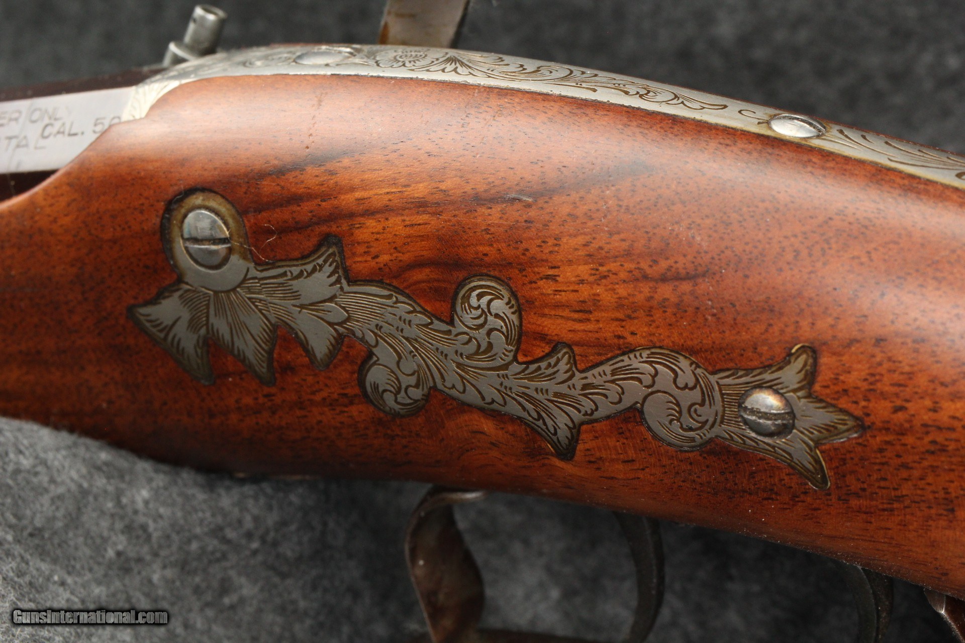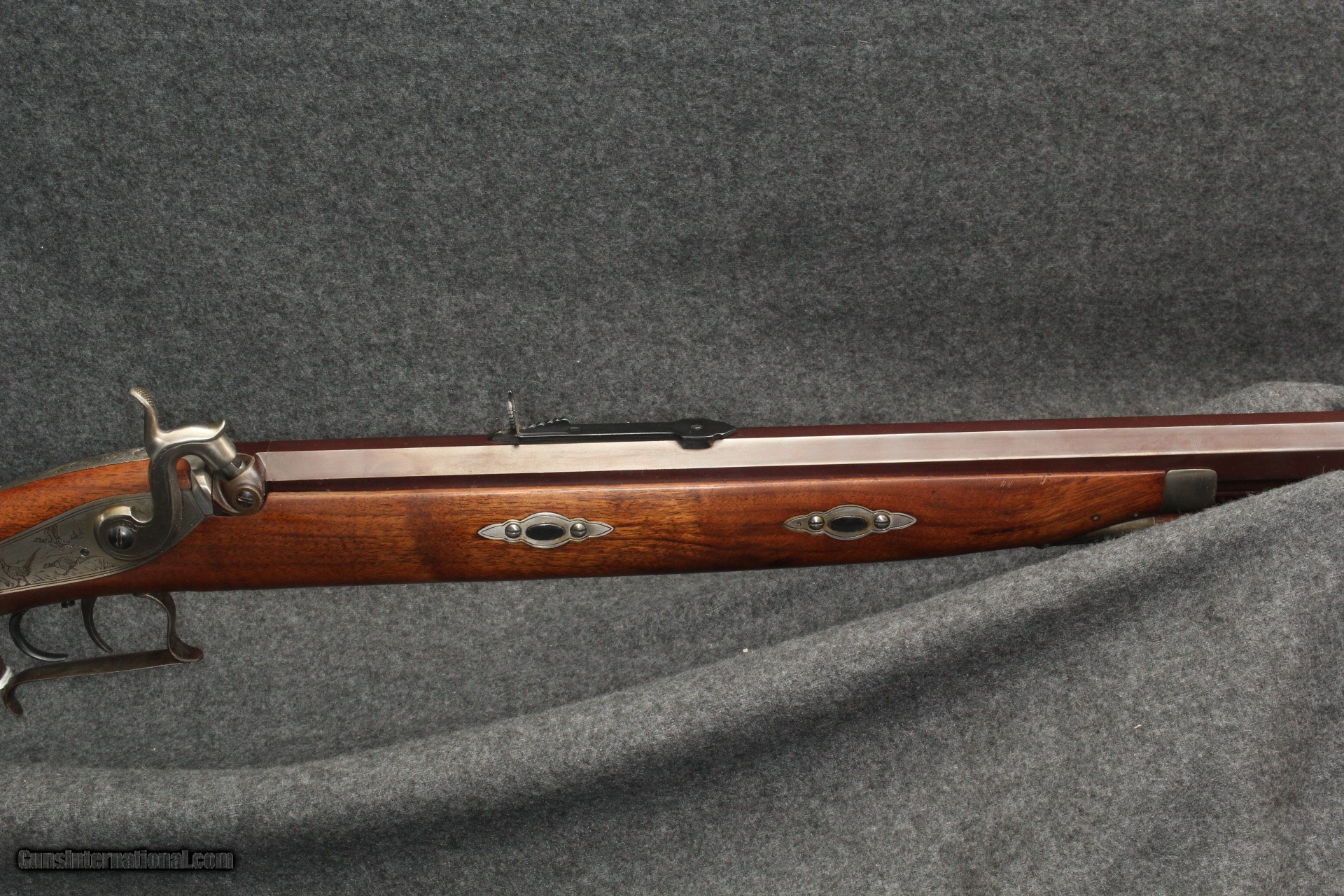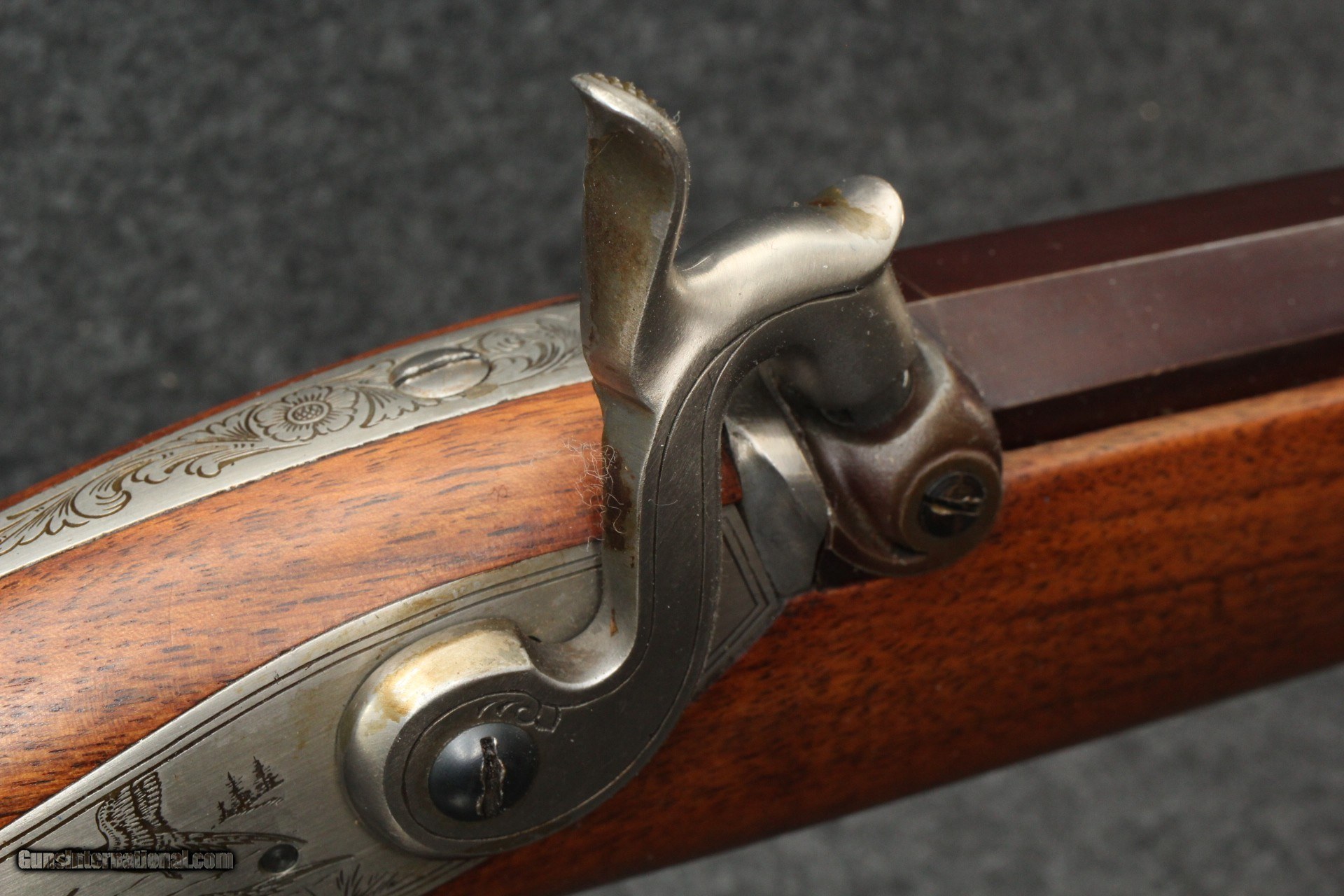 Description: 50 cal black powder percussion. Serial number 355XX. Plum brown octagon barrel, 32". Bore is excellent. Iron forward thimbles All stock furniture is German silver except for iron buttplate. Trigger guard, buttplate, patchbox, lockplate and tang are all engraved. Stock shows minor handling marks, otherwise excellent overall. More photos on request. Plesae contact us for shipping and insurance cost. SOLD |