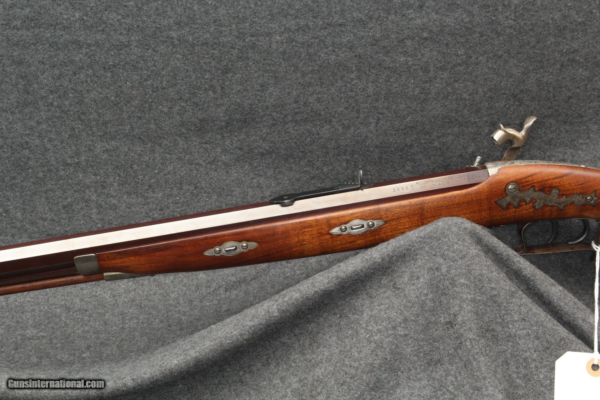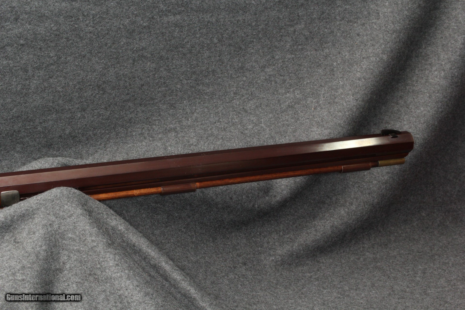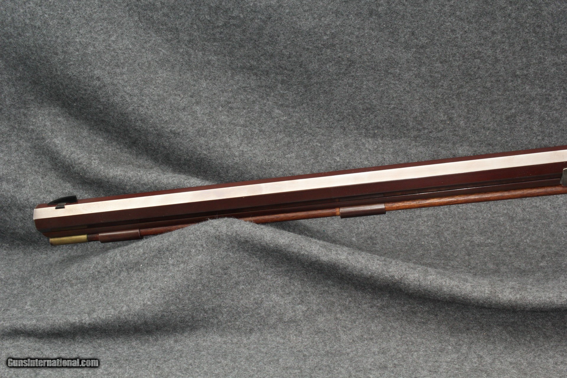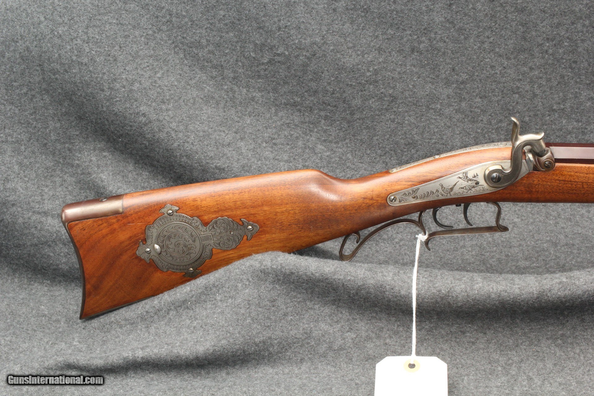 Description: 50 cal black powder percussion. Serial number 355XX. Plum brown octagon barrel, 32". Bore is excellent. Iron forward thimbles All stock furniture is German silver except for iron buttplate. Trigger guard, buttplate, patchbox, lockplate and tang are all engraved. Stock shows minor handling marks, otherwise excellent overall. More photos on request. Plesae contact us for shipping and insurance cost. SOLD |