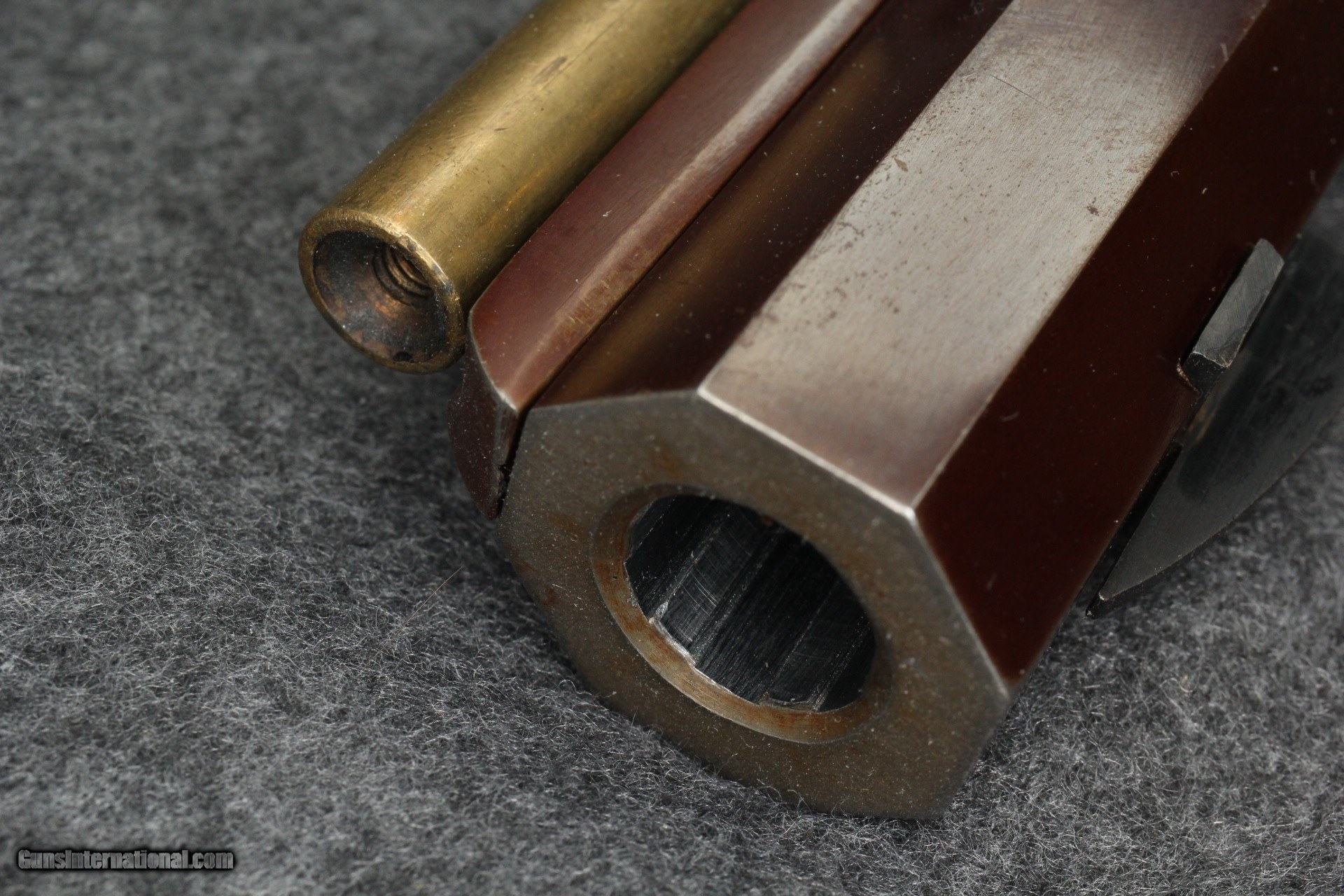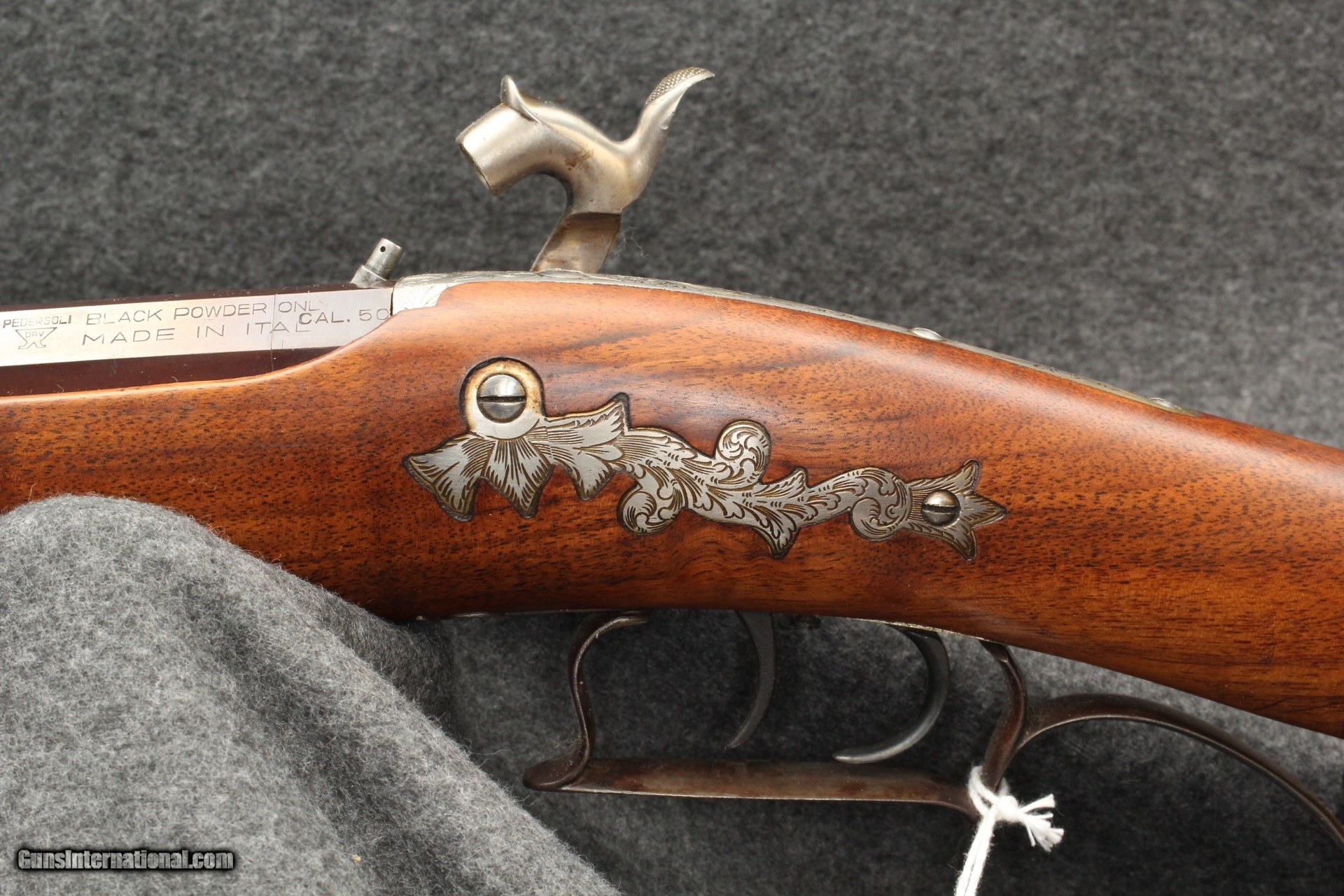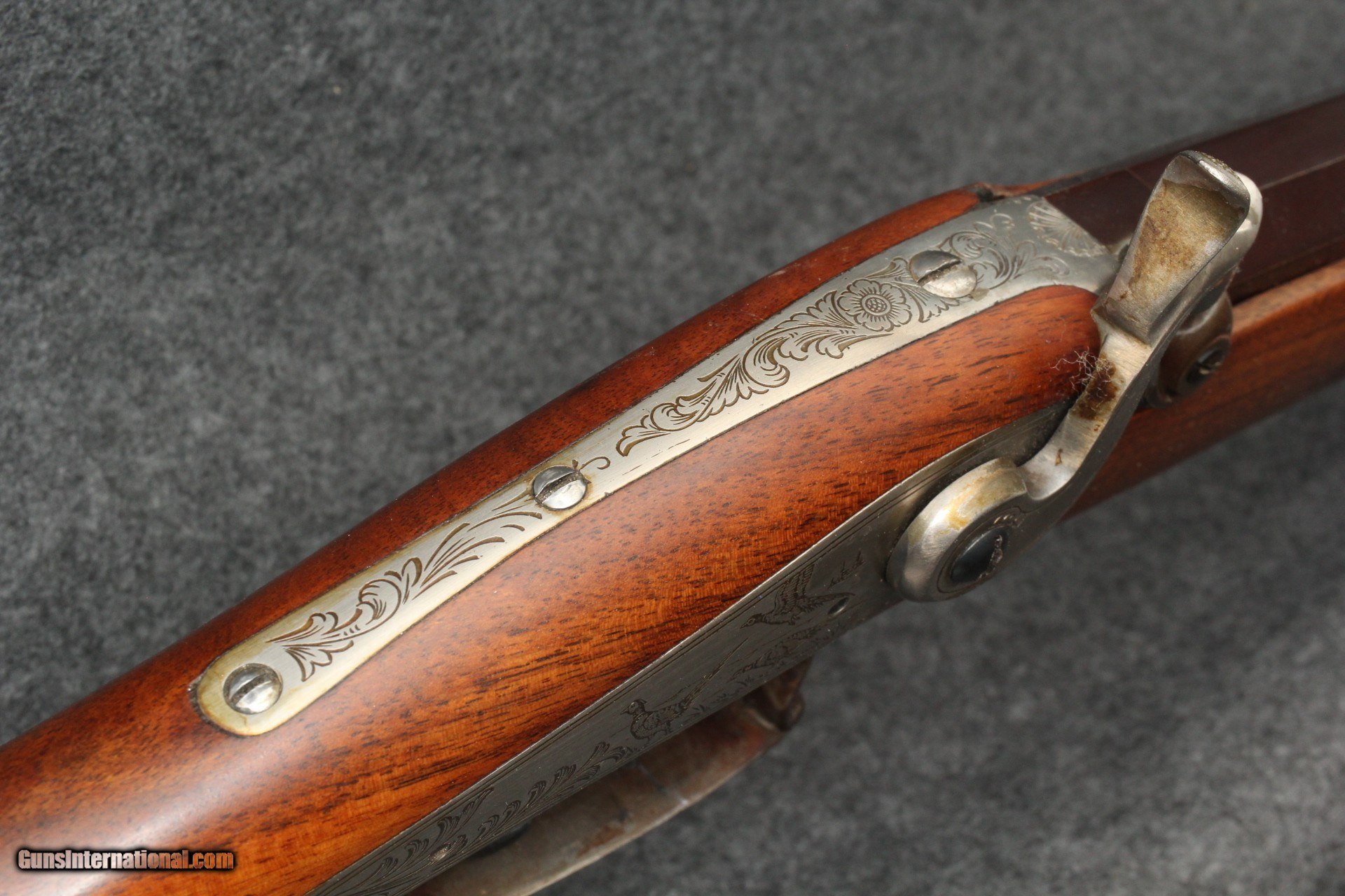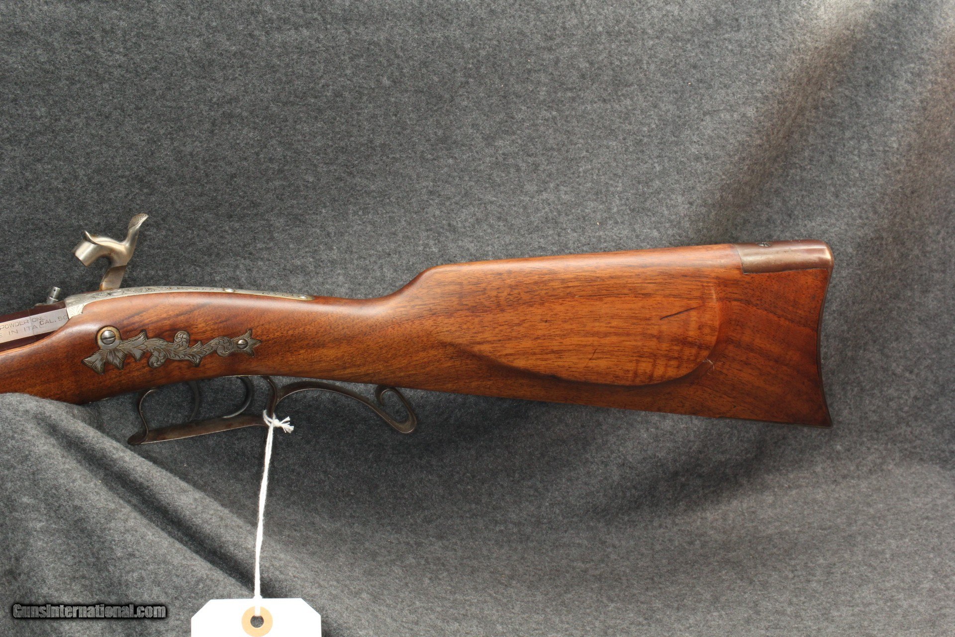 Description: 50 cal black powder percussion. Serial number 355XX. Plum brown octagon barrel, 32". Bore is excellent. Iron forward thimbles All stock furniture is German silver except for iron buttplate. Trigger guard, buttplate, patchbox, lockplate and tang are all engraved. Stock shows minor handling marks, otherwise excellent overall. More photos on request. Plesae contact us for shipping and insurance cost. SOLD |