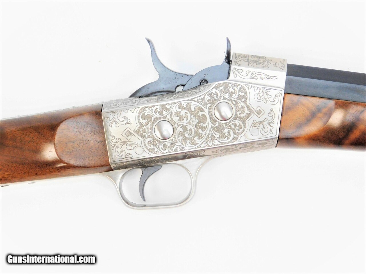 Description: Manufacturer: Taylor's & Co. / Pedersoli Model: Rolling Block Target Deluxe SKU: RIF/L852.357 Capacity: Single Shot Caliber: .357 Magnum Barrel Length: 30" Octagonal, Blued Finish: Blue Barrel with Silver Engraved Receiver Stock: Walnut OAL: 46.34" Sights: Blade Front, Adjustable Rear Rolling Block rifles are fantastic reproductions of one of the most popular cartridge guns and great rival of the Sharps in its time. The special lock system, is certainly one of the safest, and was subsequently used all over the world. Metal parts made of steel, produced in various calibers and different barrels lengths. Produced with octagonal, conical blued barrel. The frame is embellished with a nice engraving and old silver colour finishing. There is a blade front sight and adjustable rear. Butt plate and trigger guard made of steel. Straight stock and forend made of walnut oil finish. SOLD |