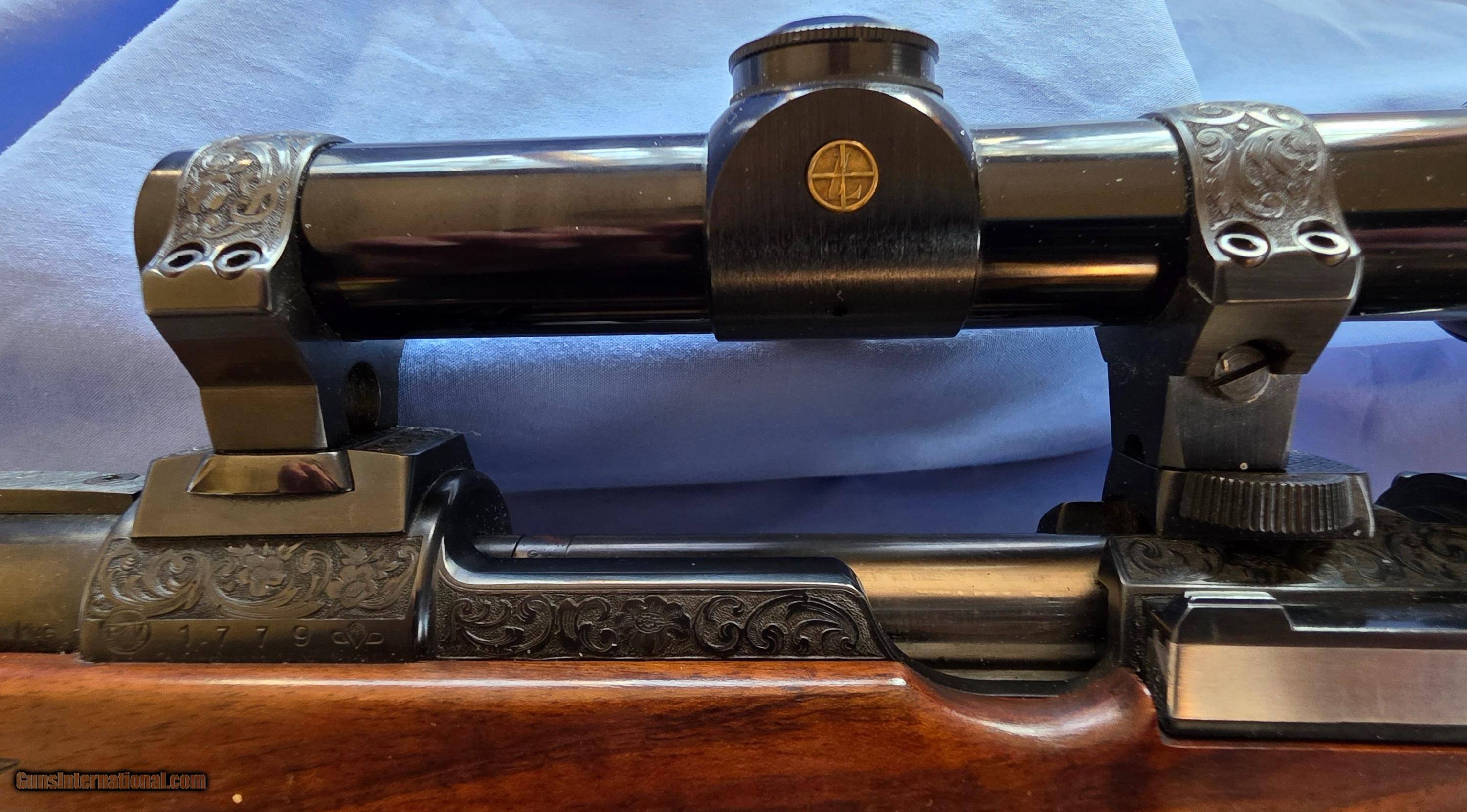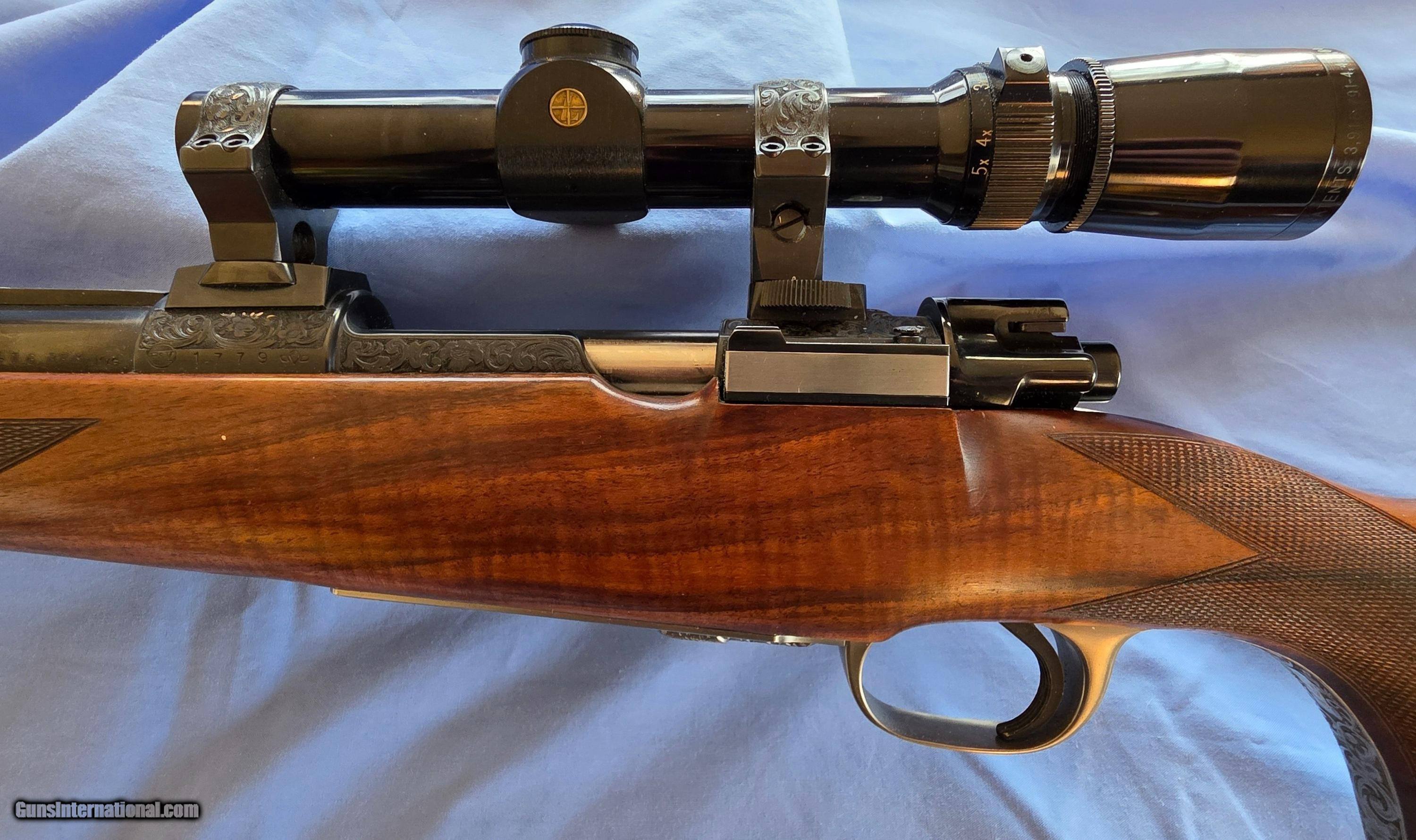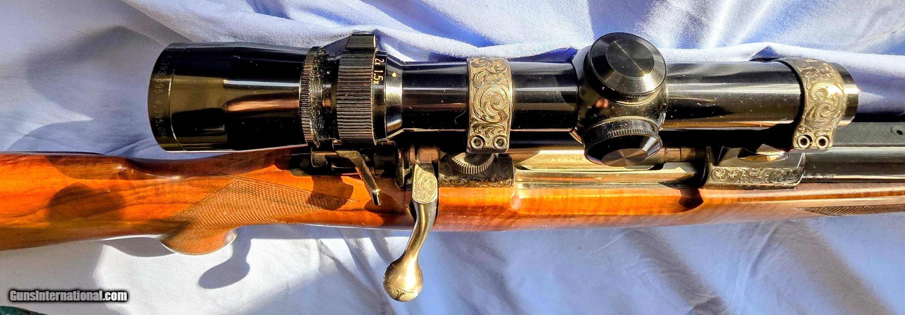 Description: Model "Professional" Bohler Steel bolt action, lever release floor plate, extensively engraved game scenes, gold details. Test fired only, practically new. Beautiful Turkish walnut stock. Finest workmanship. Claw mounted Leupold 1.5-5x scope. Shipping additional cost. Price: $21,500.00 Contact Seller |
