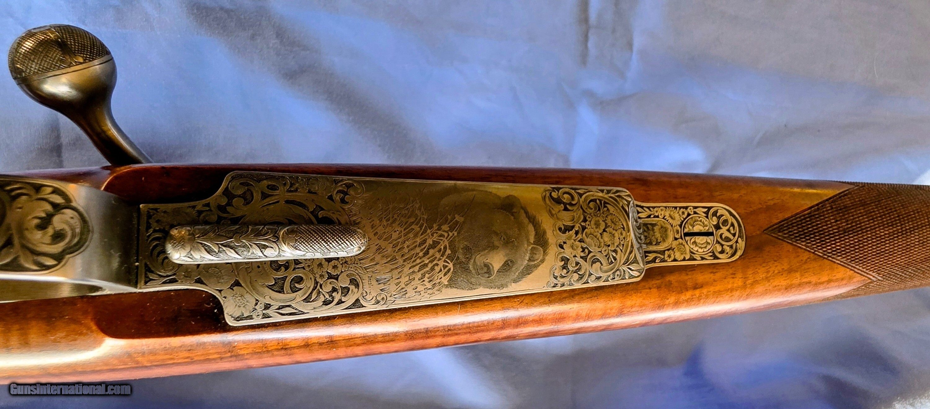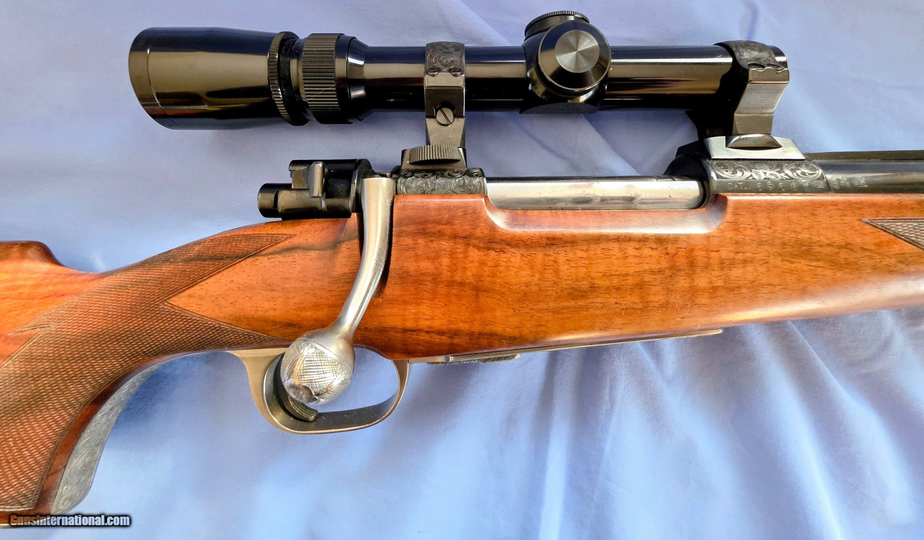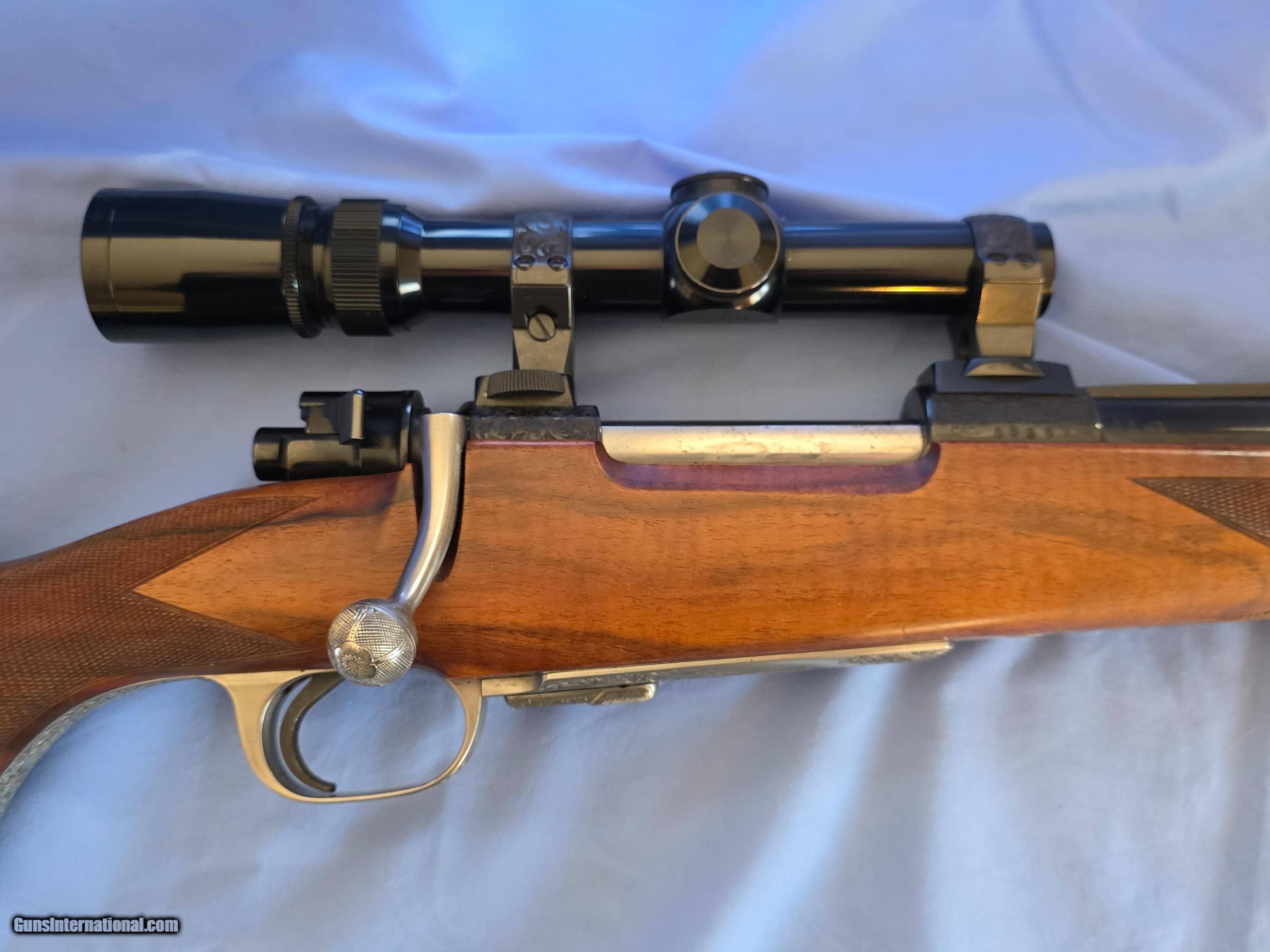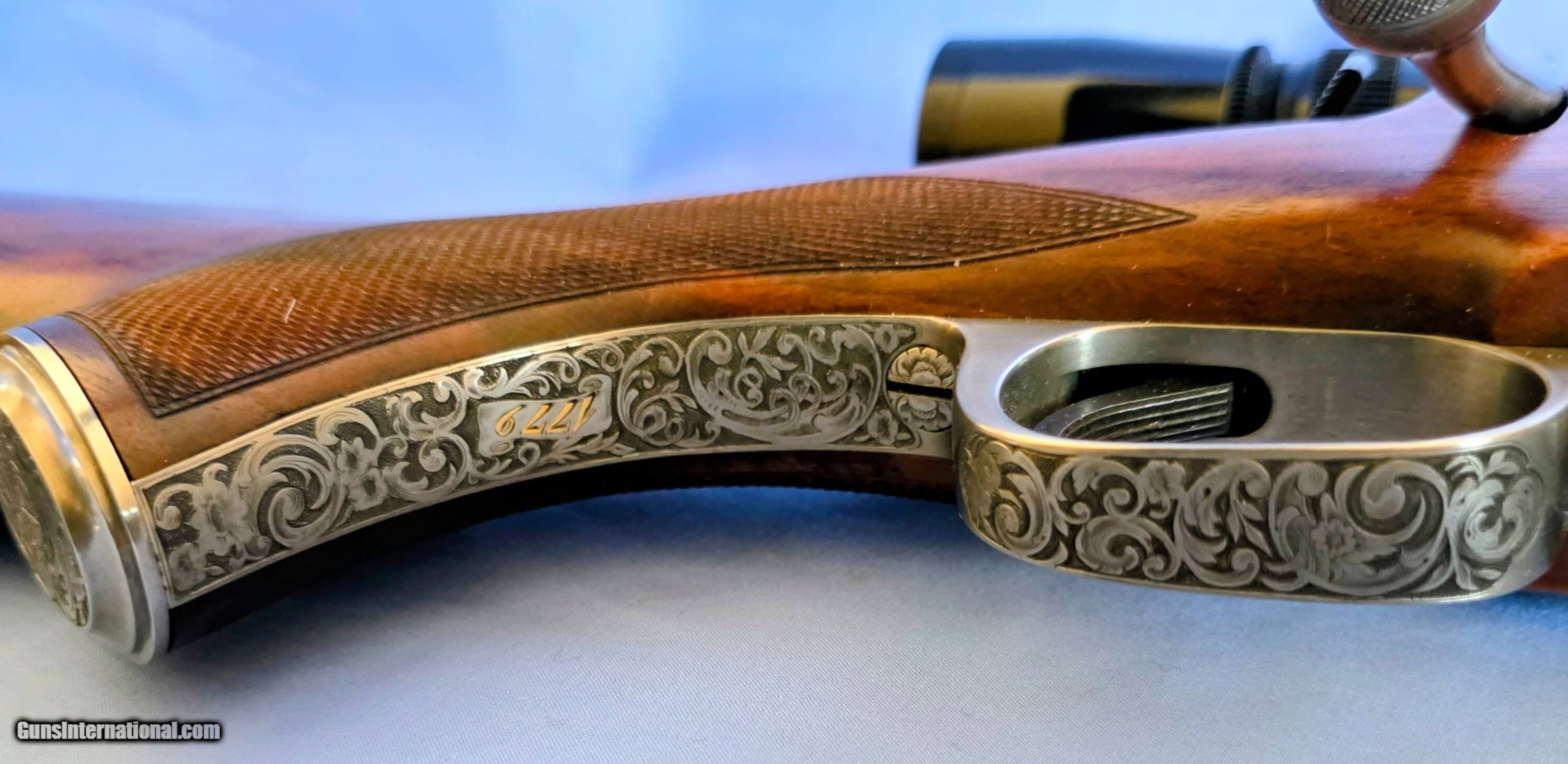 Description: Model "Professional" Bohler Steel bolt action, lever release floor plate, extensively engraved game scenes, gold details. Test fired only, practically new. Beautiful Turkish walnut stock. Finest workmanship. Claw mounted Leupold 1.5-5x scope. Shipping additional cost. Price: $21,500.00 Contact Seller |
