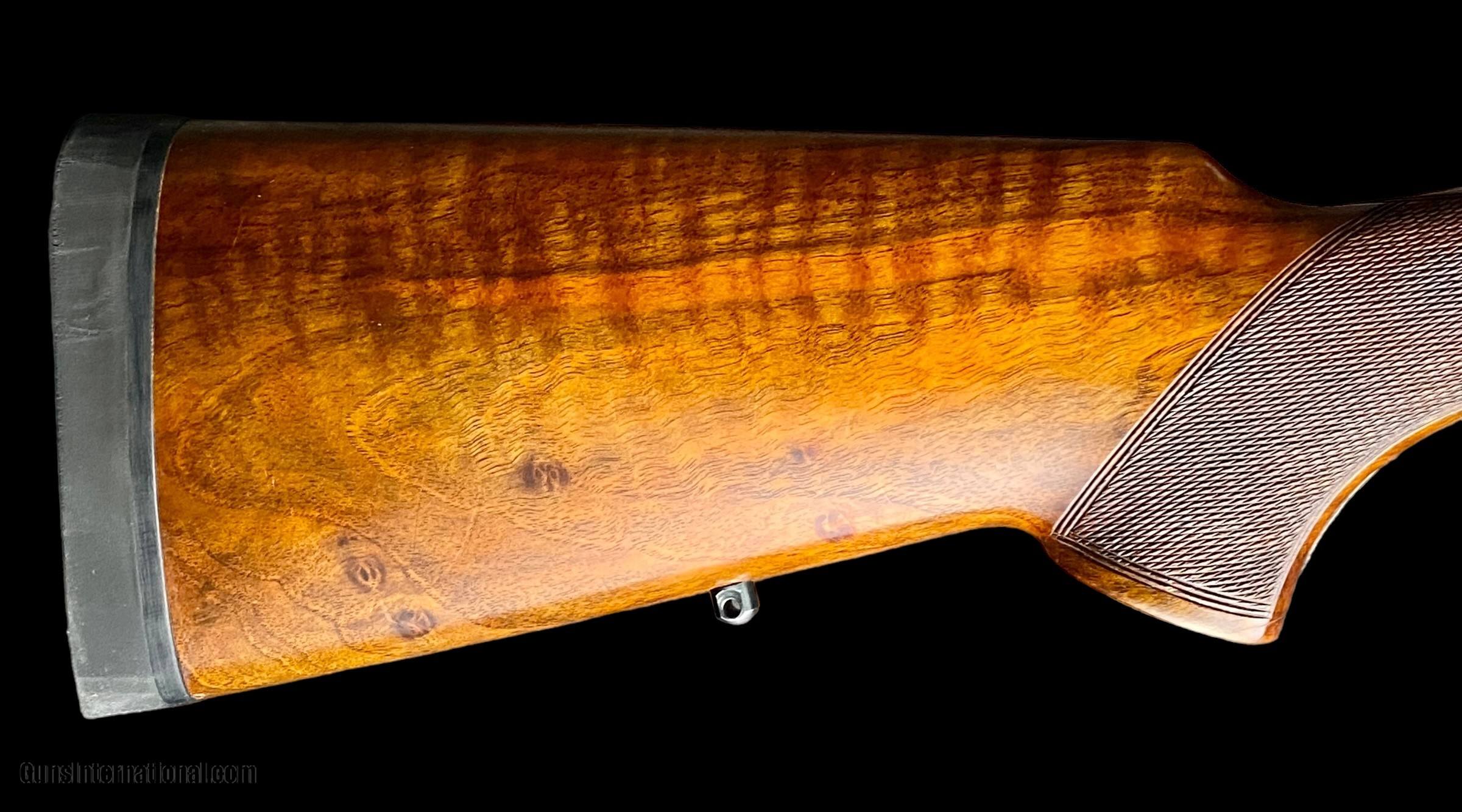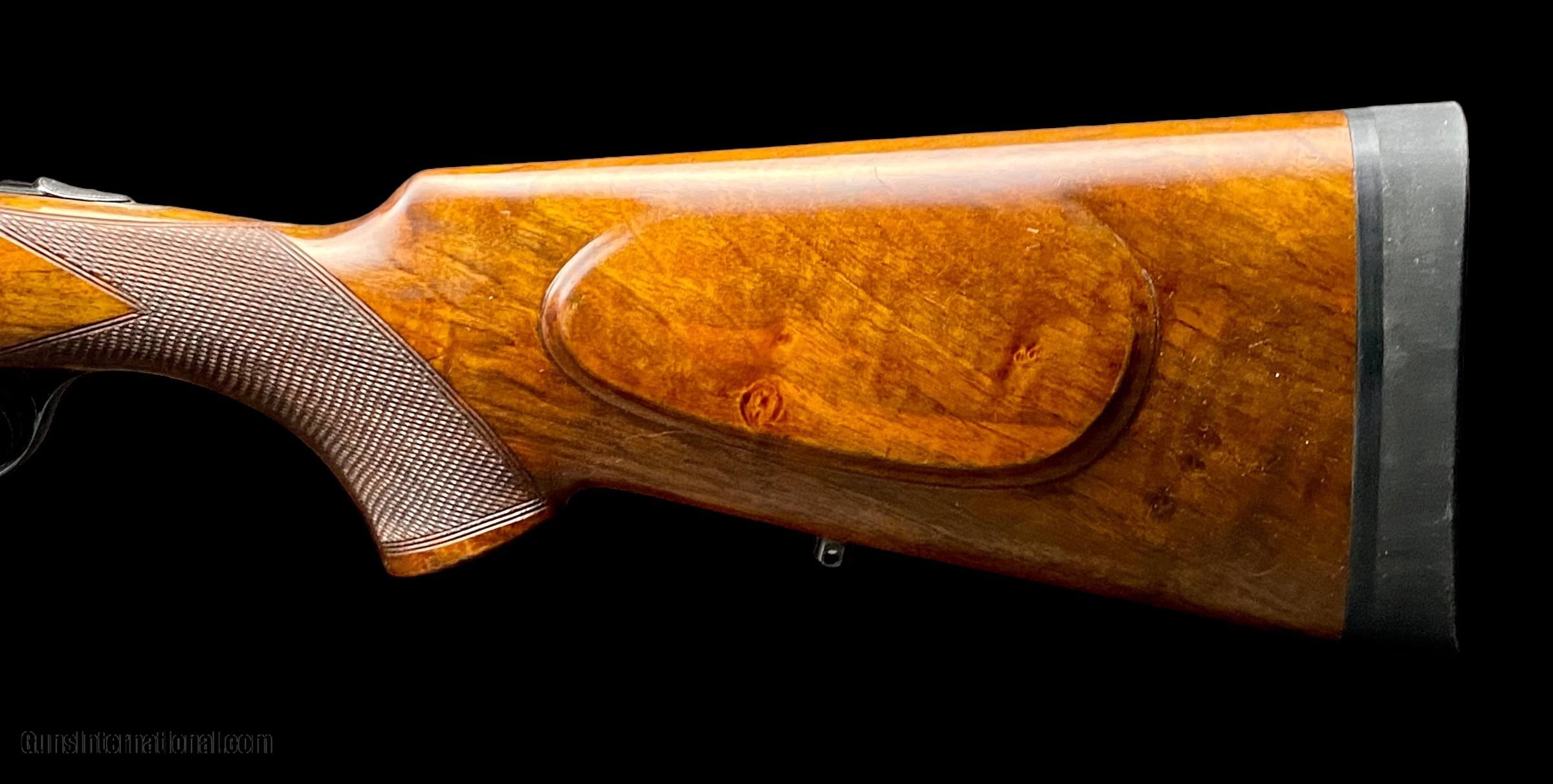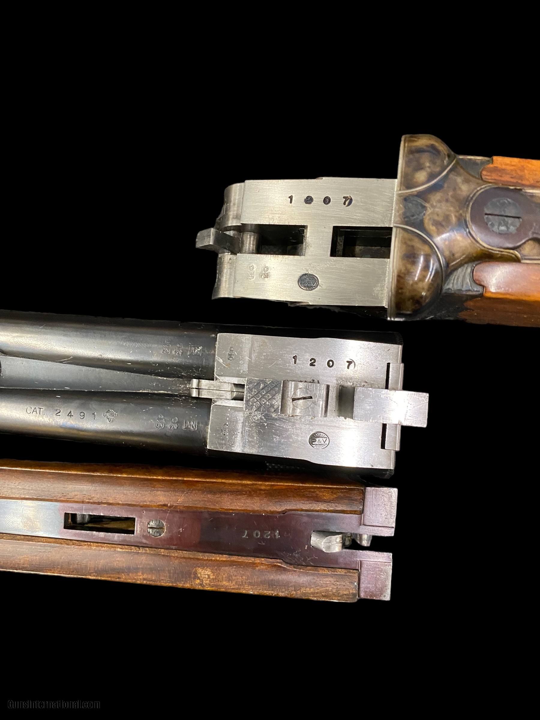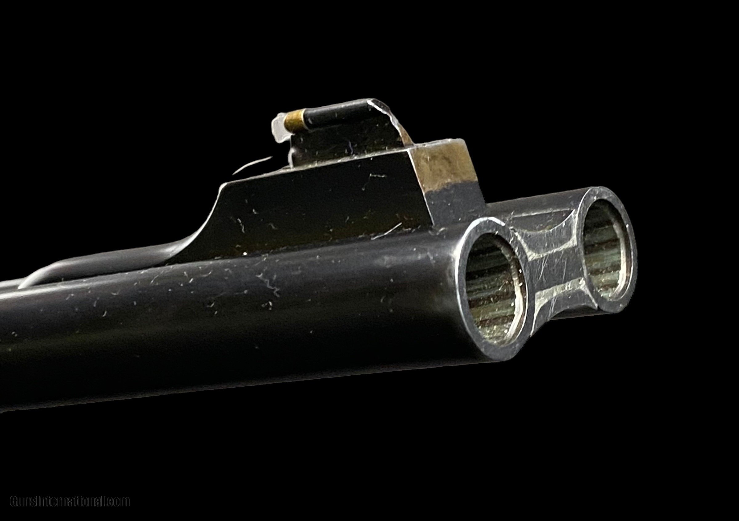 Description: PERUGINI & VISINI - ITALY WITH CASE AND SCOPE - SN. 1207. Cal. 9.3x74R. Built in 1985 with 21-3/4° Mono-bloc construction Bbls that have raised quarter rib set up for claw mount scope and fixed rear and front blade sight. Polish bbl flats with SN, makers proof and proof date "AN° 1985 ahead of flats. Bottom of right tube with small import mark "WILLIAM LARKIN MOORE & CO°. Bottom rib with factory sling swivel attached 8-3/4° from muzzle. Splinter forearm with blued and lightly engraved Deeley latch release is checkered in point pattern, has SN stamped on interior iron and engraved screw heads, Scalloped case colour hardened boxock receiver is nicely line-border engraved with floral engraved screw heads, has single bead on fences. Trigger plate engraved "PERUGINI & VISINI & CO. / NUVOLERA-BRESCIA". Blued rolled edge trigger guard with line border engraving Double triggers, Auto ejectors and non-auto safety. Top lever and salty slide are blued, top tang engraved "SIGURA" in front of slide. The lightly figured flat knob pistol grip buttstock is checkered in 2 point pattern through the wrist, has leaded check piece on left side, mount for sling swivel on toeline, and terminates with a black Decelerator pad. LOP: 14-3/16 Leupold Vari-XIII 1.5 x 5 claw mount scope. Factory tan canvas and brown leather case with makers trade label on top. There is an extra 3/8° buttpad with screws in the case. WEIGHT: 8lls. 7oz. CONDITION: Excellent as field used. Bris with about 97% of their original bibed with some beginning toning at muzzles and light field wear. Forearm is excellent with nearly all of its factory original finish remaining and scattered light impressions. Action with more than 97% of its bold original case color showing high point edge wear and beginning toning at back of top tang, Trigger guard with more than 97% of its beautiful original blue. Buttstock is very good to excellent with numerous superficial impressions from carry, most noticeable on right side less so on left and retains about 95% of its original finish. 'There is a very tight beginning grain separation at top tang which is almost imperceptable Pads are still supple. Optics are clear. Mechanics are crisp. Case is very good with staining and beginning losses to interior. GENTLEMEN, THIS IS A VERY NICE DOUBLE RIFLE FROM A RESPECTED ITALIAN MAKER. NICE SAFARI BIG-GAME GUN. FFL REQUIRED FLAT $100 S/H/I CARD FEE APPLIES SOLD Rifle Caliber: 9.3x74mmR Manufacturer: PERUGINI & VISINI Model: DOUBLE RIFLE Ejectors: YES Condition: EXC Metal Condition: EXC Wood Condition: EXC Bore Condition: EXC Action: BLE Triggers: DOUBLE |