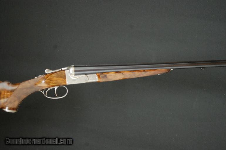 Description: Perugini & Visini, SxS, 2 barrel set, 20 ga., 29” Barrel, M/F & .375 H&H, 25 1/2”, double trigger, pistol grip, cheek piece. Pad, long top strap, sculptured box lock frame, scroll and floral engraving, magnificent game scene on bottom of a Leopard in a tree, 4 leaf express sight, beautifully made, unfired and new, in makers case, perfectly proportioned and balanced with the rifle or shotgun barrels, a great item. 14 ¾” x 1 3/8” x 2 ½” 7lbs. 11oz $47,000 SOLD |