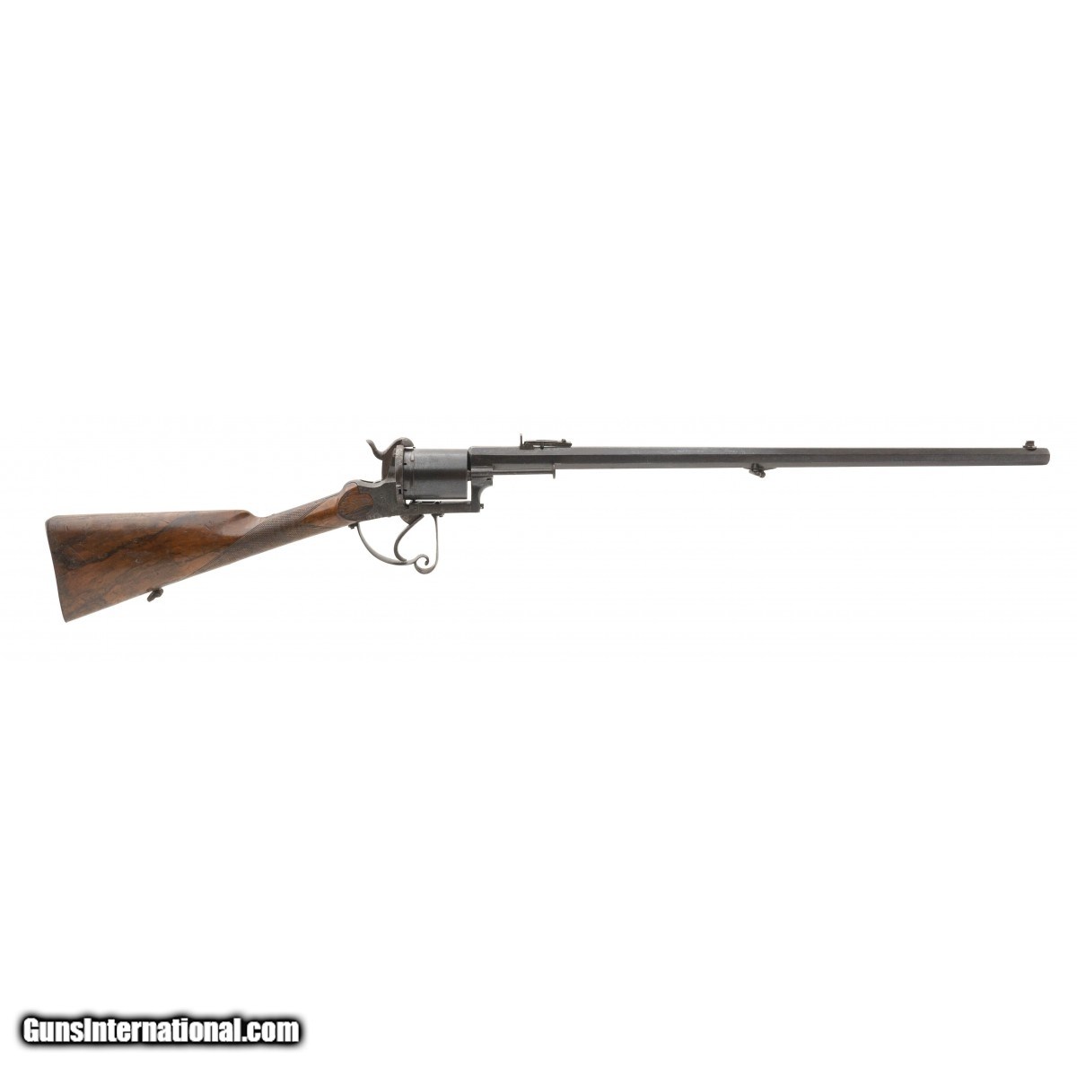 These unusual 15mm Belgian six-shot revolving pinfire rifles are rarely seen in the U.S.. The overall length is approx. 42"". The 25"" octagon barrel has a very good bore with bright rifling and light frosting in the grooves. The barrel is equipped with a blade front sight and a folding leaf rear sight. The cylinder, with the oval ELG proof, is approx. 2 5/8"" long. The only other marking is a circular stamp (JJ?) on the right front lower frame. The rifle exhibits a pleasing smooth brown patina overall. The receiver and hammer exhibit traces of their original case coloring. The buttstock is very good with usage dents and dings, especially on the left. The wrist checkering is worn but distinct. There are two flats with light decorative carving where the stock joins the receiver. The single action cocks and indexes correctly. The cylinder can also be rotated (but the action not cocked) by a trigger pull. If you're a pinfire collector or collector of large bore European rifles, this rifle is for you!