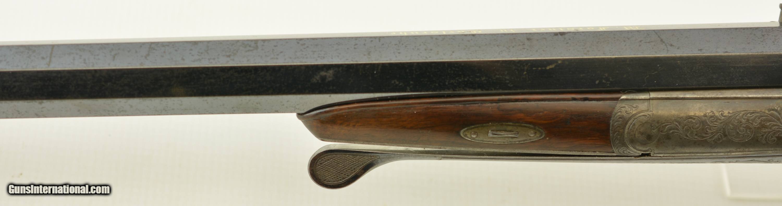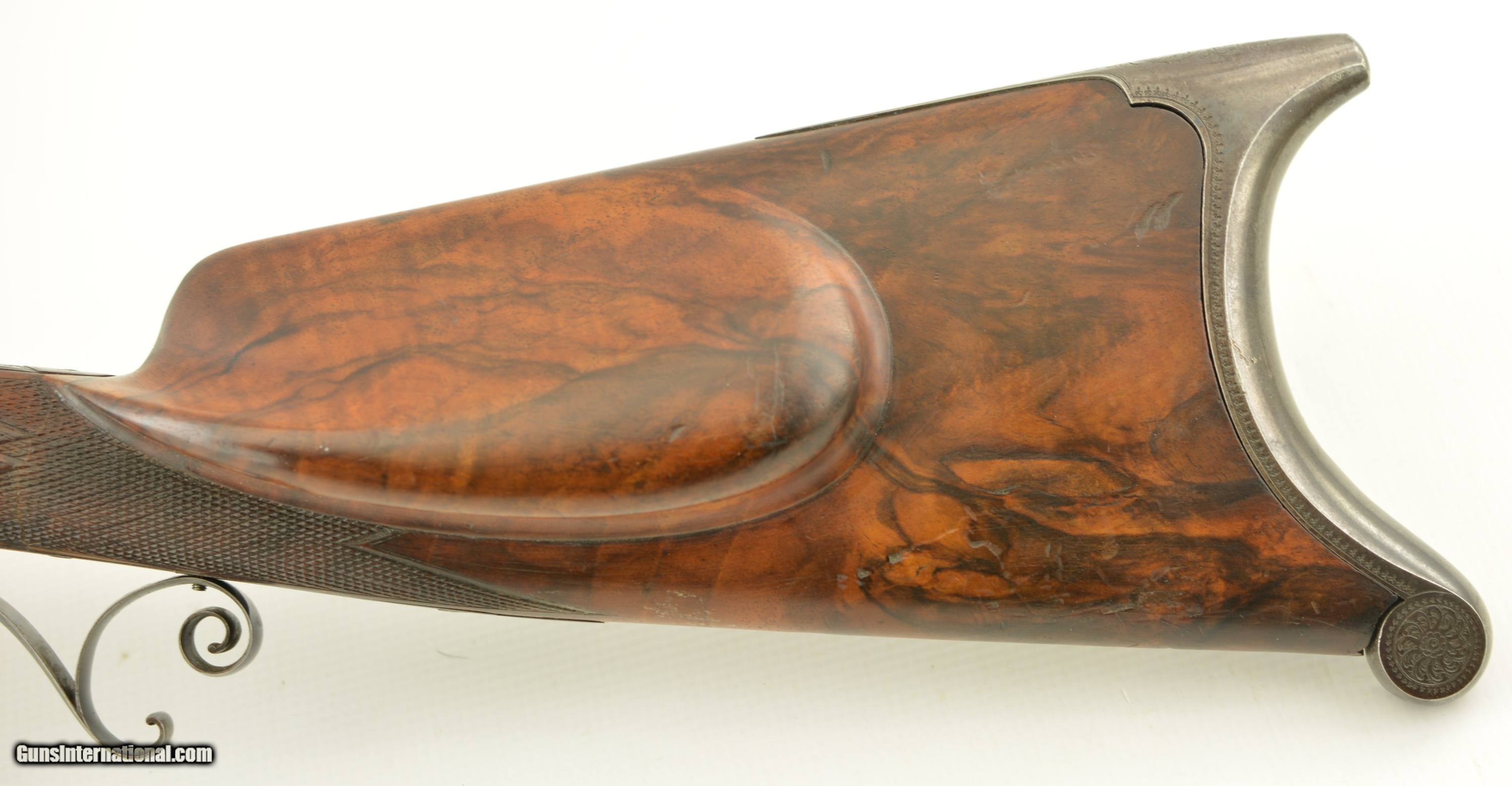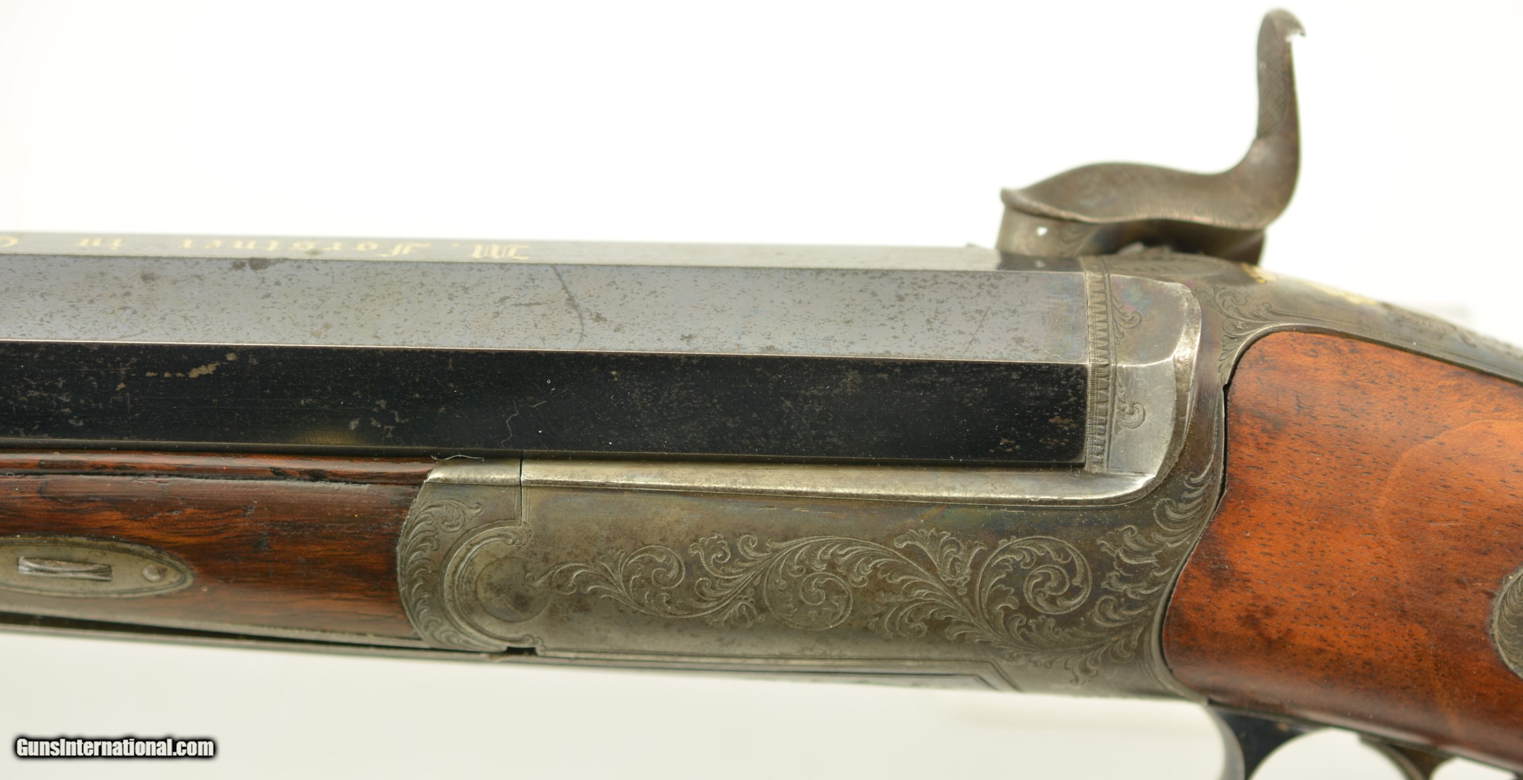 Description: NSN, 11mm Pinfire, 28 1/4" barrel with an excellent, bright bore. This is a beautifully crafted rifle that retains 85-90% of the original brilliant blue on the barrel that has developed some subtle, plum-brown freckling, heaviest at the muzzle, as well as some trace silvering along a few of the edges. The maker's name is inlaid in large Gothic letters along the top: “M. Forstner in Carlsruhe." The frame has a back-action lock with delicate floral scrollwork engraving, as well as the complete maker's name inlaid in gold around the base of the hammer: “FORSTNER-KLINGLER, CARLSRUHE" (a Carlsruhe maker and retailer in operation ca. 1865. The original front sight is still present, but the rear sight is not included. The short forend has a small, wedge-fastened piece of walnut, but is mostly taken up with the long opening lever. The buttstock has beautifully figured Circassian walnut with contoured cheek-piece, and robust metal buttplate with large engraved disk finial at at the toe. Skillfully repaired breaks are present at the wrist and the buttplate stands proud of the wood in spots. The barrel lock-up is solid, and the action functions flawlessly. There is an armorial bearing inlaid in gold on the top of the wrist that shows a canted shield emblazoned with a goose (or swan) rampant, tilting helm with short mantling, and a crest consisting of a dragon (or serpent head) emerging from a crown. The arms are themselves surmounted by a crown with seven pearl finials (often used to denote a Freiherr or Baron in some German traditions). We have not been able to definitively identify the arms, however they do bear a more than passing resemblance (especially the crest on the helm) to those belonging to the Göler von Ravensburg family. This is further supported by their ancestral seat being in Sulzfeld, a town close to Karlsruhe where the rifle was made, however there are other families that have bearings more closely matched to the design on the shield. In any event, this is a rifle of high quality, made for an important person, and remains in excellent overall condition. Antique SOLD Manufacturer: Forstner & Klingler Model: Schuetzen Caliber Info: 11mm Gauge Info: 11mm |