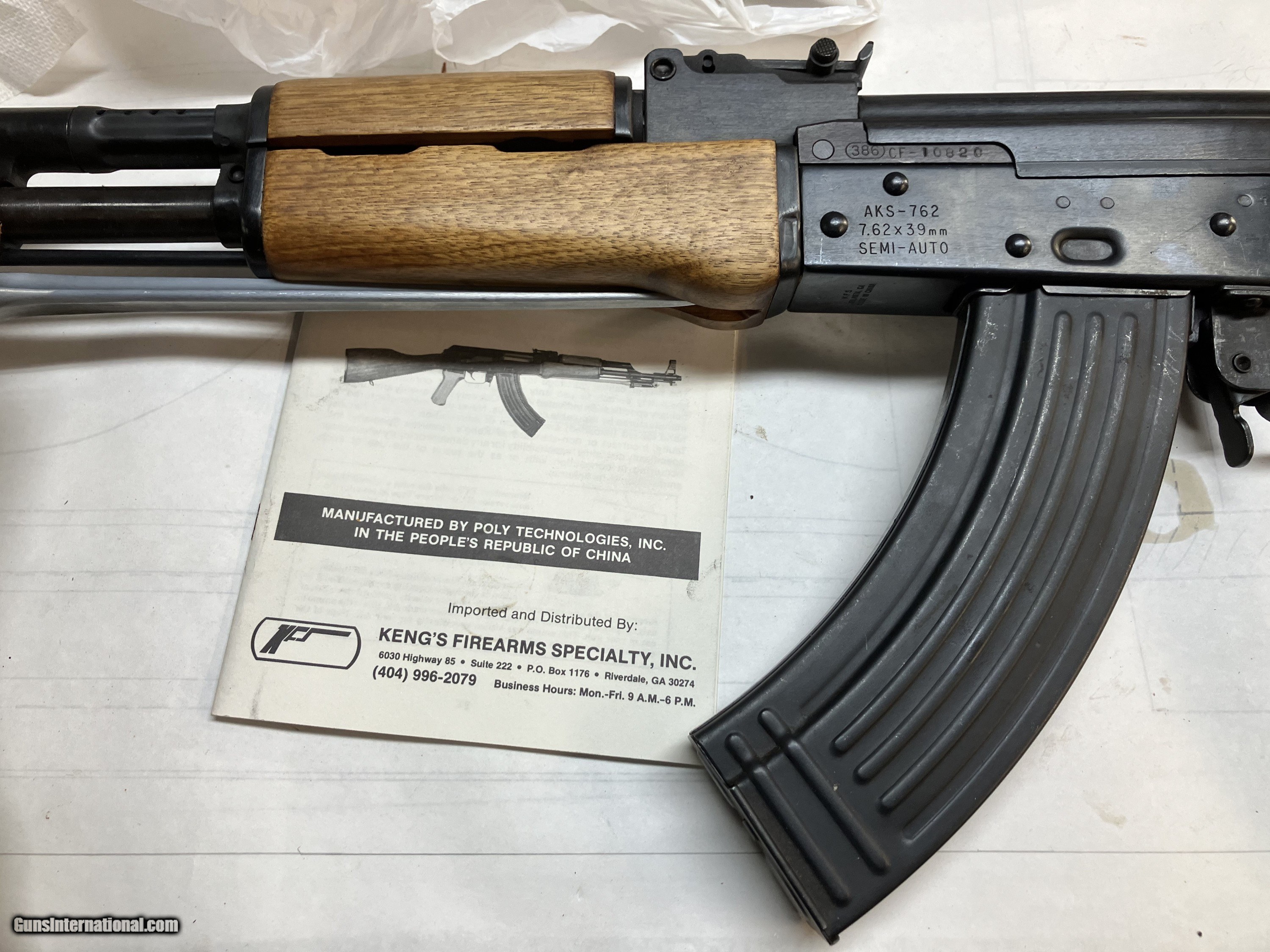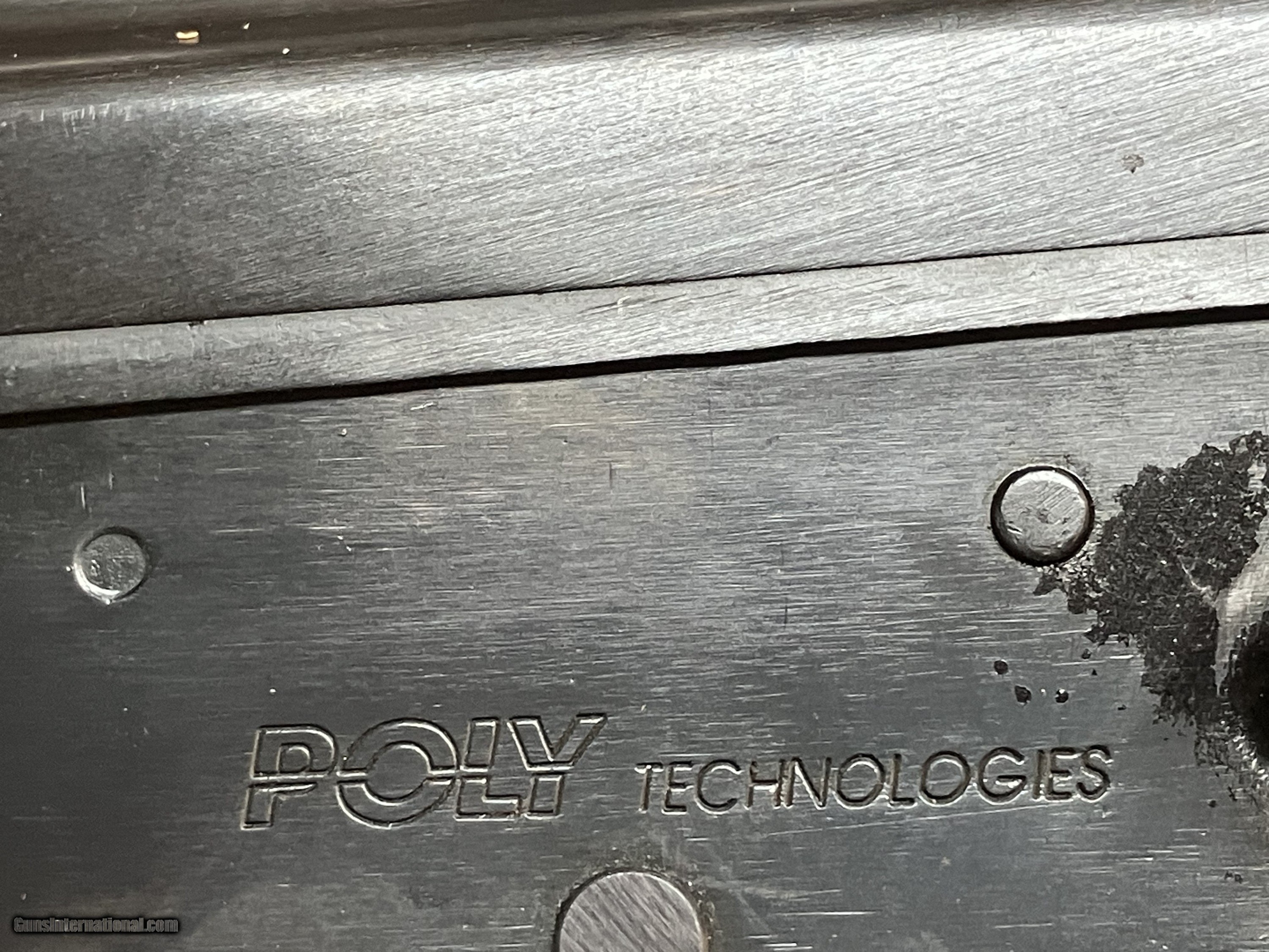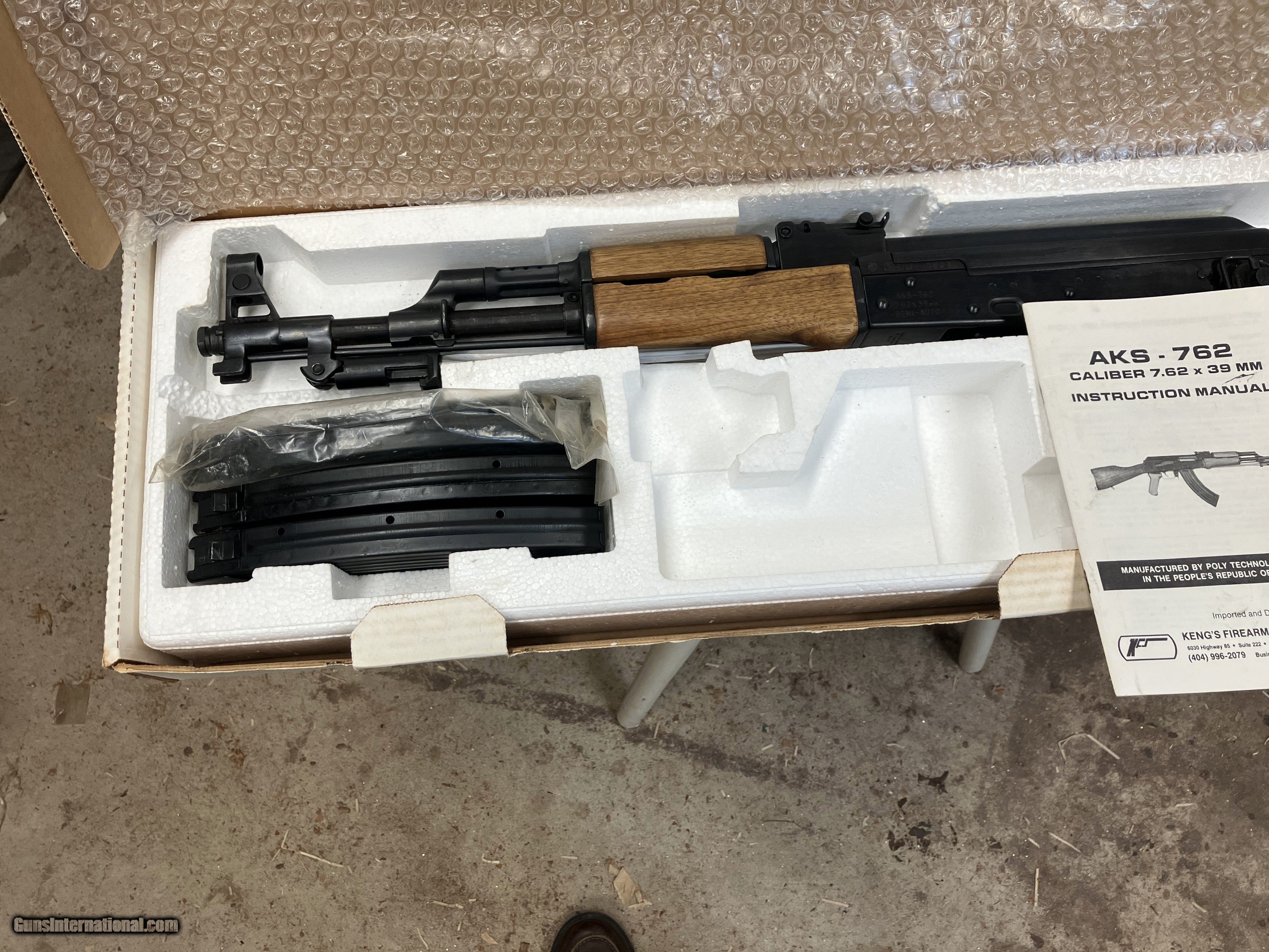 Description: New price Poly Teck AKS-762 7.62x39. Made in China and imported by KFS of Atlanta, GA, serial 10820 has a 16-inch barrel. Features include double under-folder stock, checkered grip and canvas/leather sling. MAGAZINES: three 30-round, one marked "Poly" and China are included. INCLUSIONS: Operator's Manual and cleaning rod kit are included. Orginal box with matching serial number. I am the orginal owner. It has only been shot on three occasions. No more than 60 rounds fired. It has been in a dehumidfied vault for over 35 years. buyer pays shipping and insurance added new photo. There was some finish issues near the stock release button. I was able to remove most of this just with my fingernail. I am not sure what the issue was, but it appears to be a "patch" to the finish was applied. It came this way. SOLD Rifle Caliber: 7.62x39mm Manufacturer: Poly Tech |