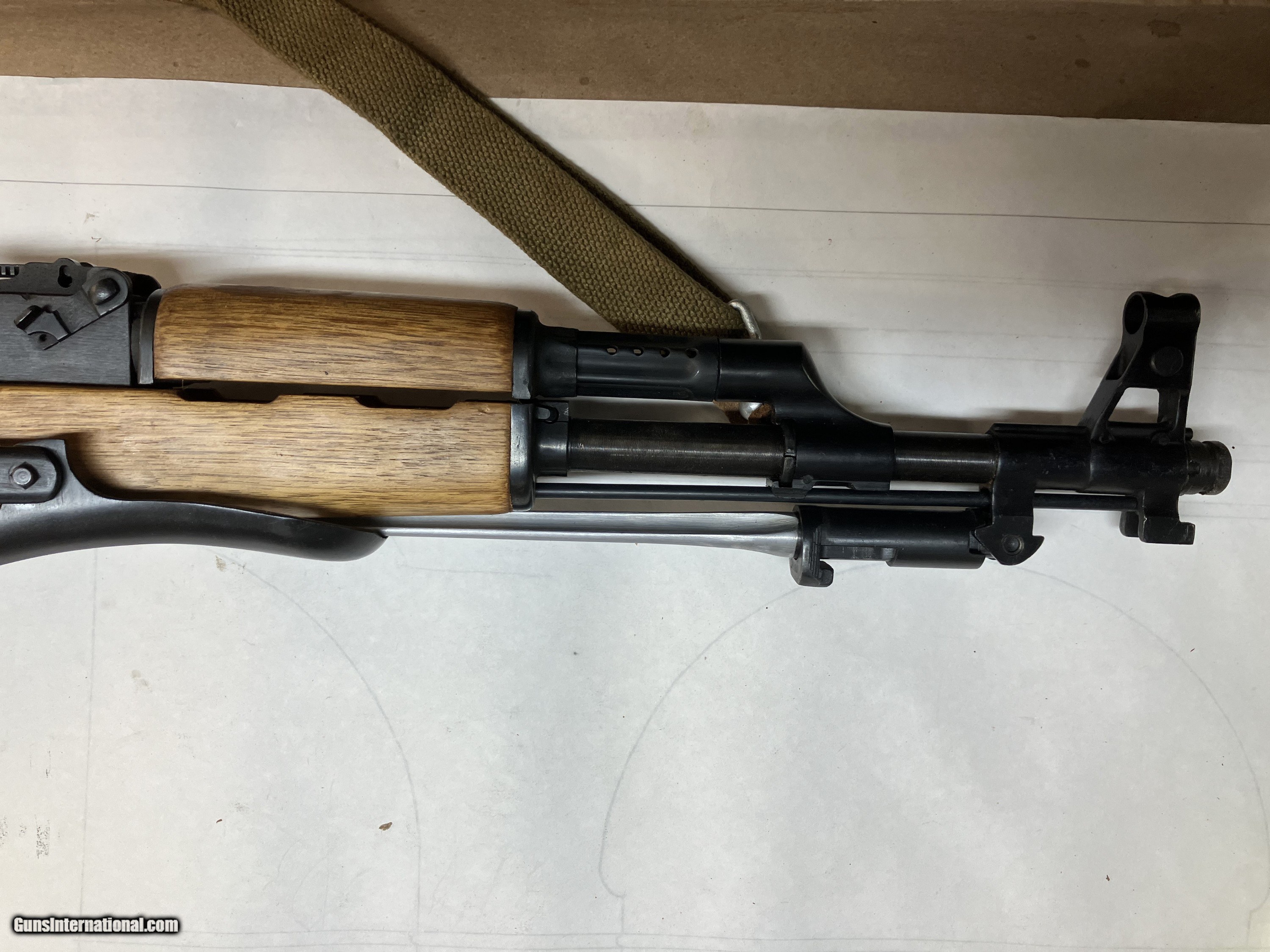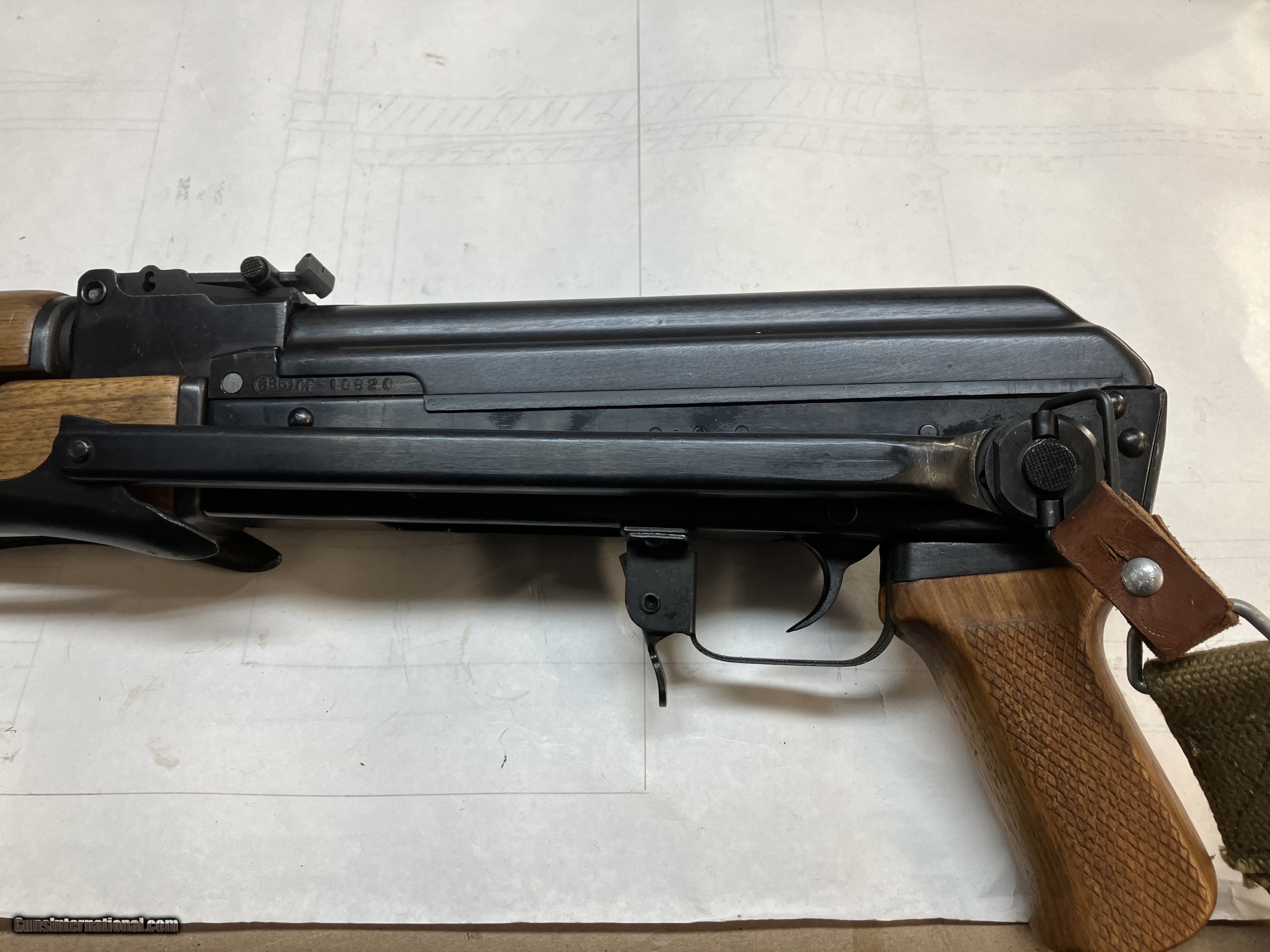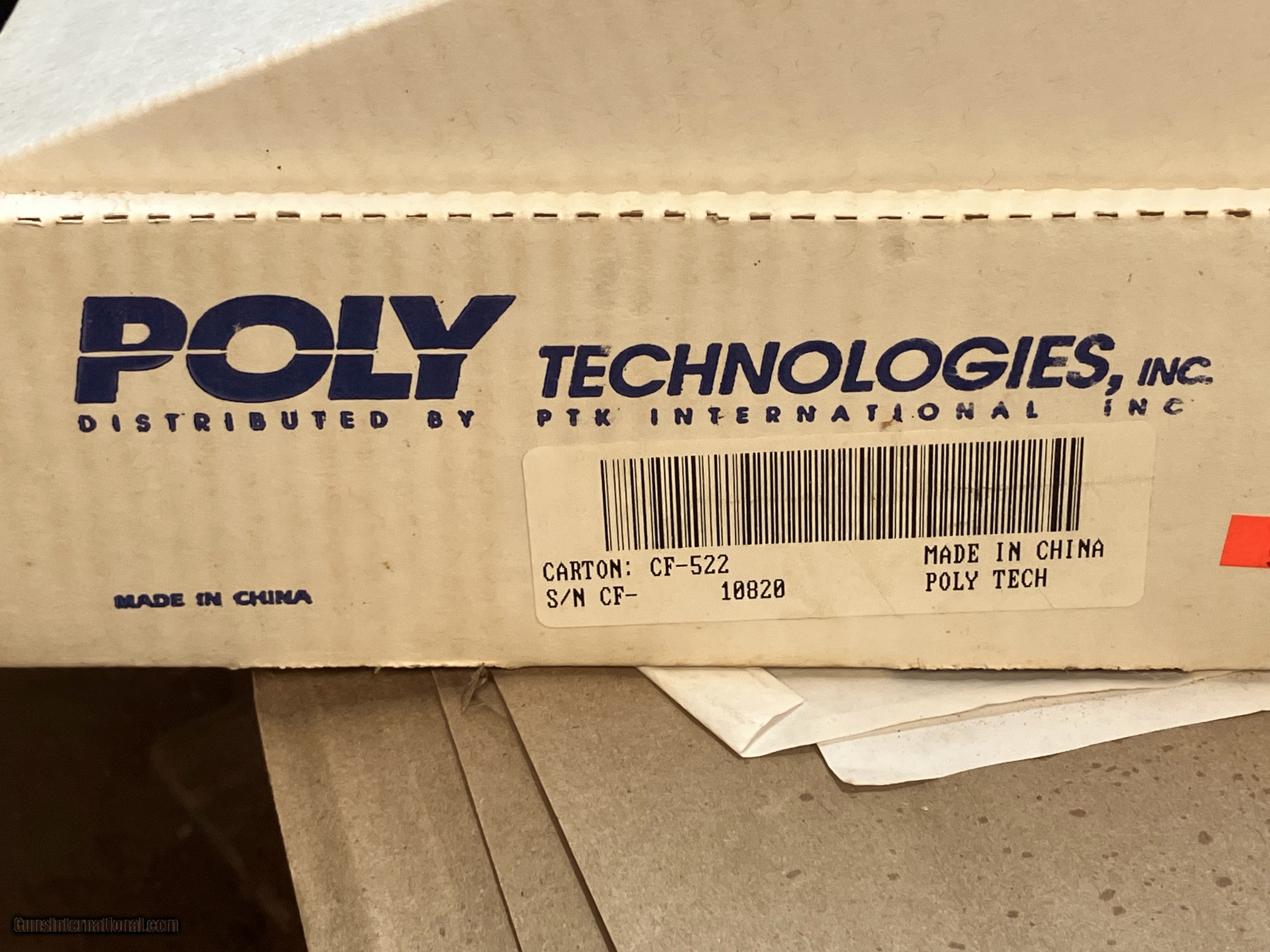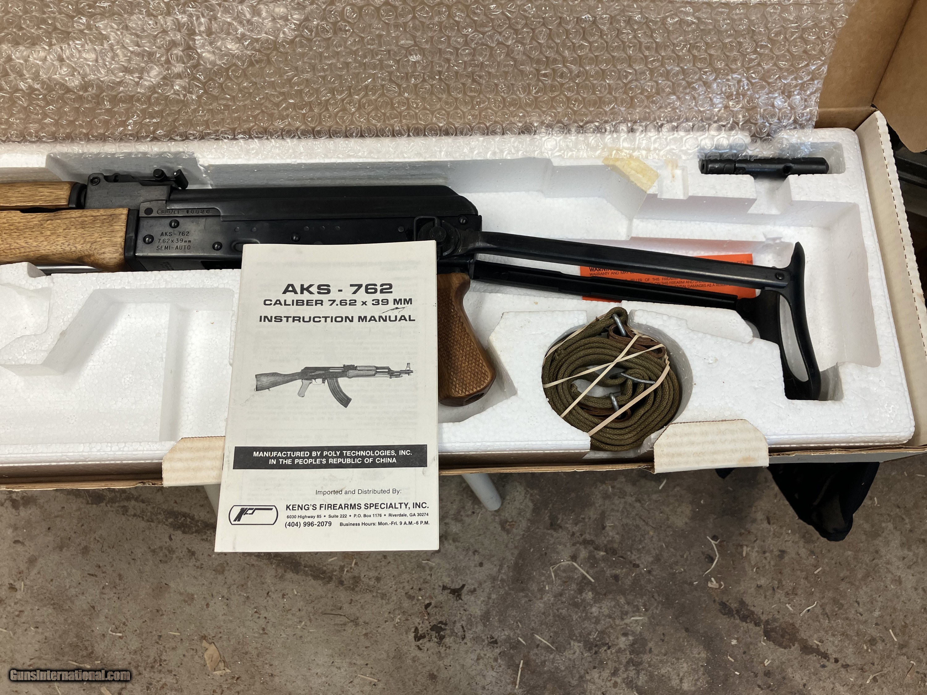 Description: New price Poly Teck AKS-762 7.62x39. Made in China and imported by KFS of Atlanta, GA, serial 10820 has a 16-inch barrel. Features include double under-folder stock, checkered grip and canvas/leather sling. MAGAZINES: three 30-round, one marked "Poly" and China are included. INCLUSIONS: Operator's Manual and cleaning rod kit are included. Orginal box with matching serial number. I am the orginal owner. It has only been shot on three occasions. No more than 60 rounds fired. It has been in a dehumidfied vault for over 35 years. buyer pays shipping and insurance added new photo. There was some finish issues near the stock release button. I was able to remove most of this just with my fingernail. I am not sure what the issue was, but it appears to be a "patch" to the finish was applied. It came this way. SOLD Rifle Caliber: 7.62x39mm Manufacturer: Poly Tech |