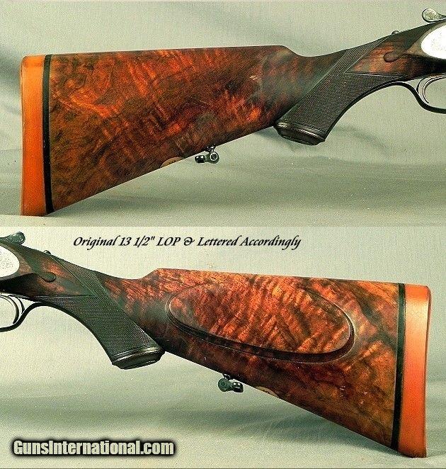 Description: #23595, J. Purdey & Sons, Audley House, South Audley Street, London, England: A Purdey Bar Action Sidelock Ejector 400 3" Nitro Ordered September 29, 1928 by Sir Shri Maharana Bhupal Singh Bahadur KCIE the ruler of the Indian princely state of Udaipur (or Mewar), It is with 25 1/2" Ejector Chopper Lump Whitworth Steel Barrels, The barrels with a rib extension third bite, Full rib with 1 standing & 1 folding rear sights, Sideclip action body, Bushed strikers, London Nitro proved at 47 Cordite with a 230 grain bullet, Double triggers, Engraved steel grip cap, Shadow line cheekpiece, 13 1/2" LOP (Lettered) over a 7/8" Silvers (Lettered) pad, Original weight of 8 lbs. (Lettered) , 90% coverage of Purdey's classic rose & scroll engraving done by either Warren, Woolman or Kell, The barrels retain 99% blue and have been very nicely reblacked, This piece has 10% case colors remaining with a very nice patina, The butt & forend are as solid as they were 89 years ago, The stock finish remains at 85%, The checkering is at 90%, The Gold oval in the stock line has "B. S." (Bhupal Singh), The bores are virtually like new; Brass, dies and bullets available. The whole is cased in the original brass cornered oak & leather trunk that remains in excellent condition, it has spare strikers, spare front sight, original cleaning gear, turnscrews, snap caps and original trade labels. This is a very nice 89-year-old Classic Purdey package that is excellent with bores like new. Bhupal Singh was a small man and the original length of pull was ordered accordingly. //////////////////////////////////// Bhupal Singh was born in 1884, a year before the accession of his father Fateh Singh to the throne of Mewar and Udaipur as Maharana. Maharana Bhupal Singh was crippled from his waist down at a relatively young age. After the independence and partition of British India in 1947, Singh was one of the first of the Indian princes to sign an Instrument of Accession to the new Dominion of India, and on April 18, 1948 he became Rajpramukh of Rajasthan, succeeding Sir Bhim Singh, The Maharaja of Kotah. One of Bhopal Singh's palaces was Jag Niwas, on an island in Lake Pichola, since used for the filming of several films, including a James Bond film. SOLD Curio/Relic: Yes |