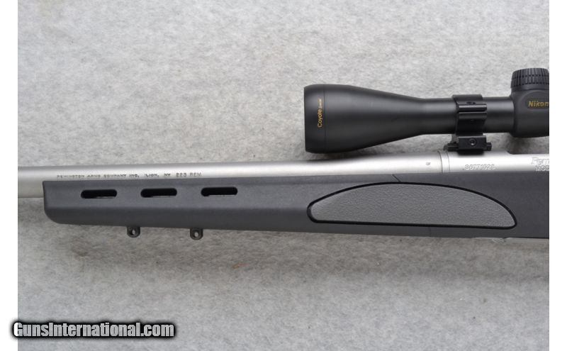 Description: SOLD Caliber Info: .223 Rem. Chambers: Hinged floorplate. Metal Condition: Excellent with very minor handling marks and a couple of very minor freckling spots. Bore Condition: Excellent. Barrels: 26 inch heavy satin stainless steel. Triggers: Adjustable. Stock: Textured grey rubber grip in black polymer pistol grip. Raised cheekpiece. Knurled bolt handle. Stock Dimensions: LOP 13 1/4 inches. Fore End: Textured grey rubber grip in a vented black polymer beavertail style. Butt Pad: Remington SuperCell rubber recoil pad. Weight: 9 lbs. 3 oz. with scope mounted. Sights: Nikon Coyote Special 3-9x40 Scope. No iron sights. Item Location: Richfield, WI |