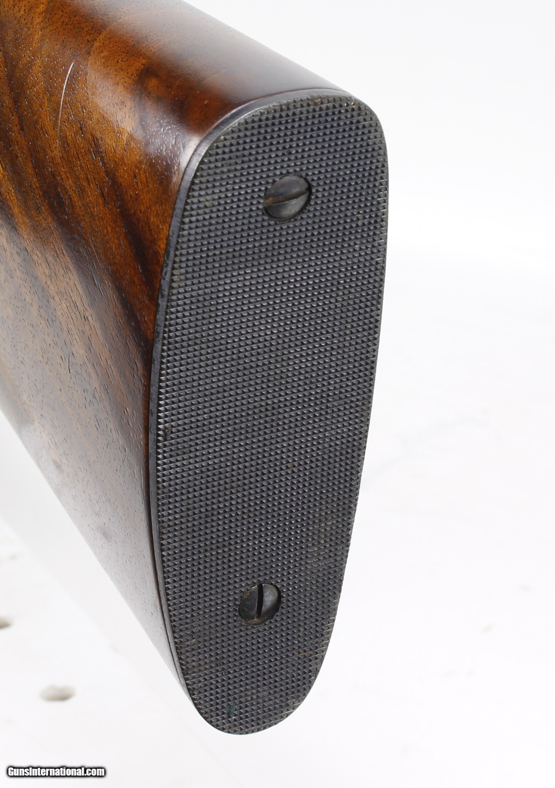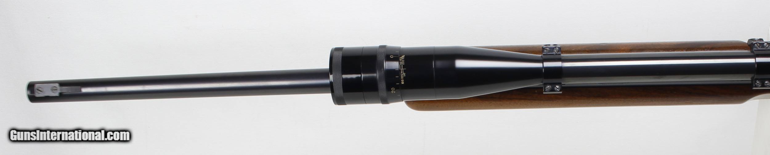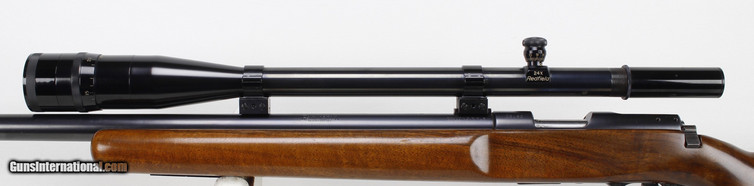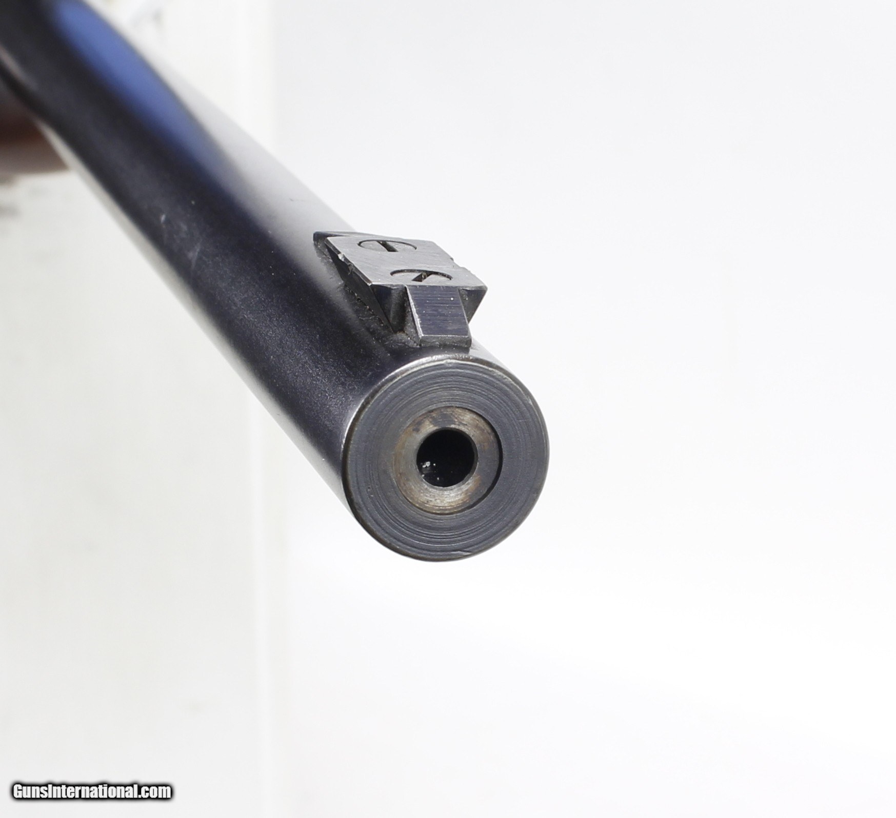 Description: Remington Model 37 Range Master Benchrest Rifle in .22LR. SN #03160. Mfg. in 1941. LOP 13 1/2". 28" Free Floating Heavy Barrel with an excellent bright bore with defined lands and grooves. The blued metal finish is in very good condition, rated at 95%. The solid 1 piece smooth Walnut stock is also in very good condition, rated at 95%. Adjustable trigger. Includes a mounted Redfield 24x Target Scope, BRIGHT VERY GOOD, PK barrel date code. Weight 15 lbs. Trigger Pull 1 3/4 lbs. Ships to Lower 48 W/ Insurance $50.00. SOLD Rifle Caliber: .22 Long Rifle Manufacturer: Remington Model: 37 Serial Number: 03160 Barrel Length: 28 Condition: VG Metal Condition: VG Wood Condition: VG Bore Condition: Excellent LOP: 13 1/2 Manufacture Date: 1941 |