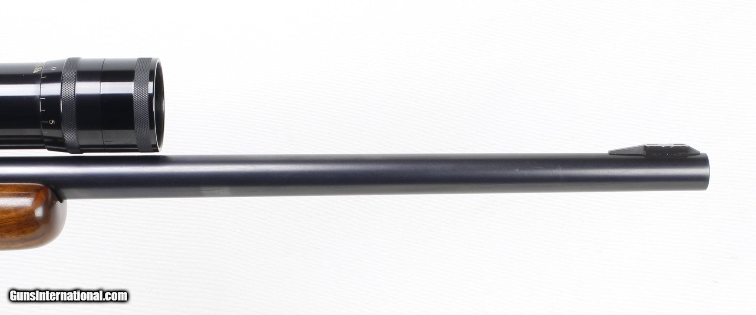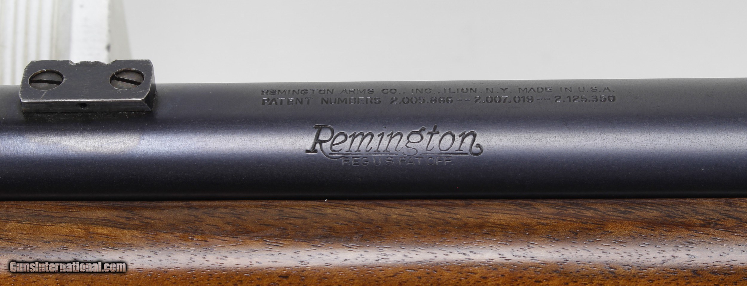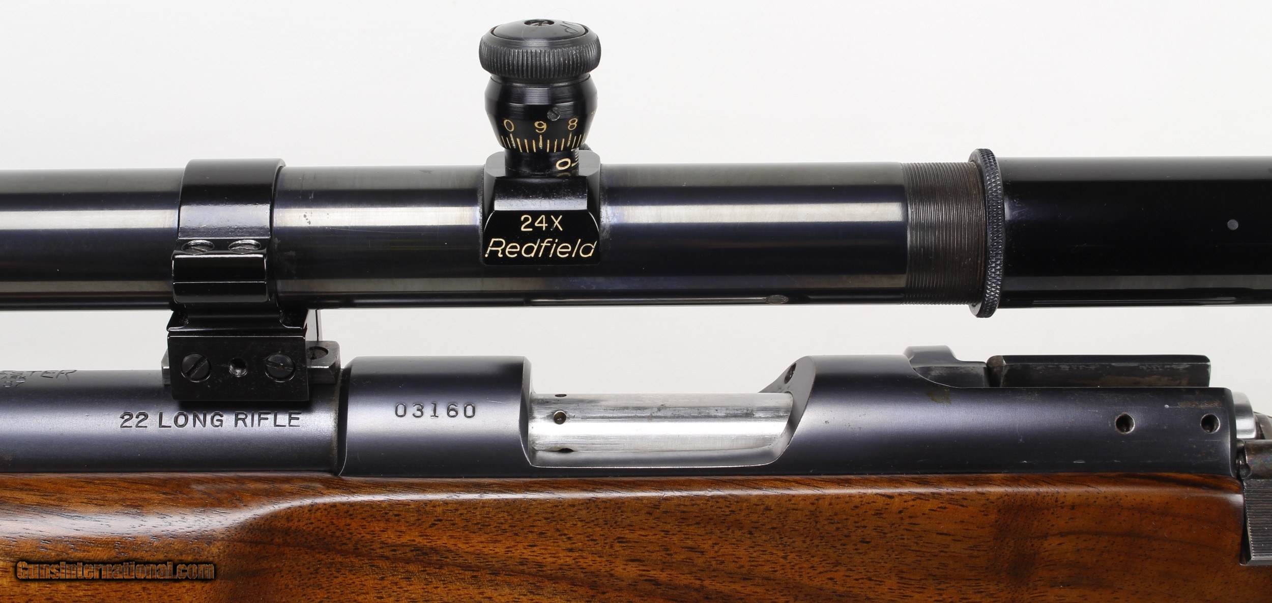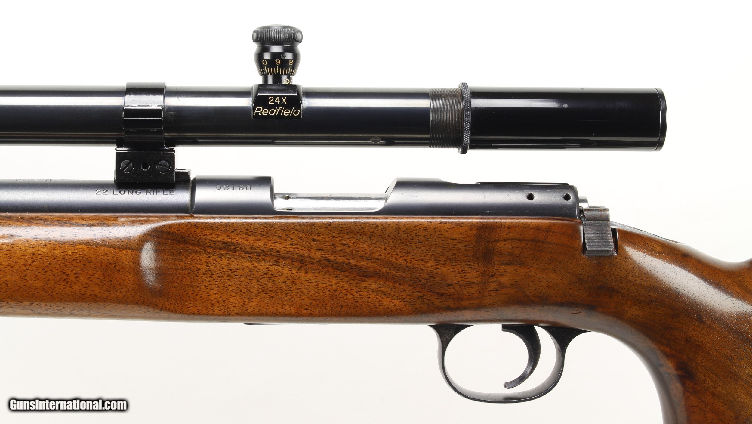Description: Remington Model 37 Range Master Benchrest Rifle in .22LR. SN #03160. Mfg. in 1941. LOP 13 1/2". 28" Free Floating Heavy Barrel with an excellent bright bore with defined lands and grooves. The blued metal finish is in very good condition, rated at 95%. The solid 1 piece smooth Walnut stock is also in very good condition, rated at 95%. Adjustable trigger. Includes a mounted Redfield 24x Target Scope, BRIGHT VERY GOOD, PK barrel date code. Weight 15 lbs. Trigger Pull 1 3/4 lbs. Ships to Lower 48 W/ Insurance $50.00. SOLD Rifle Caliber: .22 Long Rifle Manufacturer: Remington Model: 37 Serial Number: 03160 Barrel Length: 28 Condition: VG Metal Condition: VG Wood Condition: VG Bore Condition: Excellent LOP: 13 1/2 Manufacture Date: 1941 |
