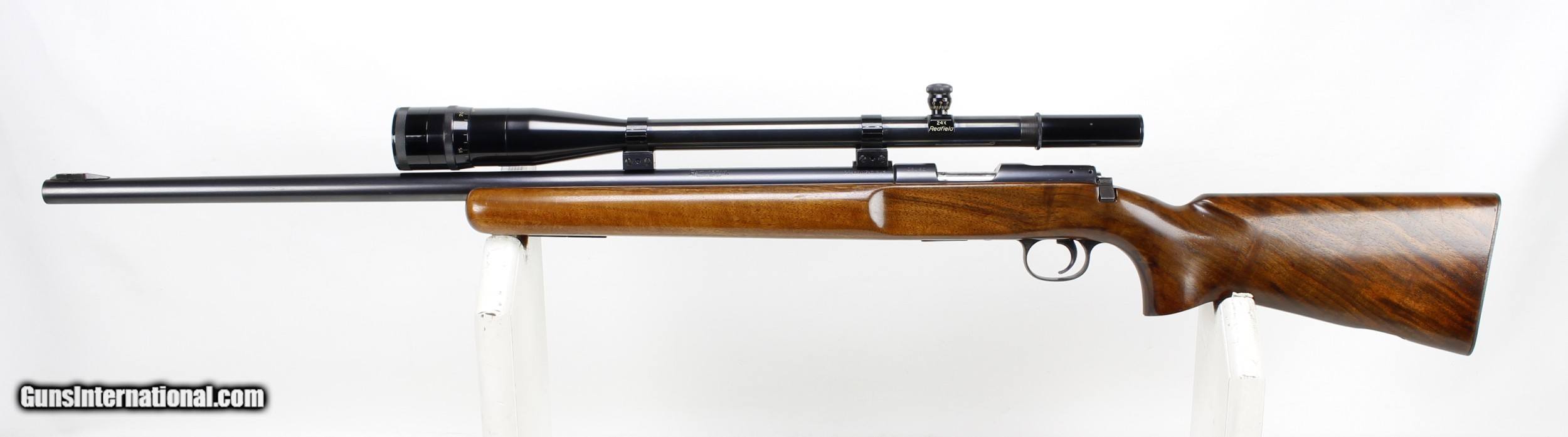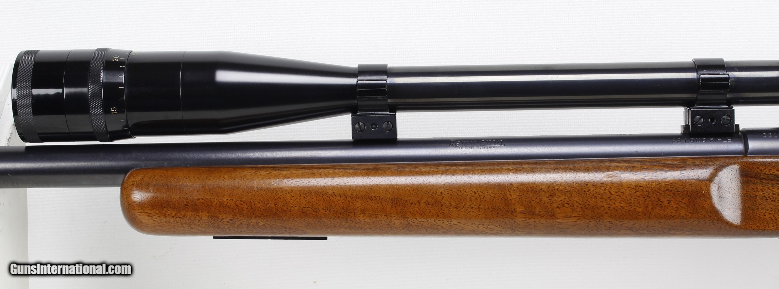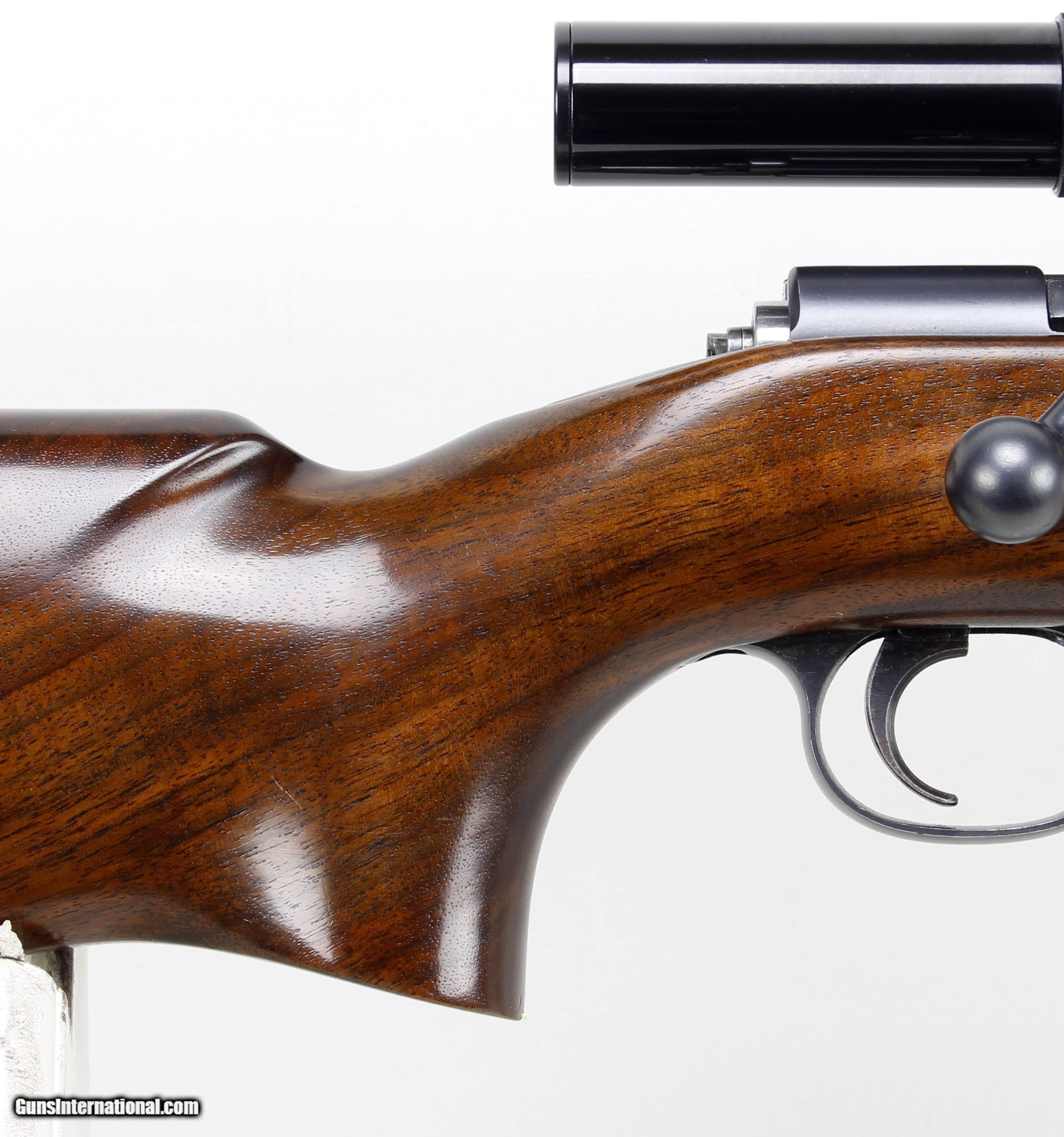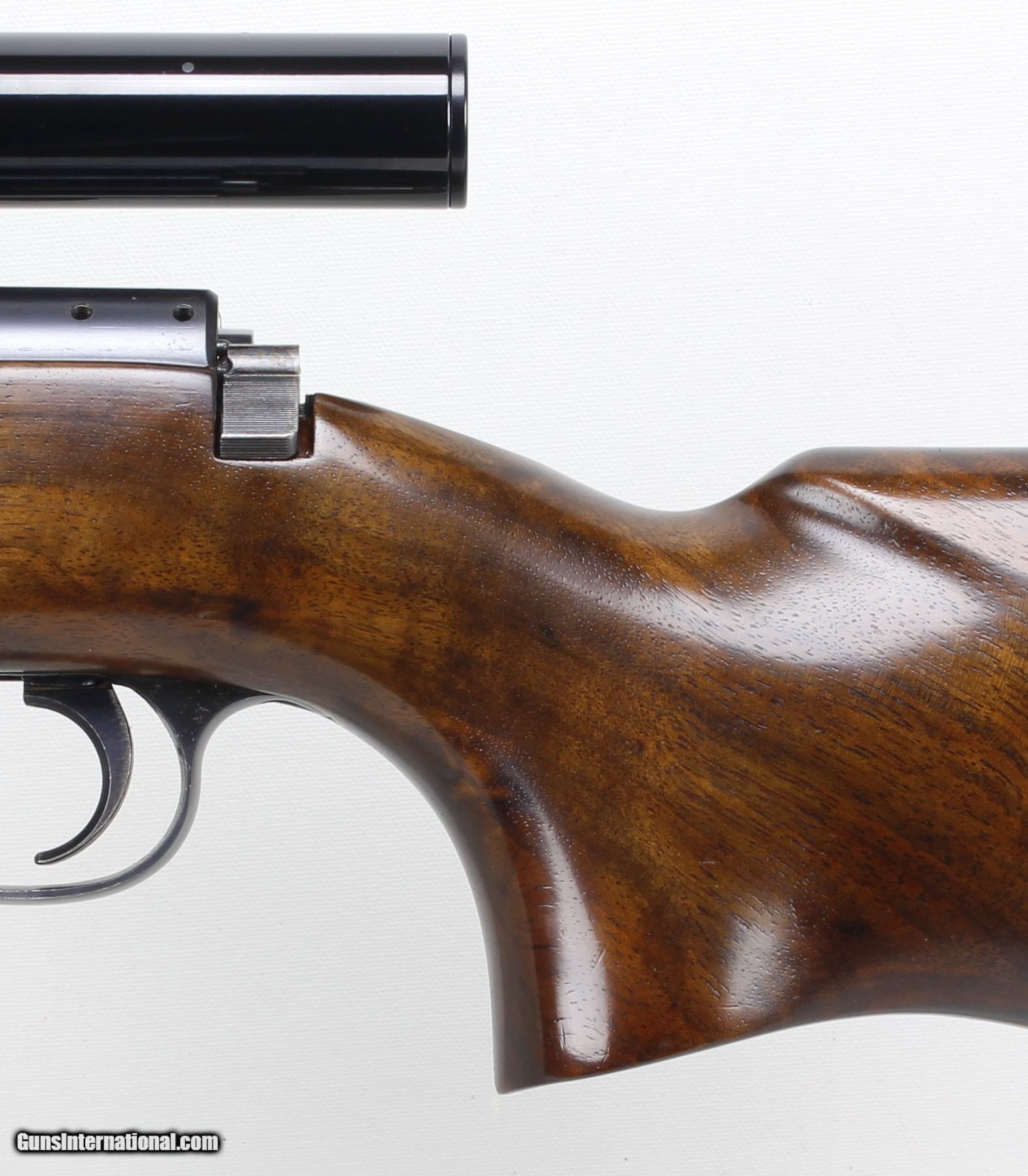 Description: Remington Model 37 Range Master Benchrest Rifle in .22LR. SN #03160. Mfg. in 1941. LOP 13 1/2". 28" Free Floating Heavy Barrel with an excellent bright bore with defined lands and grooves. The blued metal finish is in very good condition, rated at 95%. The solid 1 piece smooth Walnut stock is also in very good condition, rated at 95%. Adjustable trigger. Includes a mounted Redfield 24x Target Scope, BRIGHT VERY GOOD, PK barrel date code. Weight 15 lbs. Trigger Pull 1 3/4 lbs. Ships to Lower 48 W/ Insurance $50.00. SOLD Rifle Caliber: .22 Long Rifle Manufacturer: Remington Model: 37 Serial Number: 03160 Barrel Length: 28 Condition: VG Metal Condition: VG Wood Condition: VG Bore Condition: Excellent LOP: 13 1/2 Manufacture Date: 1941 |