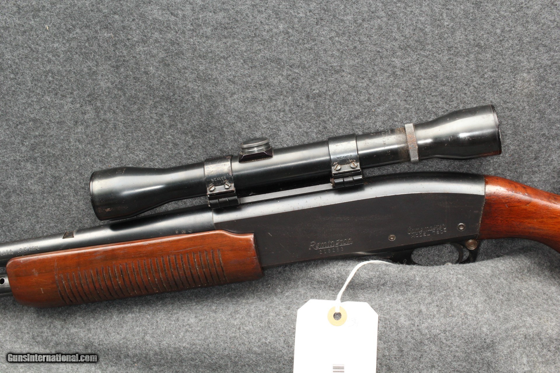 Description: 35 Remington, serial number 2182XX. 22" barrel. Overall in fair-good condition, shows moderate wear. Wood shows moderate-heavy marring and finish wear. 1 1/5" crack at right side head. Pachmayr recoil pad added. LOP to wood 13 1.4", LOP overall 14". Metal shows blue wear, rust flecking on receiver and barrel. Streaking in metal with very shallow pitting. Bore shows mild pitting mid bore. Comes with vintage Weaver 6x scope. Lenses have yellowed, relatively clear, overall in fair condition. No guarantees on scope. More photos on request. Please add $55.00 for shipping and insurance. SOLD Rifle Caliber: .35 Remington |