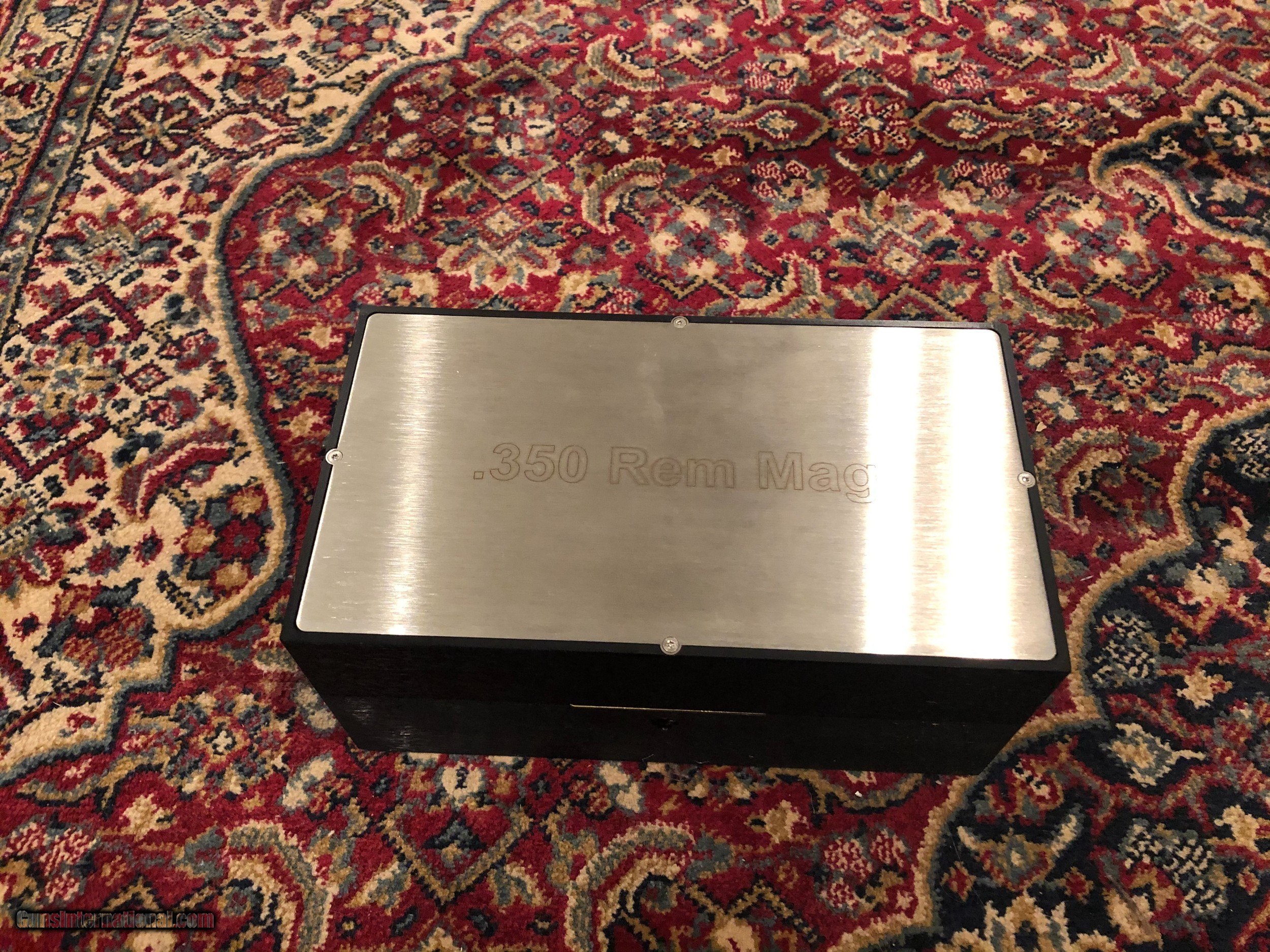 Description: SOLD PENDING FUNDS: This manufacturer possibly makes the most robust, travel-proof ammo carriers on the planet. They are precisely machined lockable metallic boxes that are custom made for each cartridge. They are more like ammo safes. The silver top is engraved .350 Rem Mag. It is in as-new, unsued condition. Holds 50 cartridges. Email is the best method of contact. Can also accept PayPal, and we always try to ship same day or next day at the latest. SOLD |