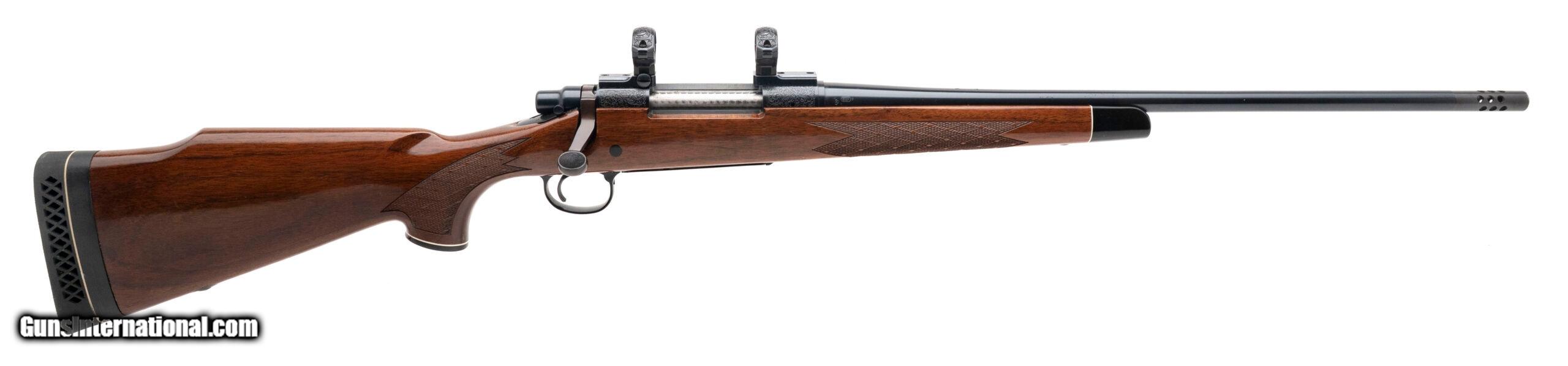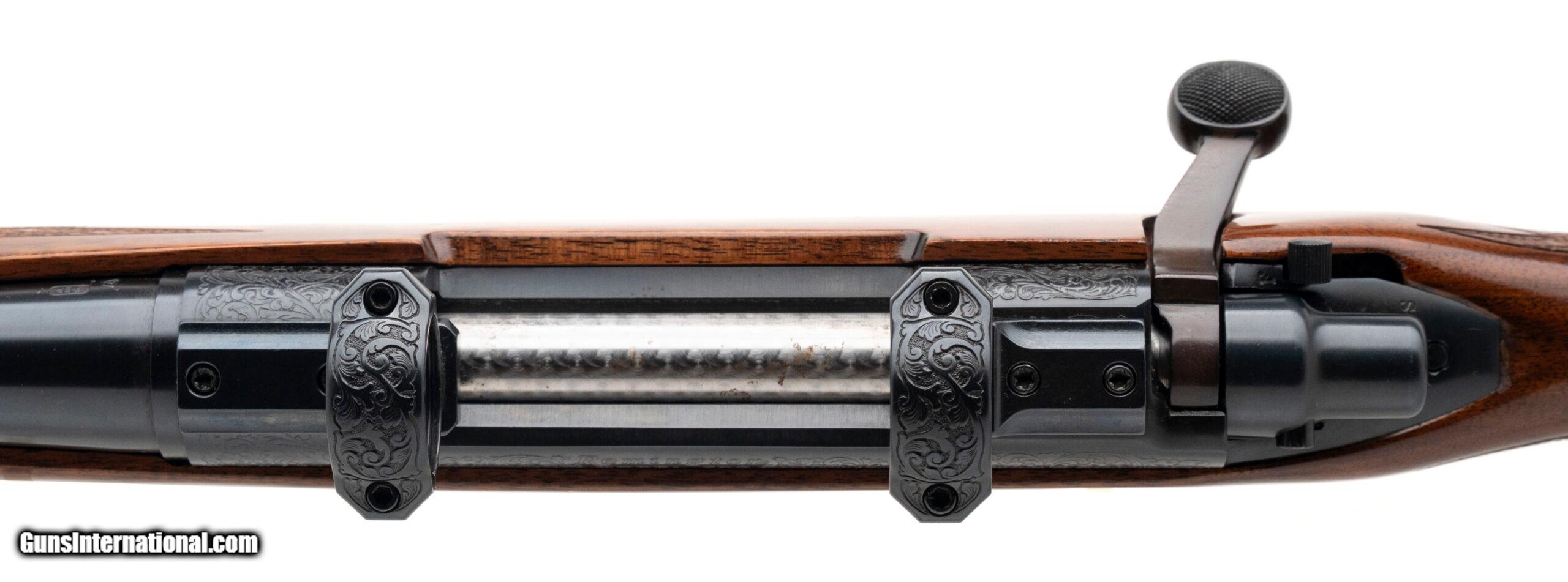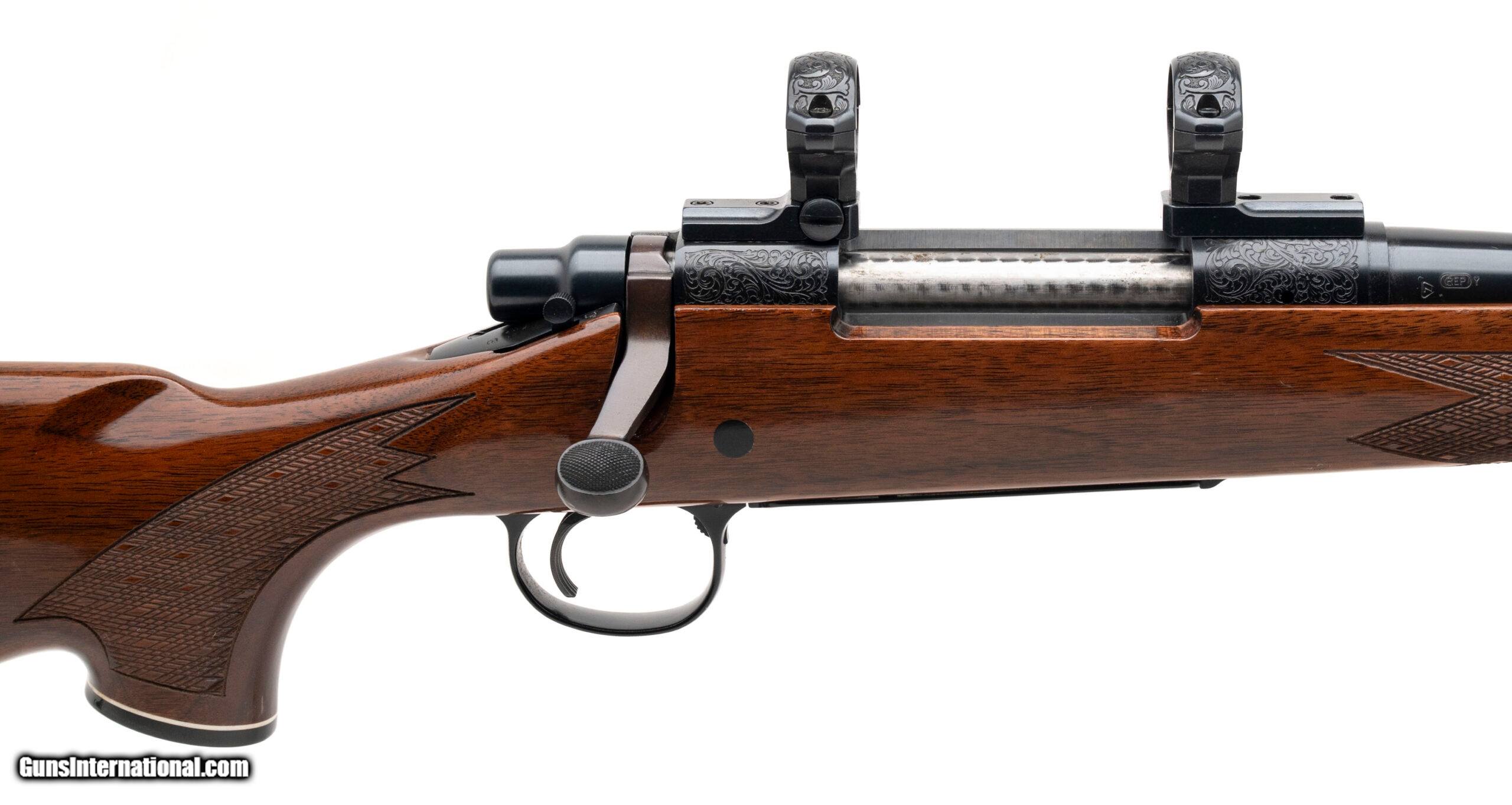 Description: "SN: E6731190. 1990's vintage .270 Win with a 20"" barrel. Deluxe bolt action rifle with scroll engraving on the receiver and floor plate. Has engraved scope rings also. The barrel has been shortened and a custom muzzle brake installed. The rifle shows marks and hunting wear on the metal and stock. Overall good condition, a sharp looking rig. SOLD |
