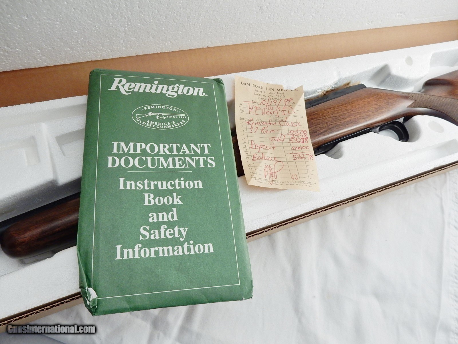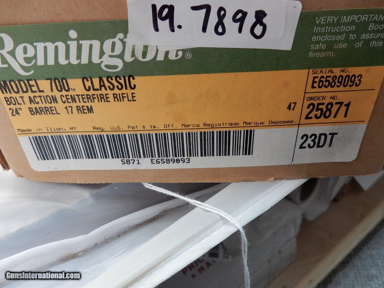 Description: This is a Remington 700 classic 17 Remington with a 24 inch barrel. This gun is 100% new in the box. Barrel code is DT. Buyer pays 40.00 shipping. Thank you. 48-10-4 SOLD |