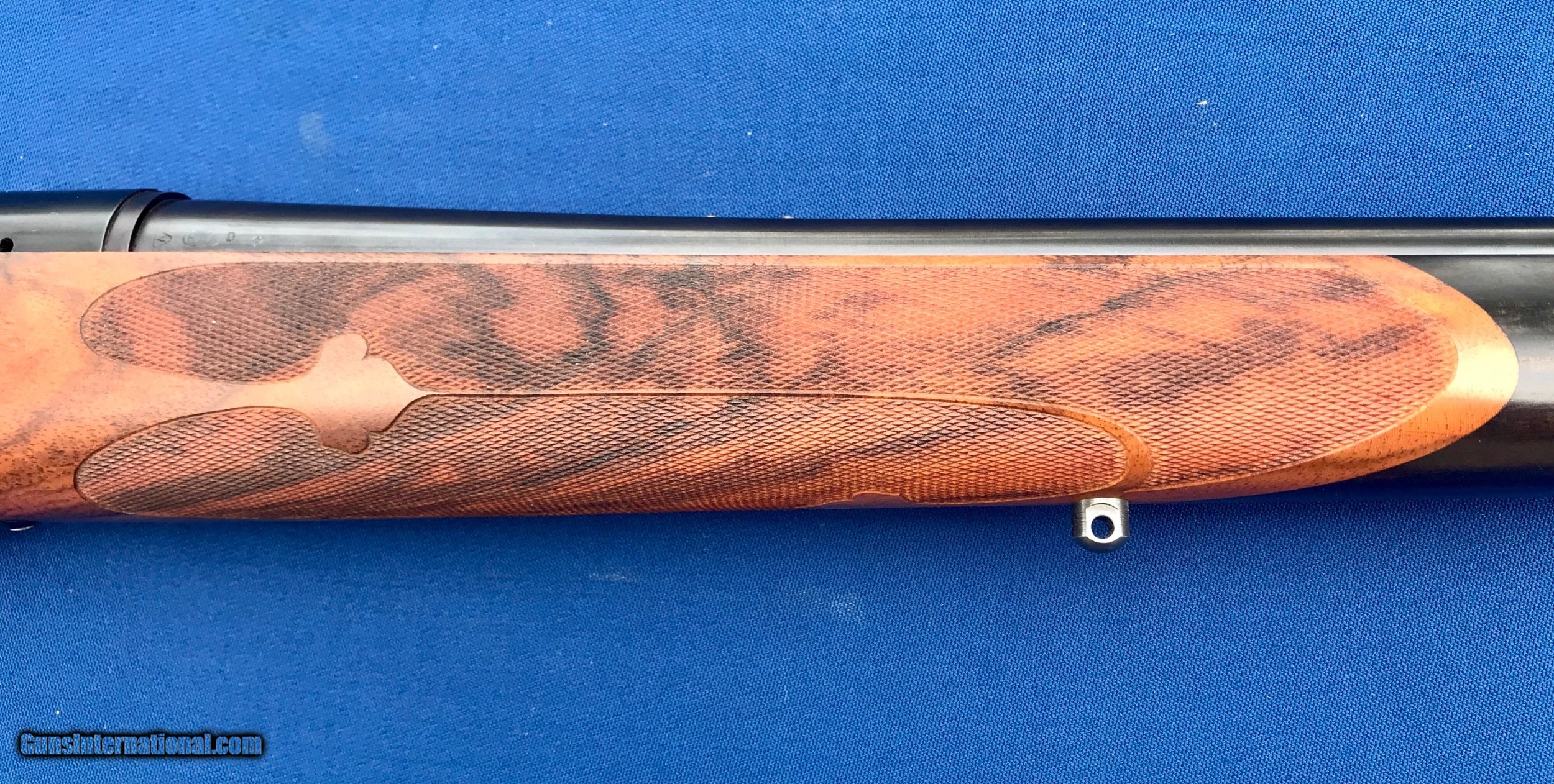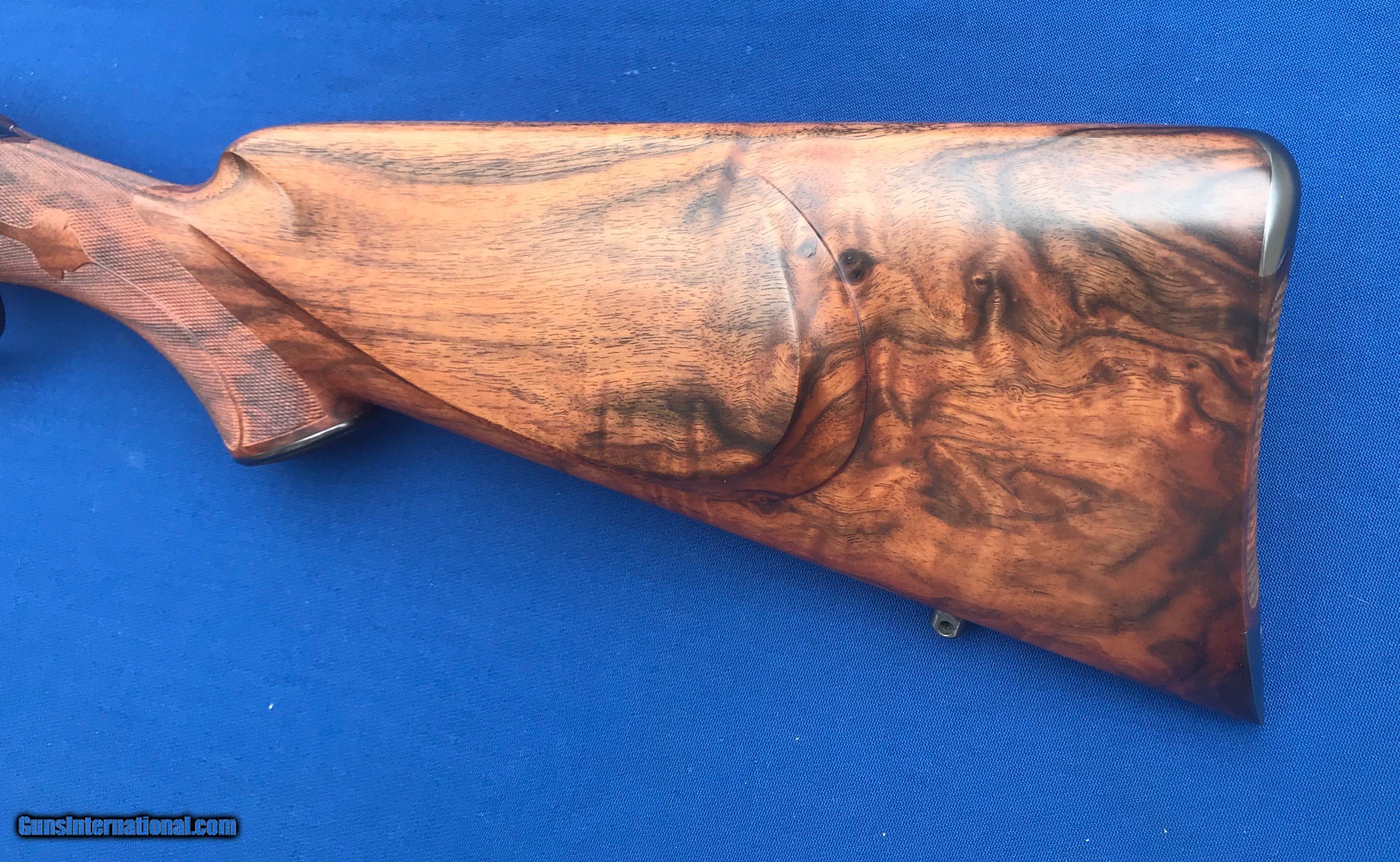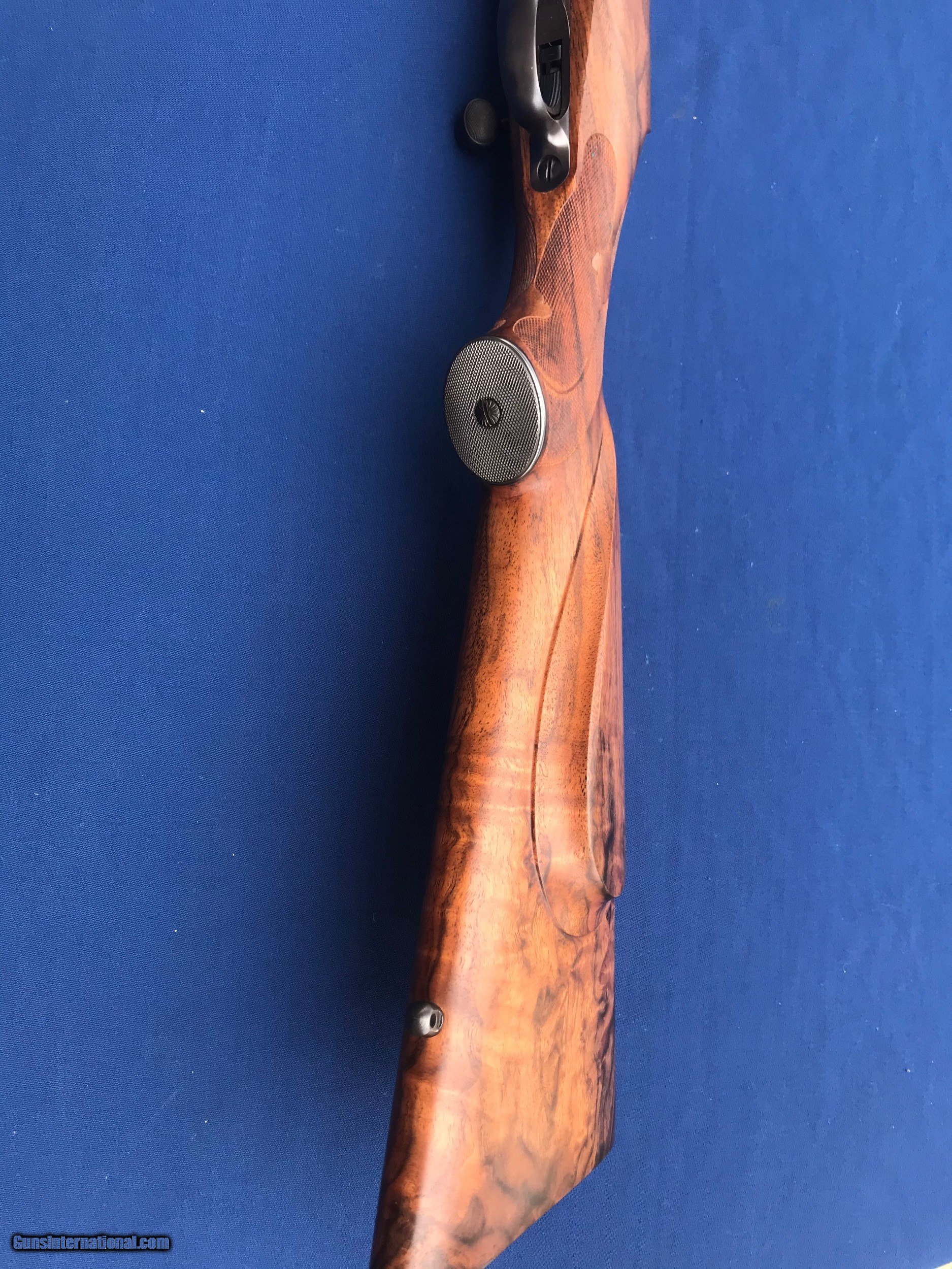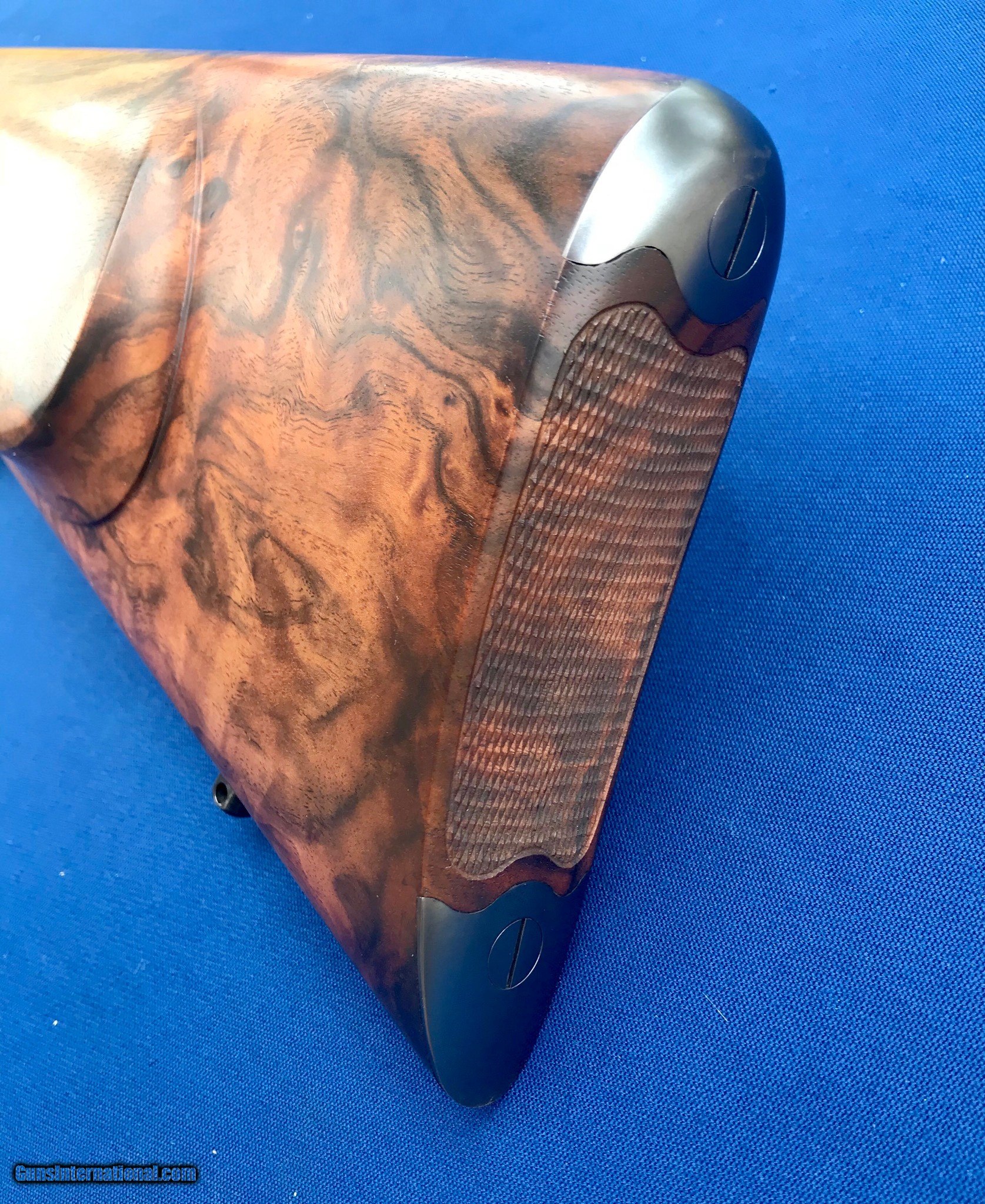 Description: Exceptional Duane Wiebe custom stocked rifle utilizing a Remington 700 Classic .22-250 barreled action. Features include a highly figured walnut stock with a 14.5" LOP, checkered butt with metal heel and toe plates, shadow line cheekpiece, checkered steel grip cap, Blackburn bottom metal, intricate checkering design and execution with fleurs, and ebony forend tip. Mr. Wiebe has a reputation a one of the finest custom stockmakers in existence, and this is a superb example of his craft. It was stocked in 1982 and is stamped "D Wiebe 1982" in the barrel channel. It remains in 99% condition and appears to be unfired. Please contact me via email, and I will respond promptly. References provided upon request. SOLD |