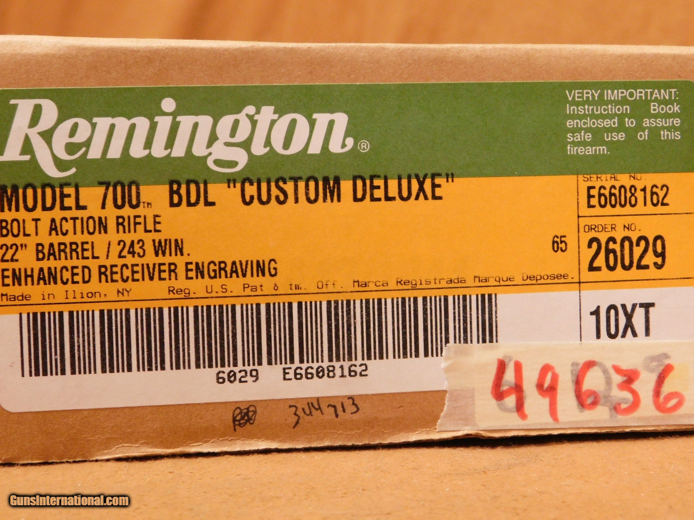 Description: This is a like new, unfired Remington Model 700 BDL Custom Deluxe in .243 Winchester with a 22-inch barrel. This rifle features enhanced engraving on the receiver and floor plate, a jeweled bolt, and a hooded front sight. This rifle comes in its factory box. All items are also available for sale in our brick & mortar store and are subject to prior sale. Think long, think wrong. Payment On firearms, we typically only accept credit cards or money orders/cashier's checks.