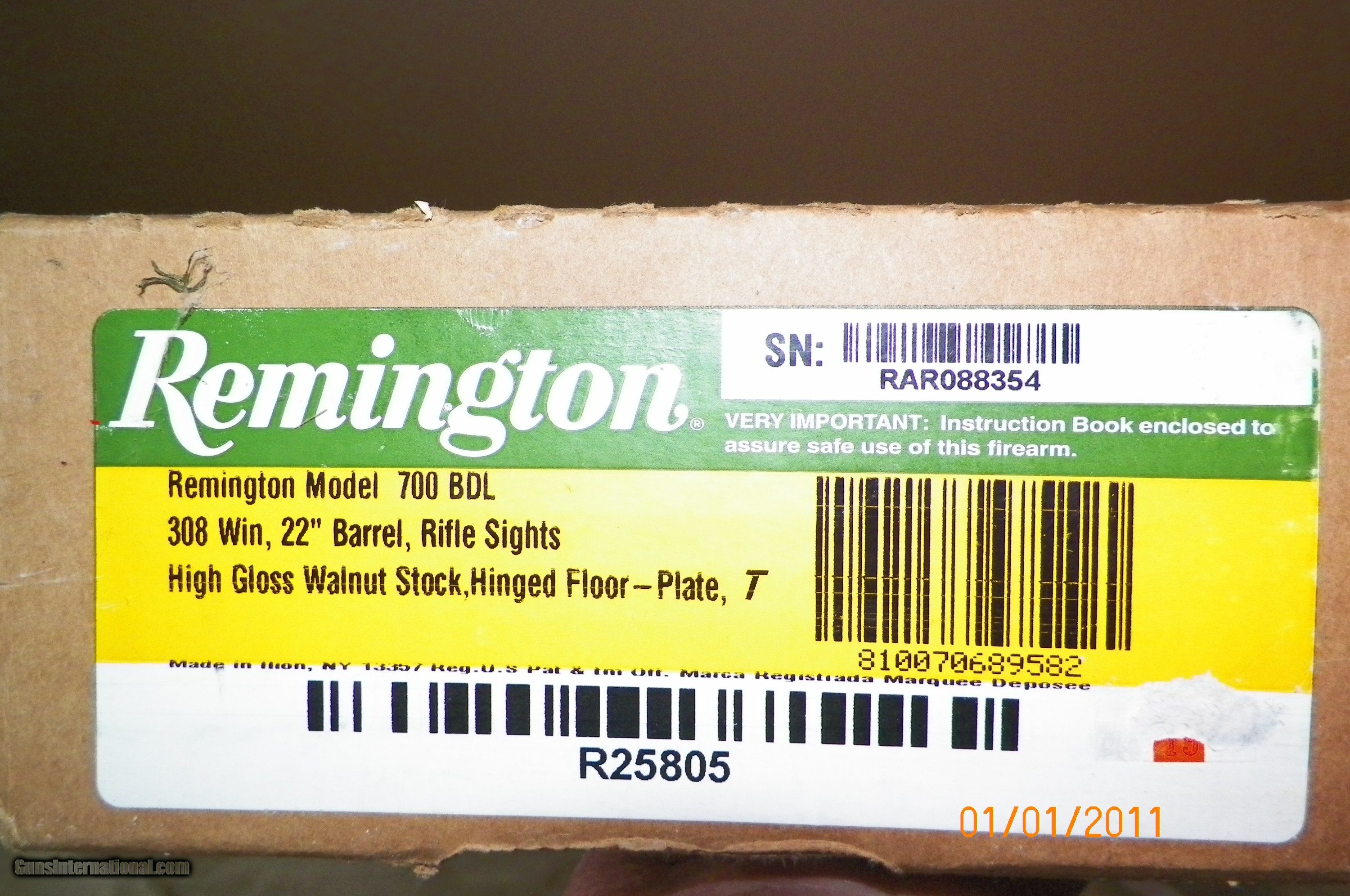 Description: New Remington 700 BDL 308 Win. with Beautiful High Gloss Walnut Stock SOLD Rifle Caliber: .308 Winchester Manufacturer: Remington Model: 700 BDL Serial Number: RAR 088354 Barrel Length: 22 Condition: New Metal Condition: New Wood Condition: New Bore Condition: New Barrel Type: Sporter Contour Action: Bolt Triggers: Original factory Stock: Walnut Wood Sights: Factory Original Manufacture Date: 2023 |