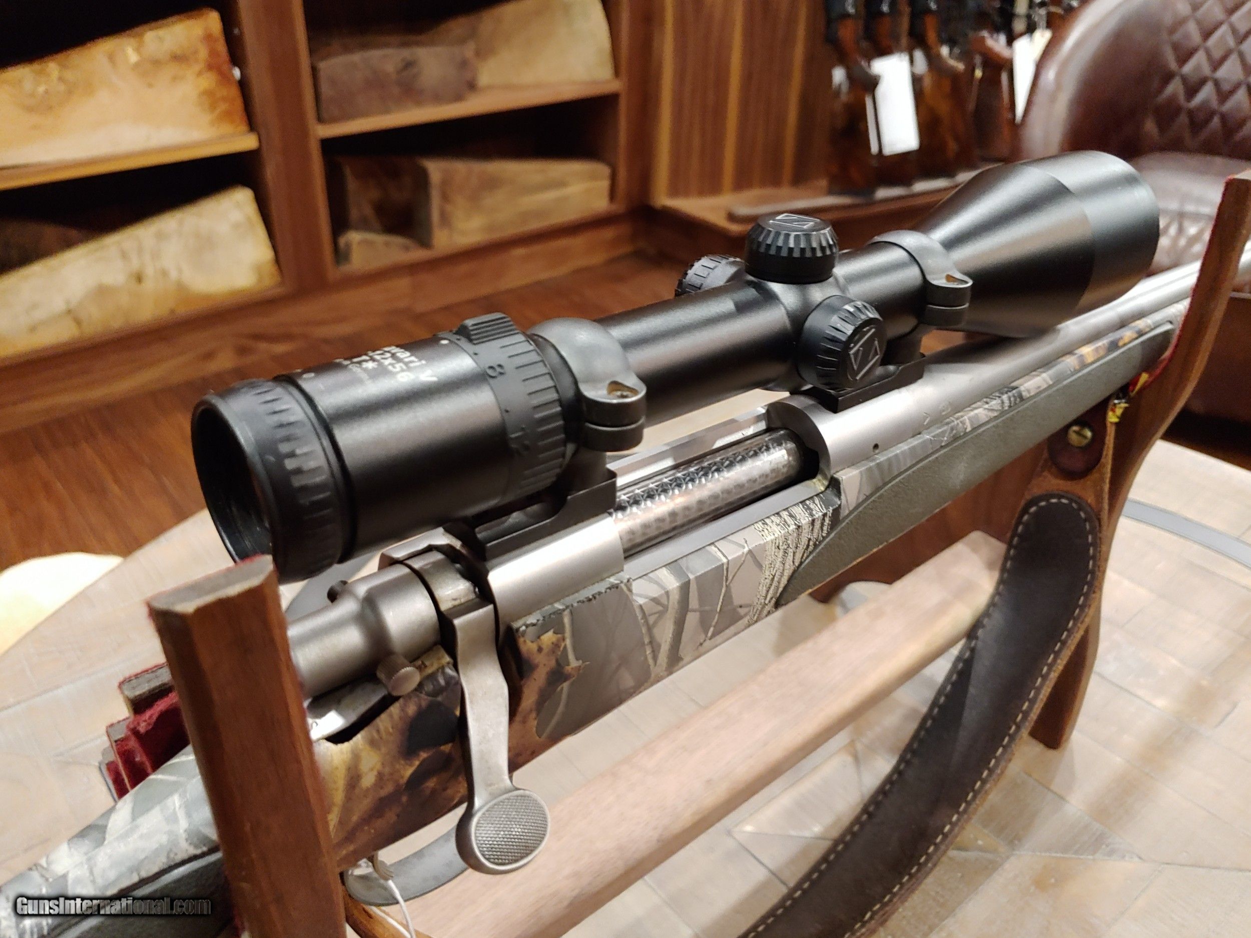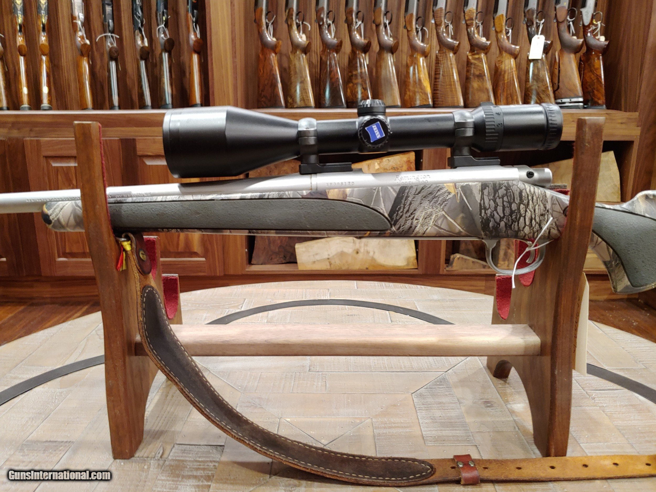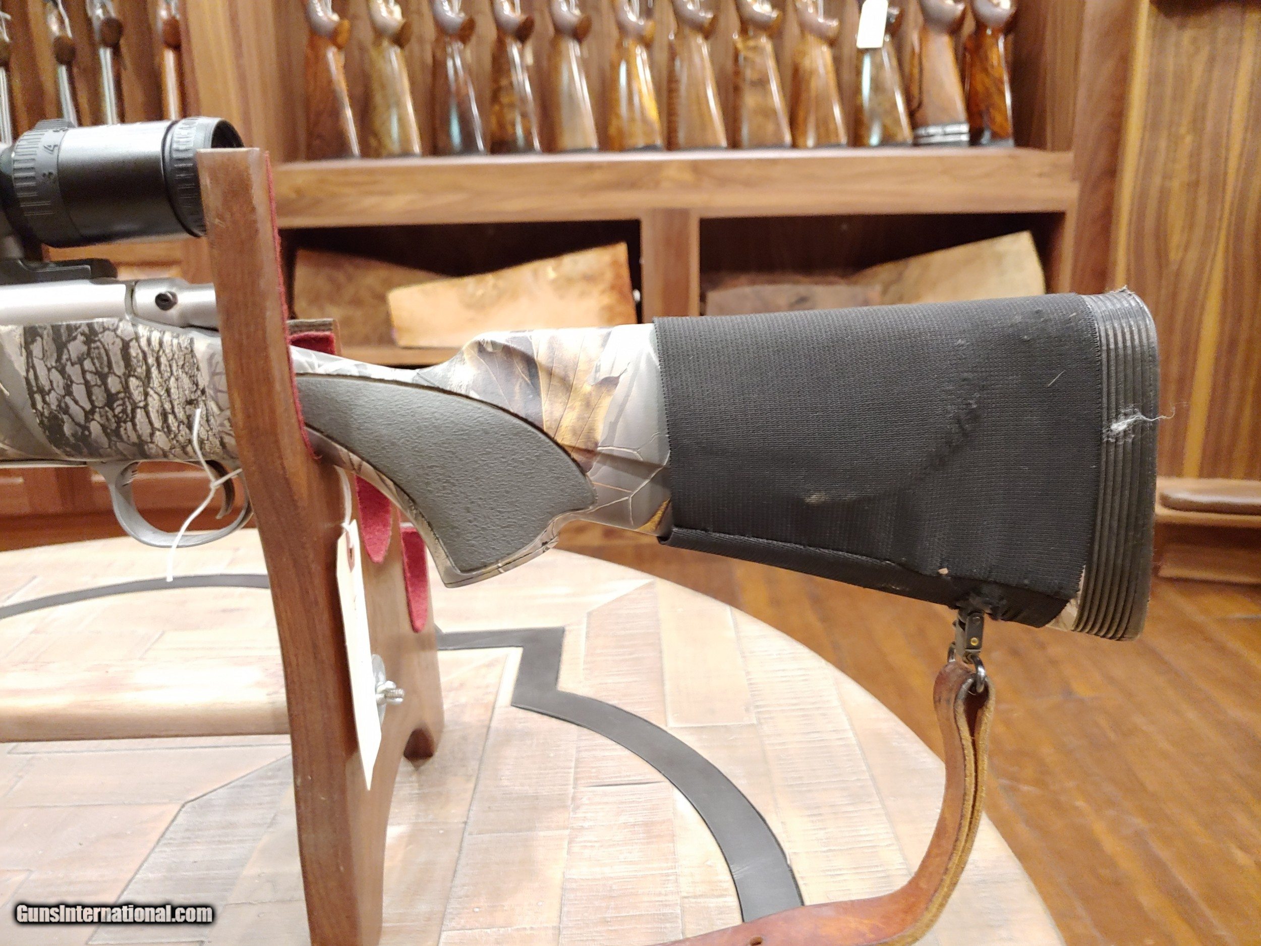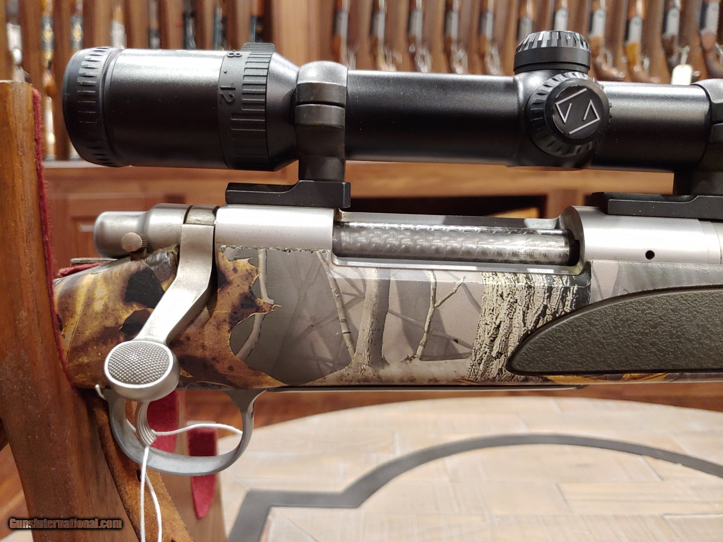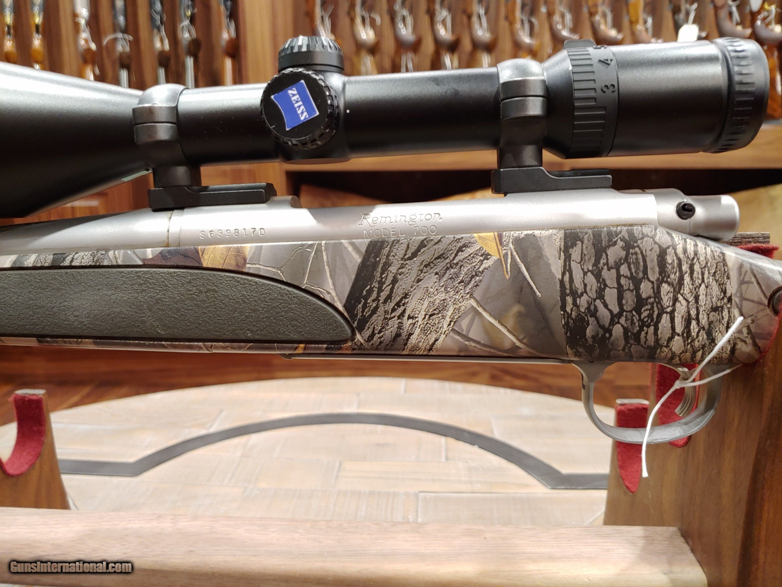 Description: This Remington M700 is a bolt-action rifle chambered in.300 Ultra Remington Magnum rounds with a 24.5" silver barrel. It has an overall length of 48.5", an LOP of 13.5", and a 2.75" muzzle. It features a woodland camo finish on the stock. Gun comes with a tactical stock sleeve, leather sling, and a Zeiss Diavari V 3-12x56 Scope. This gun is in great condition.