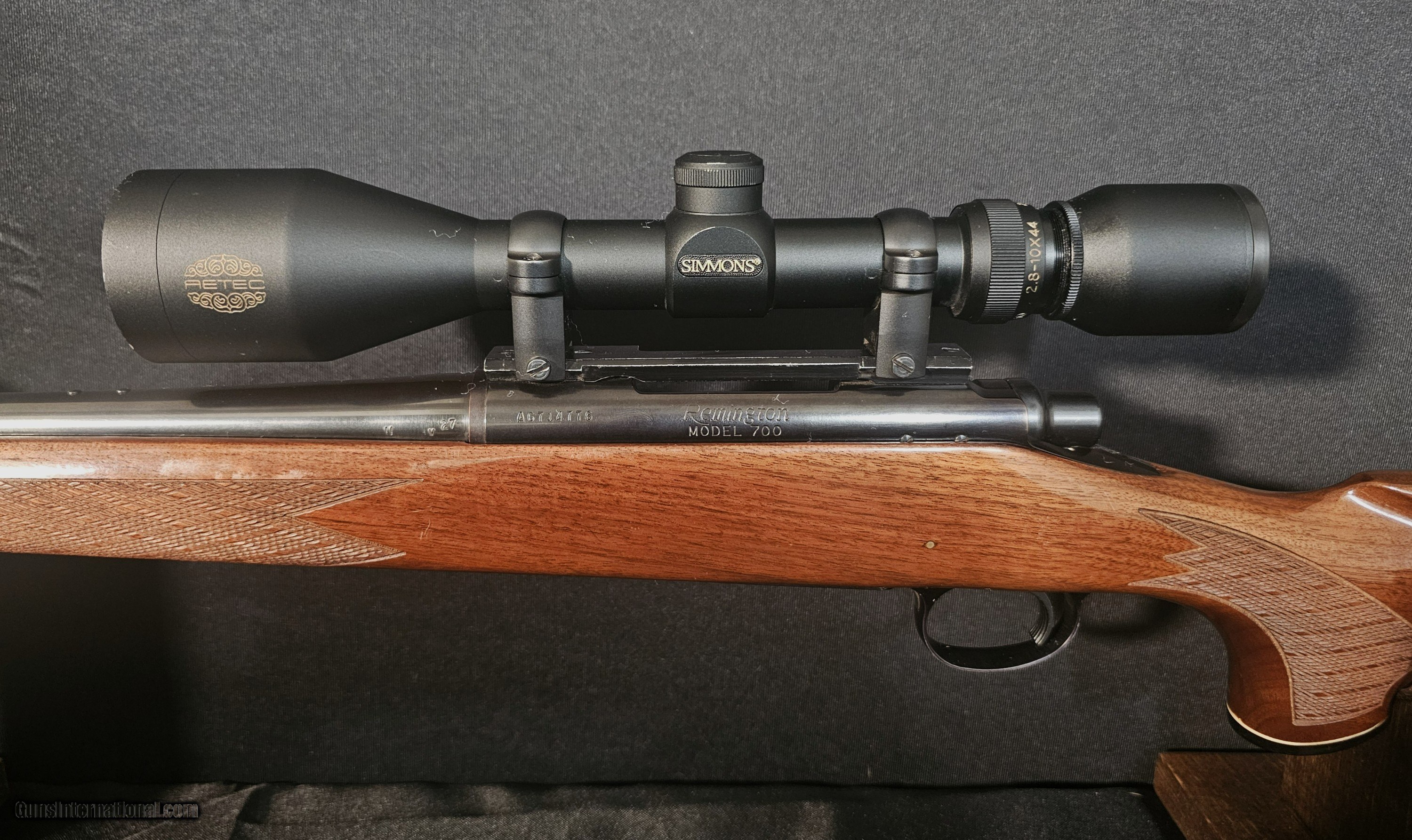 Description: The Remington Model 700 is a bolt-action rifle chambered in .22-250 Remington. It is built with a 24-inch barrel and configured for precision shooting typical of this cartridge. The rifle weighs approximately 8 pounds 12 ounces. The receiver and barrel are finished in a standard factory style consistent with Remington production. The Model 700 action utilizes dual locking lugs and a manually operated bolt system, known for its controlled feed and solid lockup design. This configuration provides a straightforward single-shot cycling mechanism through the internal magazine. Factory iron sights are not present on this rifle. The barrel length and weight suggest a full-size sporting configuration suitable for bench or field use. The stock is of conventional form for the Model 700 series, with a length of pull measured at approximately 13.25 inches. A Simmons Aetec scope is installed, mounted in place of the missing factory sights. No other accessories or packaging. Terms and Conditions: