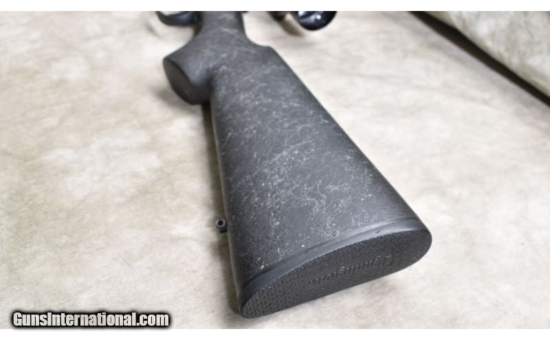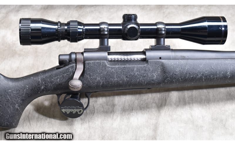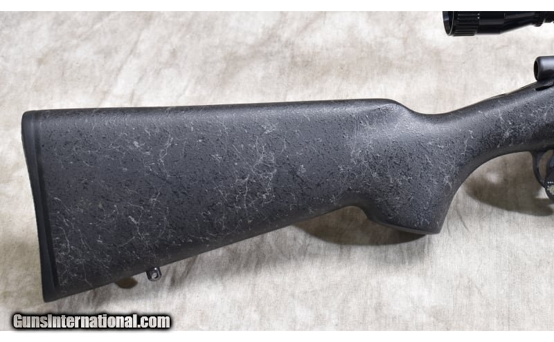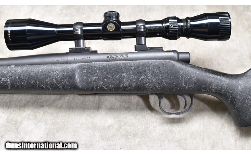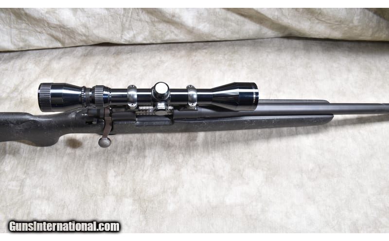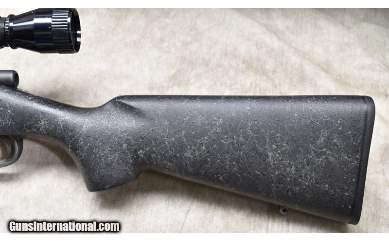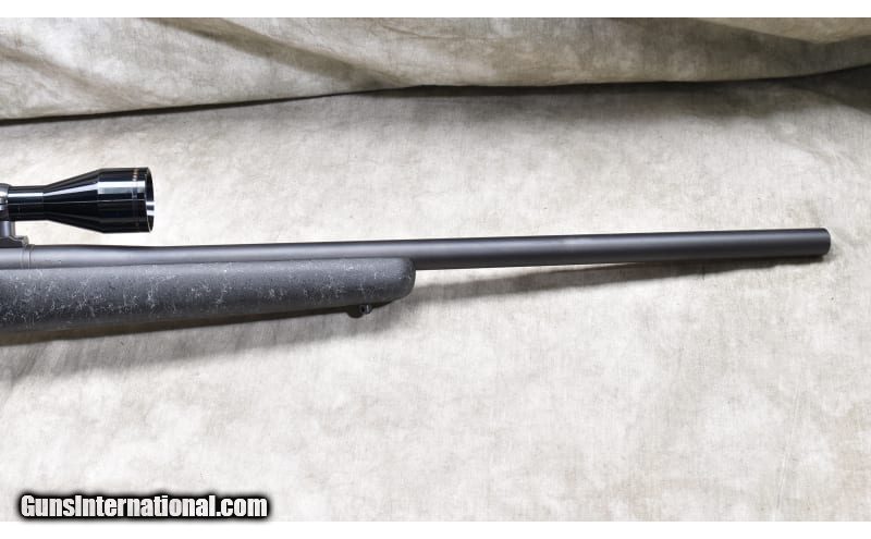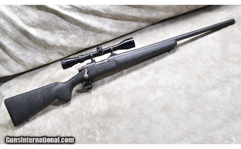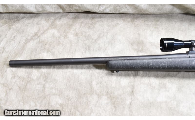 Description: Very nice varmint rifle chambered in .223 Rem, and featuring a heavy dark grey synthetic with spider webbing light grey, jeweled bolt, and internal magazine with hinged floor plate. .223 Remington SOLD Chambers: 5 Metal Condition: Very good to excellent. Wood Condition: Very good to excellent. Bore Condition: Shiny and bright with good rifling. Barrels: Heavy weight (0.850 Dia.) 24-inches. Triggers: Factory trigger. Stock Dimensions: 13-1/2 inch LOP. Fore End: Wide beavertail. Butt Pad: Rubber pad. Weight: 10 lb - 4 oz Sights: Drilled and tapped for scope. Outfitted with a Nichols 3-9x scope. Item Location: Rogers |