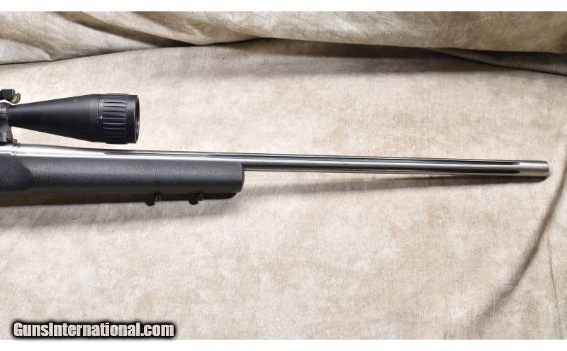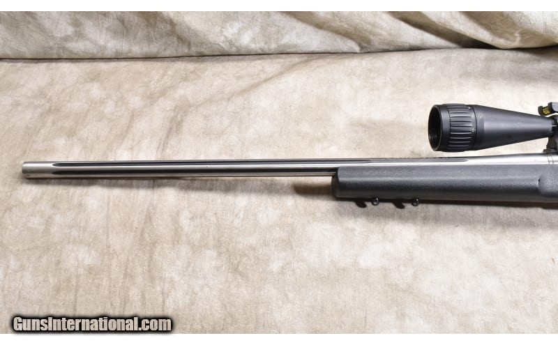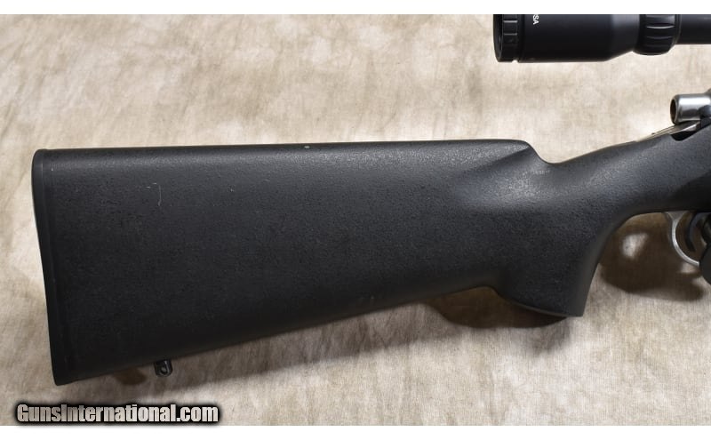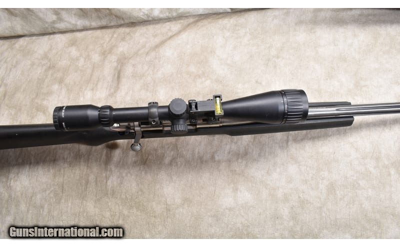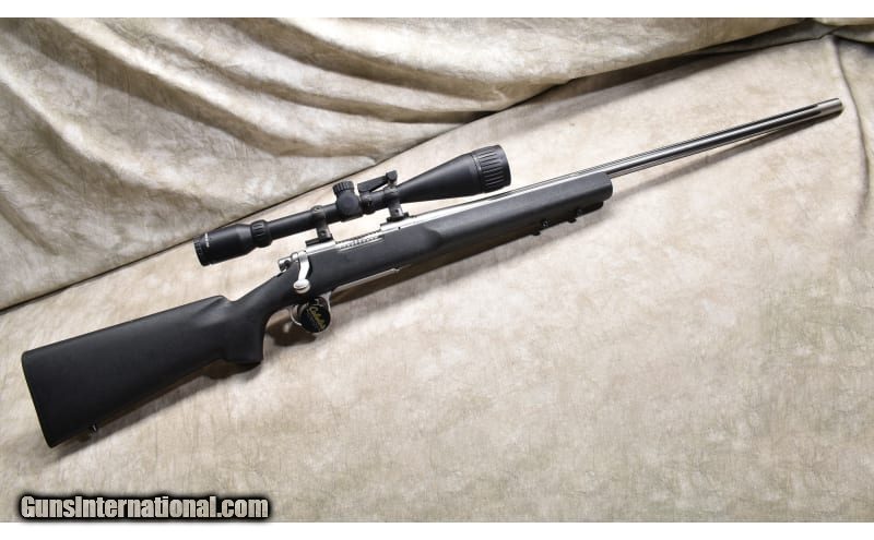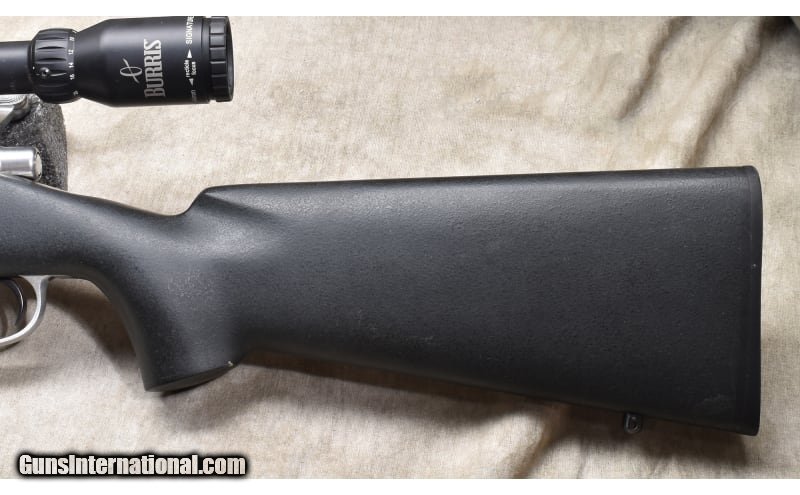 Description: This varmint rifle features a 26-inch fluted barrel, internal magazine, hinged floor plate, heavy black synthetic stock, and comes with a scope. .223 Remington SOLD Chambers: 4 rounds Metal Condition: Very good to excellent. There are a few handling marks. Wood Condition: Very good. There are a few handling marks and a couple of digs. Bore Condition: Shiny and bright with crisp rifling. Barrels: 26-inch two-tone fluted. Triggers: Factory trigger. Stock Dimensions: 13-1/2 inch LOP. Fore End: Full beavertail bench rest or sand bag fore end. Butt Pad: Rubber pad. Weight: 10 lb - 6 oz incl scope Sights: Set up for scope and outfitted with Burris 6-24 scope. Item Location: Rogers |