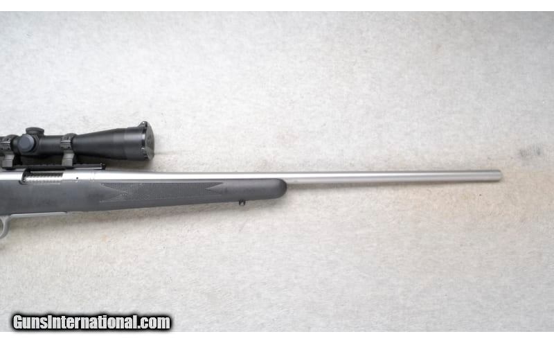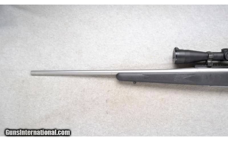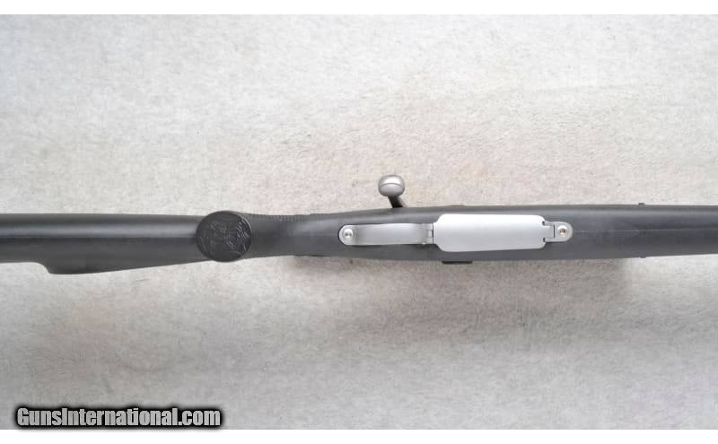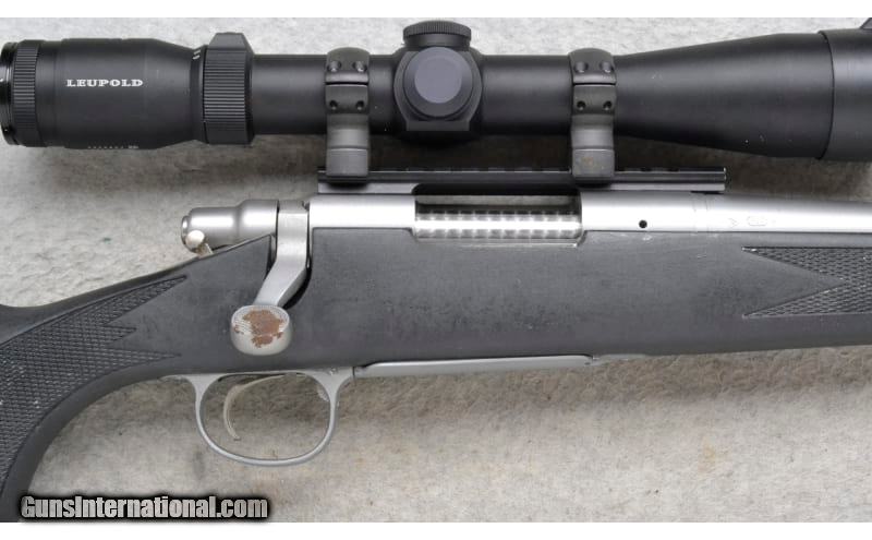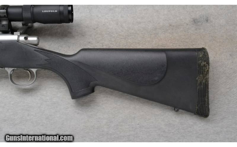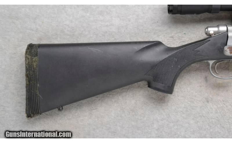 Description: This Remington Model 700 is a right hand bolt action rifle in .300 Rem SA Ultra Mag Cal. It has a 24 inch matte stainless steel barrel. It is outfitted with a Leupold 3-9x40 Scope. The butt stock is a checkered grip black polymer with a raised cheekpiece and black polymer cap. The forearm is a checkered grip black polymer. It has a jeweled bold and checkered bolt handle. .300 Remington Ultra Magnum SOLD Chambers: Internal Magazine with a hinged floorplate. Metal Condition: Good. Barrel has some minor freckling. Checkered bolt handle has some rust. Bore Condition: Excellent. Barrels: 24 inch matte stainless steel. Stock Dimensions: LOP 13 3/8 inches. Fore End: Checkered grip black polymer. Butt Pad: Remington LimbSaver black rubber recoil pad. Appears gummy/melted. Weight: 8 lb. 14 oz. Sights: Leupold VX-R 3-9x40 Scope. Item Location: Richfield, WI |