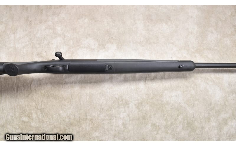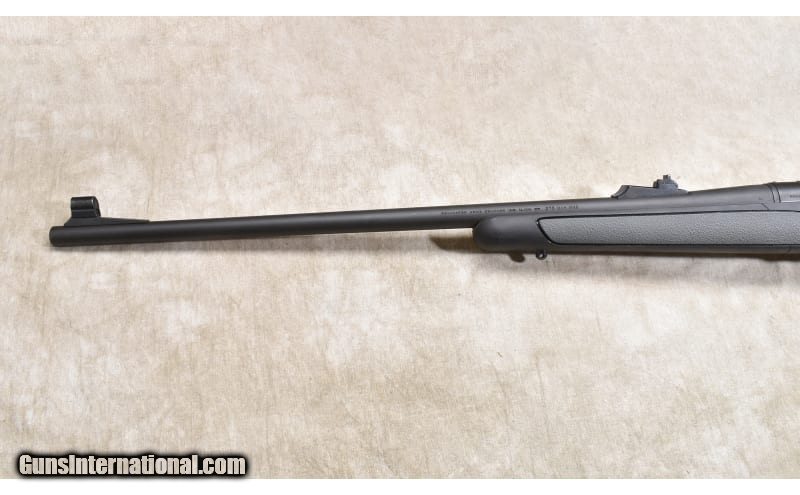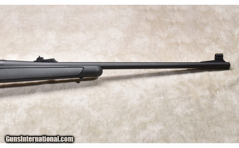 Description: Nice light rifle for dangerous game anywhere in the world. It features a weight less than 7 pounds, iron sights, provision for scope, and internal magazine with hinged floor plate. The metal is finished with a matte black coating. The stock is black plastic with grey rubber grip panels. .375 H&H Magnum SOLD Chambers: 4 rounds Metal Condition: NIB Wood Condition: NIB Barrels: 24 inches Triggers: Factory trigger Stock Dimensions: LOP: 13-1/4 inches Butt Pad: Thick and soft recoil pad Weight: 6 lb - 12 oz Sights: "Hooded bead and notch open sights, drilled and tapped for scope. Item Location: Rogers |