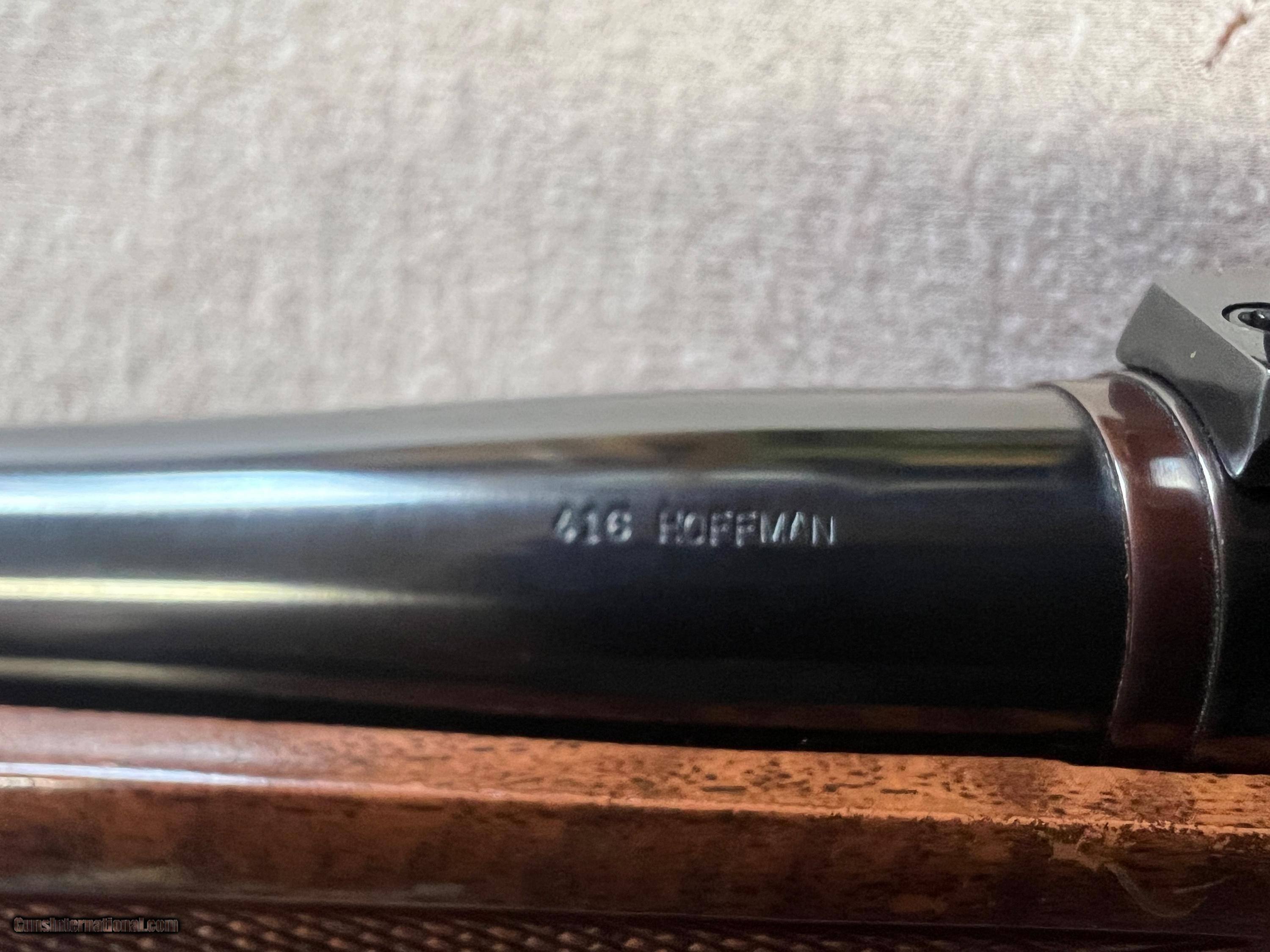 Description: Custom built 416 Hoffman on a Remington 700 BDL action. Built in the late 70's by Wisners Gun Shop in Adna Washington. 24" Douglas XX Premium barrel with brake. 1-12 twist. Beautiful bluing. Composite stock. Very nice rifle. Been in a safe for 30+ years. Includes 100 A-square loaded rounds plus reloading dies. Buyer pays actual shipping. Ammo shipped separately SOLD Manufacturer: Remington Model: 700 Barrel Length: 24 Condition: Excellent Metal Condition: Excellent Wood Condition: Excellent Bore Condition: Excellent |