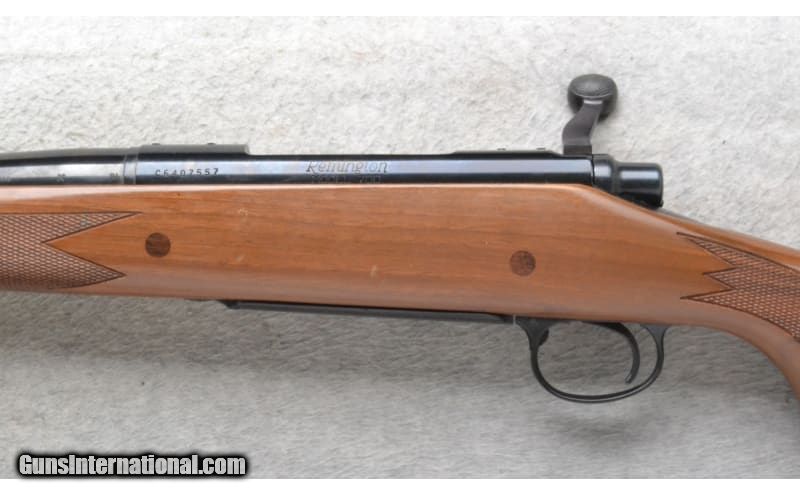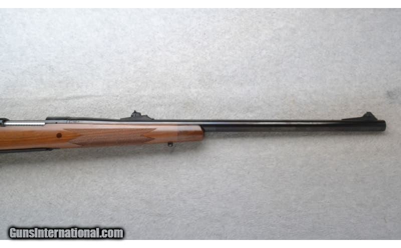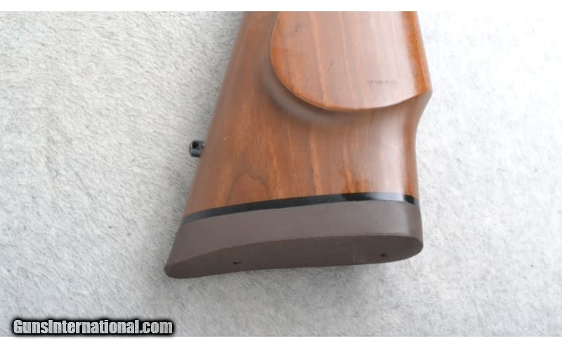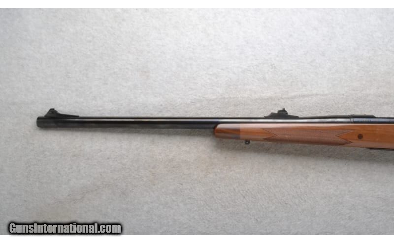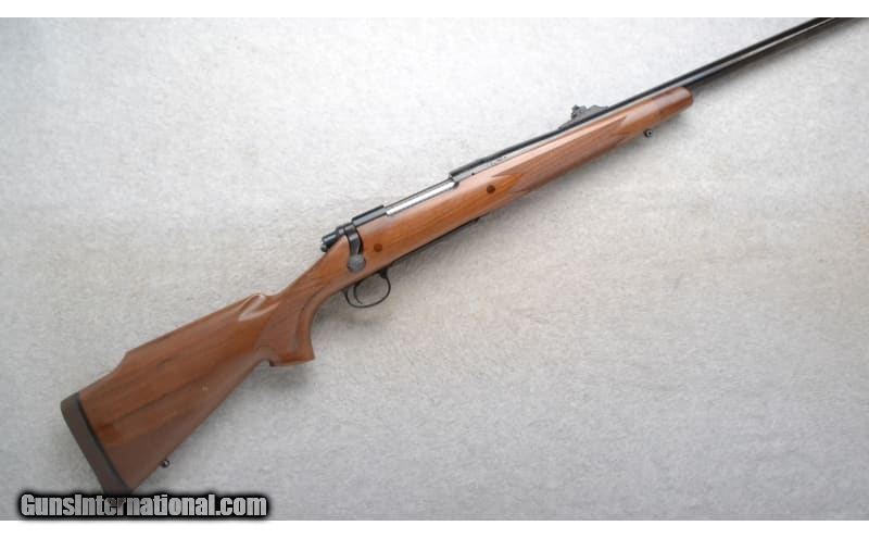 Description: This Remington Model 700 is a right hand bolt action rifle in .416 Rem. Mag. Cal. It has a 24 inch heavy barrel. A raised blade front sight and an adjustable notch middle sight. It is drilled and tapped for a scope mount. The butt stock is a checkered grip hardwood pistol grip with a raised cheekpiece and rosewood cap. The forearm is a checkered grip hardwood with a rosewood tip. .416 Remington Magnum SOLD Chambers: Internal Magazine with a hinged floorplate. Metal Condition: Excellent. Wood Condition: Very Good. Some light handling marks. Bore Condition: Excellent. Barrels: 24 inch heavy. Stock Dimensions: LOP 13 1/4 inches. Fore End: Checkered grip hardwood with a rosewood tip. Butt Pad: Remington rubber recoil pad. Weight: 9 lb. 0 oz. Sights: Raised blade front. Adjustable notch middle. Drilled and tapped. Item Location: Richfield, WI |