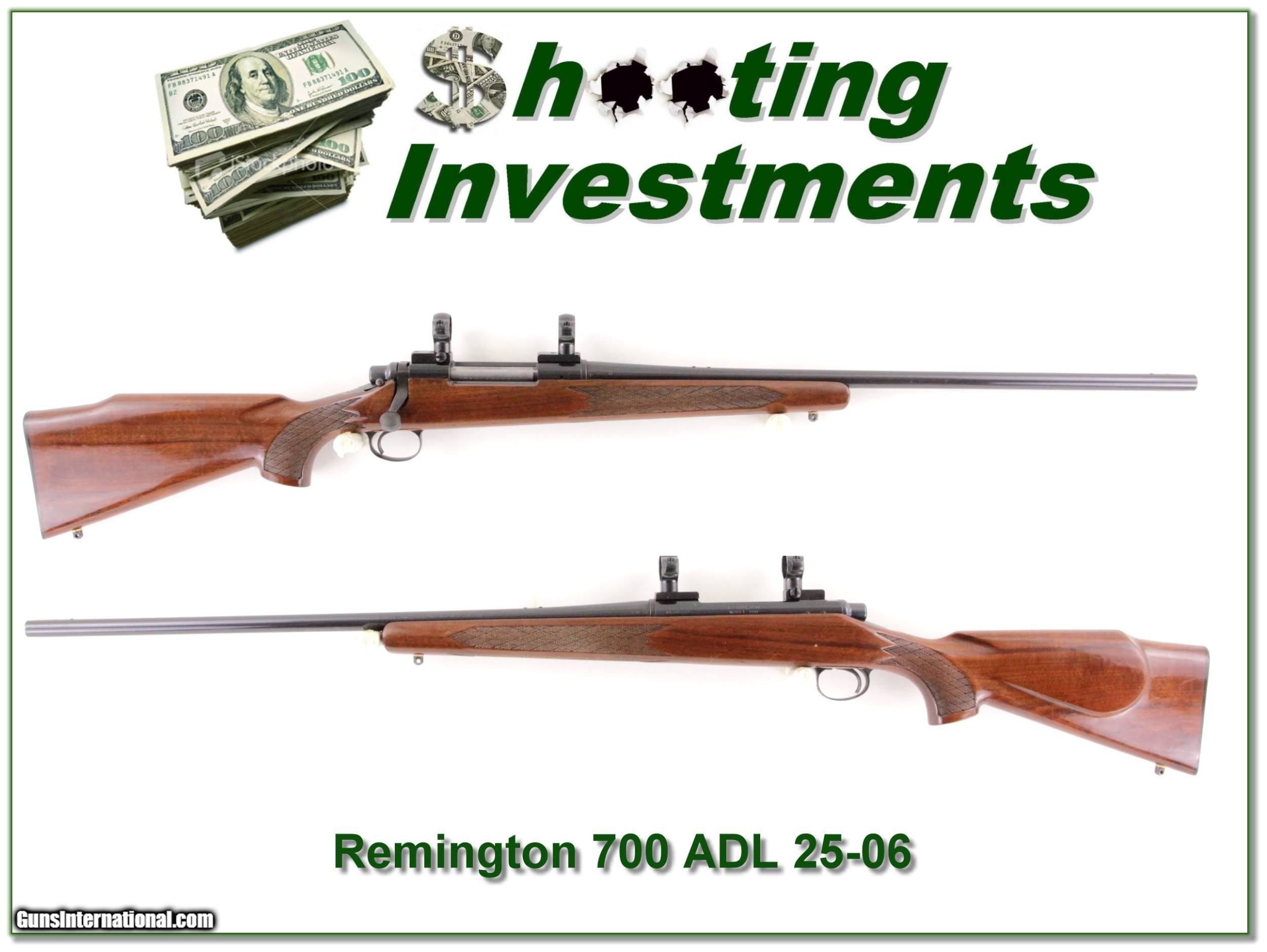 Description: This is a hard to find early Remington 700 ADL in 25-06 Remington. It has a 24in barrel and comes as seen with bases and rings. The blue is very good, and the wood has scattered minor marks from use. It will make a classic hunting gun. Shipping with insurance is $39. Please email me with any questions or larger pictures. (Consign your quality firearms with Shooting Investments for only 12%! Let me know if you have any you would like to sell!) 19-1517 Payment: Payment is by Money Order, Cashiers Check or Personal Check. I can now also accept MasterCard and Visa with a 3% convenience fee. PayPal can be used for some items but never firearms. Please let us know if you would like to pay via PayPal. Shipping: The shipping charge will be listed in each description. It is $39 for most guns. Some heavy guns or those insured for over $2000 will be higher. Shipments to Alaska and Hawaii are higher because air shipment is required. Most firearms are shipped on Tuesday and Thursday and usually in 5 days of receipt of payment. We package all shipments carefully and insure them. Returns: Our return policy is simple. If for any reason you are not pleased with your purchase, you may return your item for a full refund of purchase price. Ammunition cannot be returned. It is important to us that you are happy. Guns cannot be fired or dissembled before returning them and they must be returned in the same condition as received. Notification of a return must occur with-in 3 days of receipt at your dealer. Shipping, convenience and dealer fees are not refundable and are the responsibility of the buyer. Lay-a-way: If needed, we offer a 60 day lay-a-way option on most firearms. It is 1/3 now, 1/3 in 30 days and 1/3 in 60 days. Lay-a-way firearm sales are final and if not completed the first payment cannot be returned. Consigning your firearms with Shooting Investments: We will help you get top dollar for your firearms. While most local guns shops charge 20% or more, our fee is only 12% with a minimum of $75. At your local gun shop it might take months to sell. Selling on-line provides instant access to thousands of interested buyers. You won’t find any other on-line dealer willing to sell your firearms for only 12% or listing every gun on 3 separate s. Selling through an House typically costs the seller 15% and the buyer an addition 15% (so 30%) and you have to wait several months to sell and longer to receive funds. If properly priced, we will sell your firearms in a few weeks. Send us an email or give us a call and we’ll explain how easy it is for you to get top dollar. Trading: Trading for use is really just buying your gun to re-sell. If you have a gun you want to trade, please email a picture and we will let you know what we can give or it. You will always get more if we sell it for you on consignment. Help for California Buyers: We are happy to ship to California. It is the buyer’s responsibility to make sure any item you buy is legal in your state. We are also happy to help with your purchase of a firearm from someone other than us. If you see a gun you would like to buy but the seller can’t or won’t ship to California they can ship to use and we’ll then ship it to your California dealer. The cost for this service is only $30 + shipping. Let us know if we can help! SOLD |