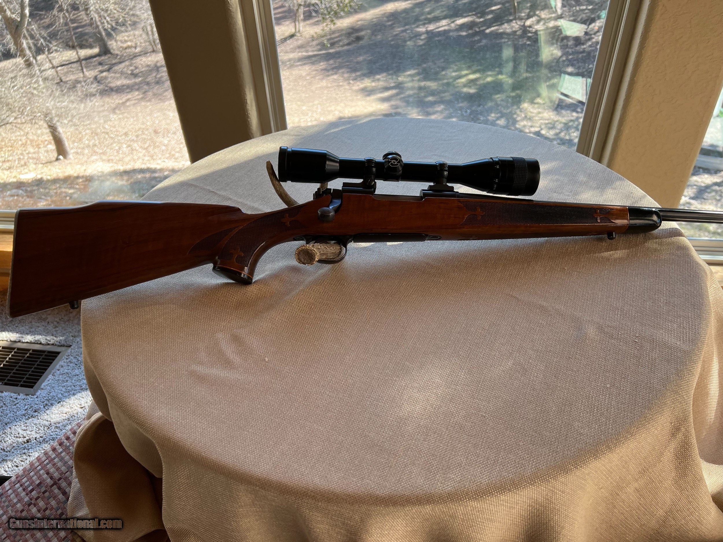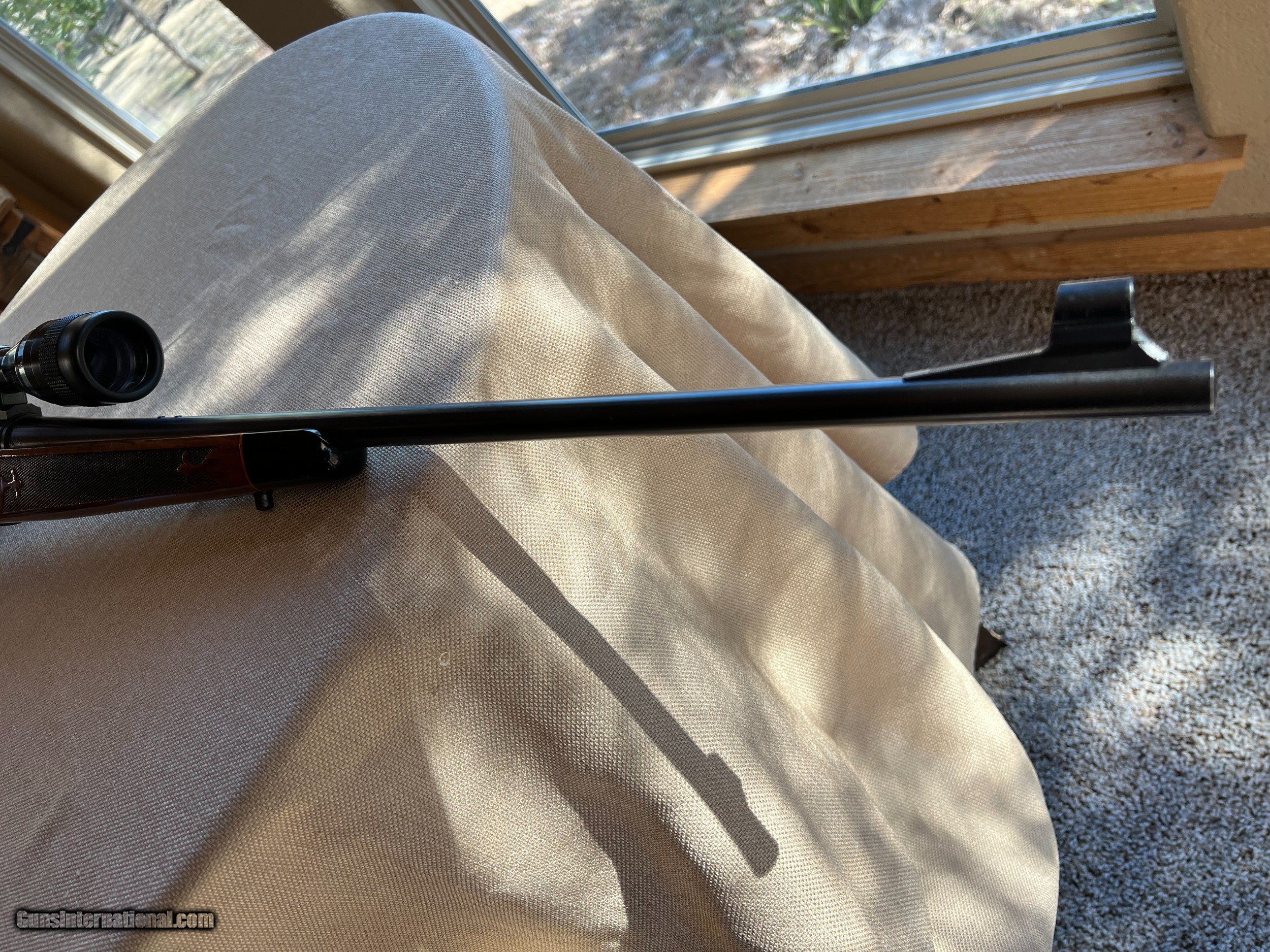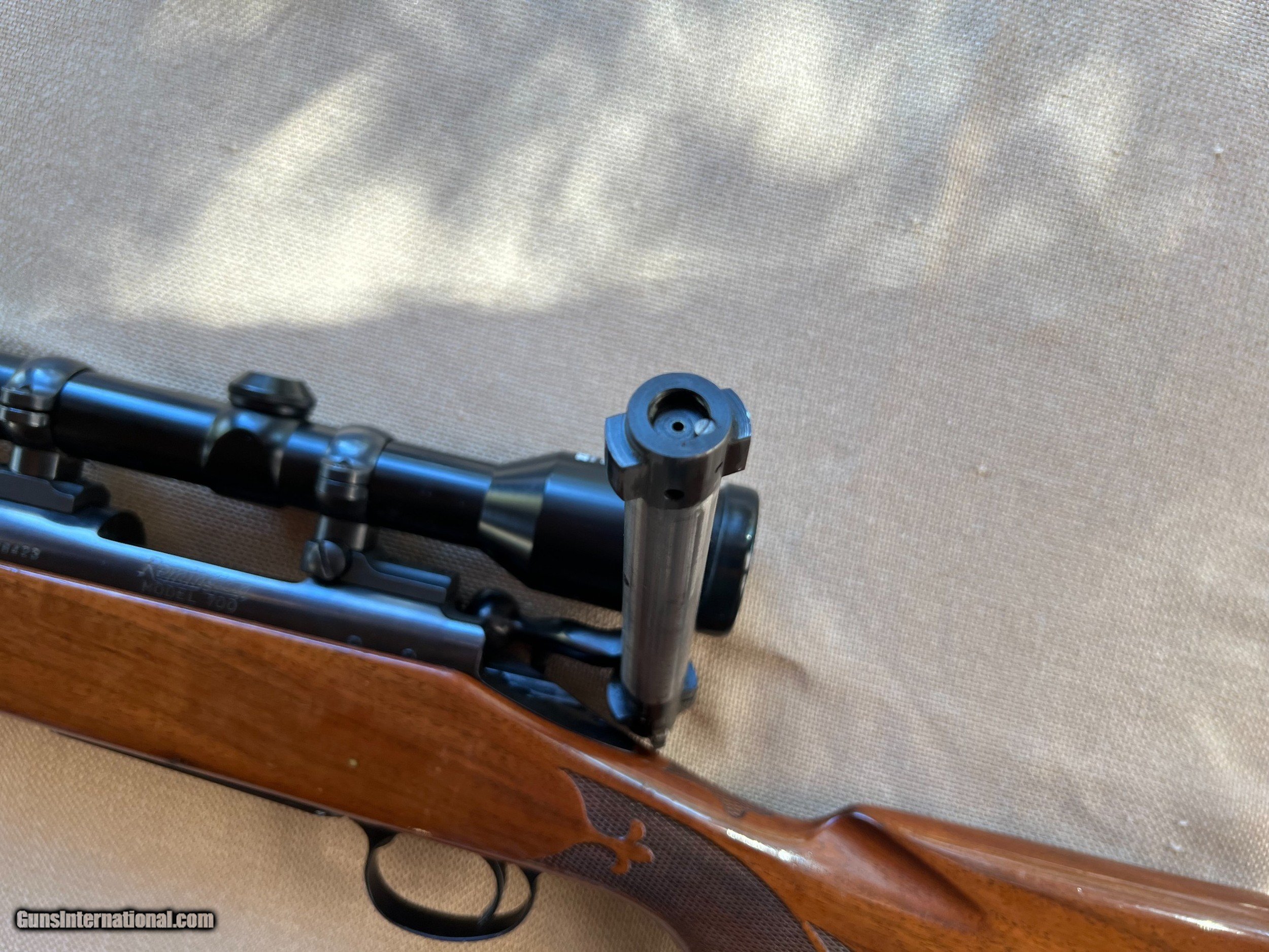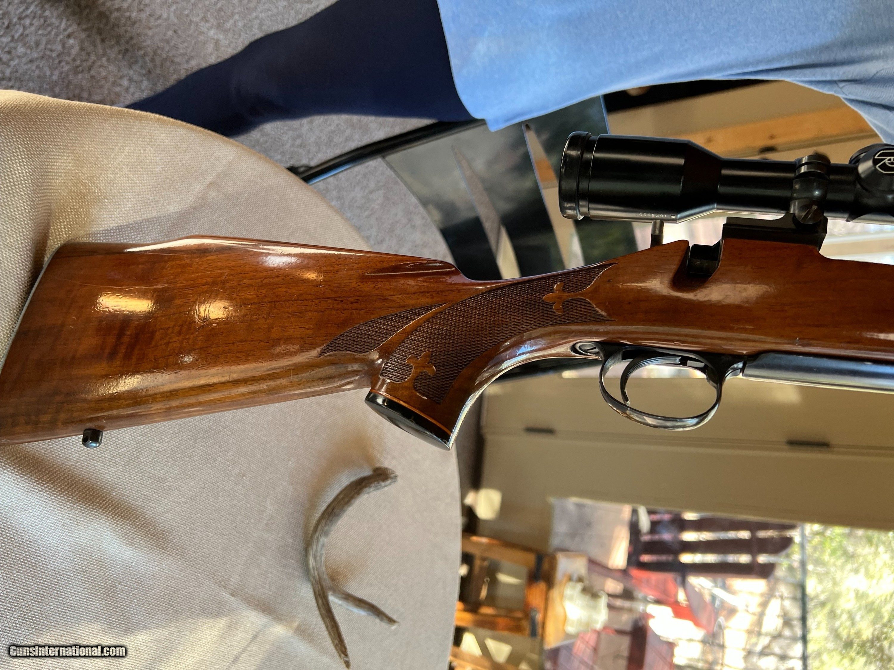 Description: Collectors Quality Early model Remington 700 BDL 222 Remington Mag. Very Ealy model with flat safety and split sear trigger and slotted receiver. Ebony forend and Original alloy butt plate. Hiinged floor plate..... This is a real nice older Remington in a Rare cartridge. SOLD! Original front sight . Rifle only at 2100.00 pllus shipping costs. Zeiss 10 with A/O with rings and bases add 500.00 if yoou buy rifle. Wood is in great condiition aand blueing is in very good condition. Bore is Great! Bolt face looks unfired but i know it has been fired at some point in time just well cared for.. Let the photos do the talking. SOLD |