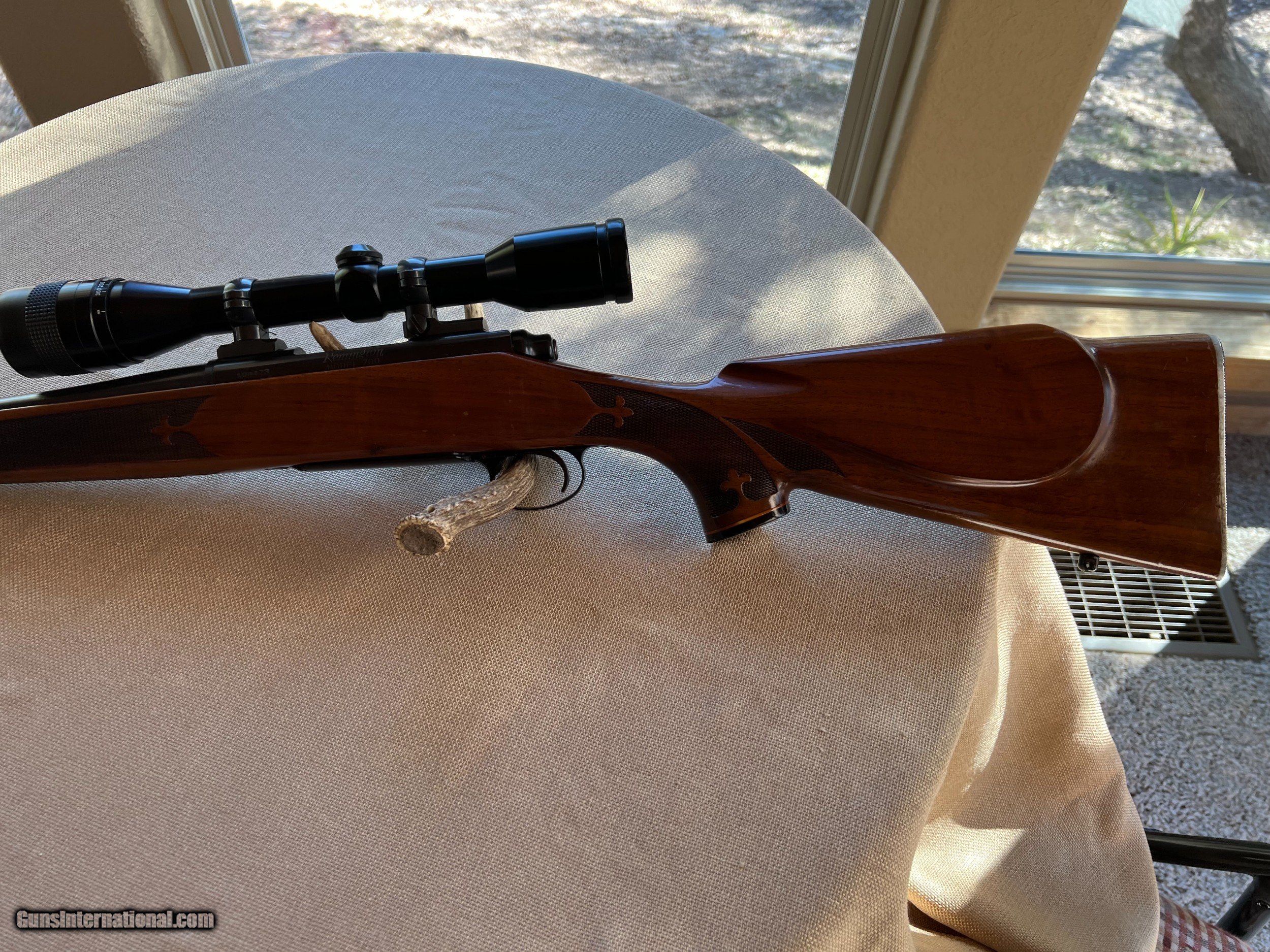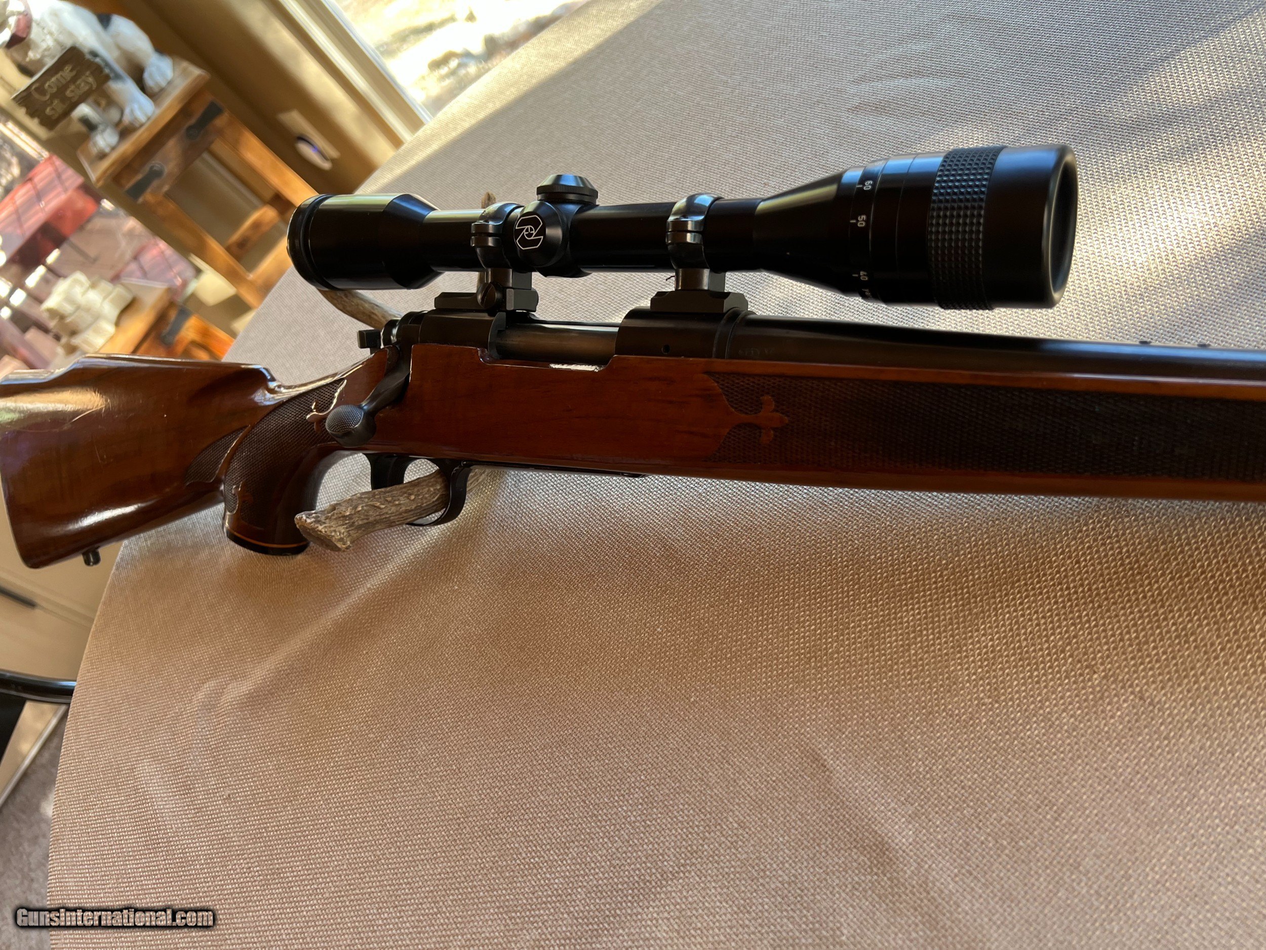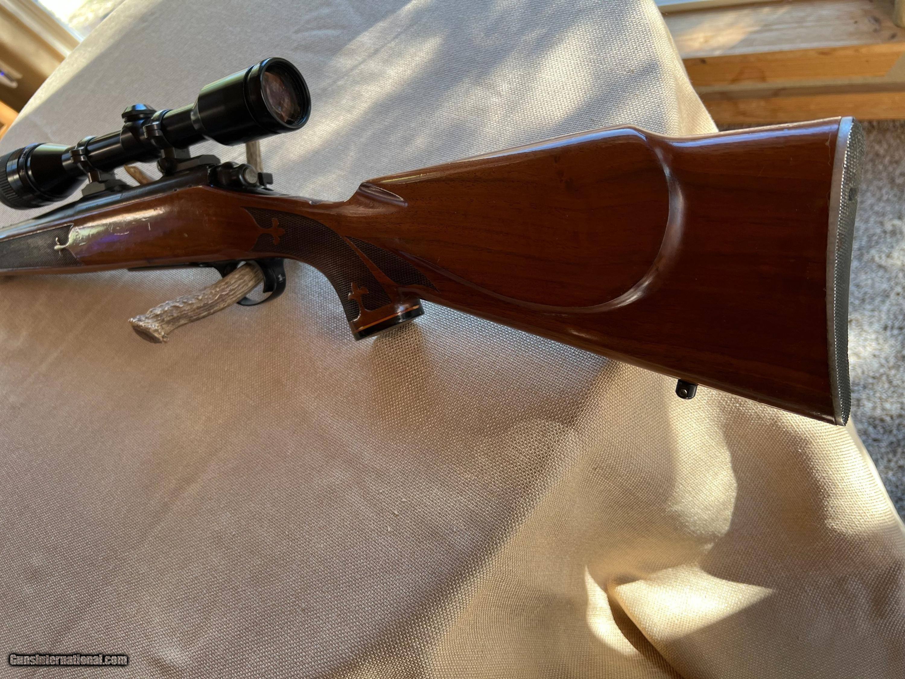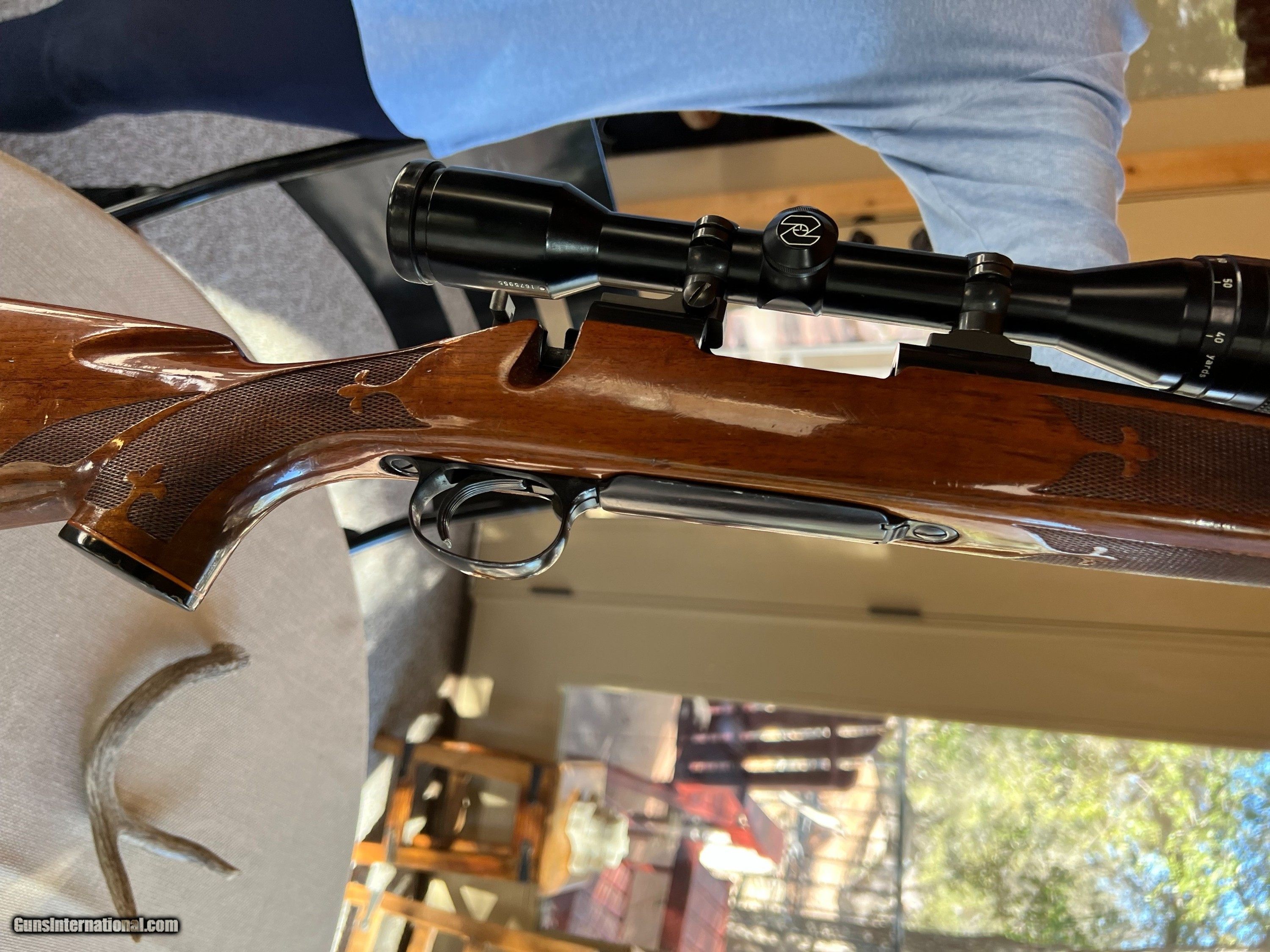 Description: Collectors Quality Early model Remington 700 BDL 222 Remington Mag. Very Ealy model with flat safety and split sear trigger and slotted receiver. Ebony forend and Original alloy butt plate. Hiinged floor plate..... This is a real nice older Remington in a Rare cartridge. SOLD! Original front sight . Rifle only at 2100.00 pllus shipping costs. Zeiss 10 with A/O with rings and bases add 500.00 if yoou buy rifle. Wood is in great condiition aand blueing is in very good condition. Bore is Great! Bolt face looks unfired but i know it has been fired at some point in time just well cared for.. Let the photos do the talking. SOLD |