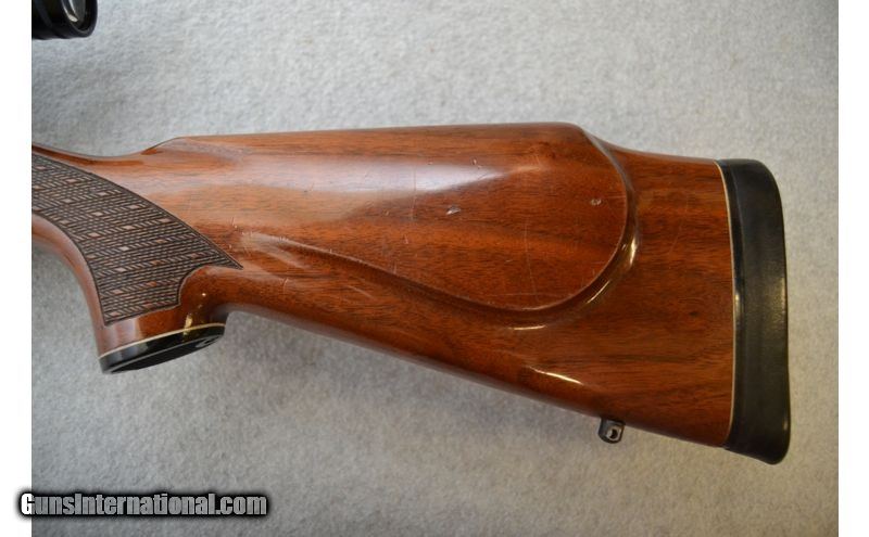 Description: Good condition overall. Metal has significant bluing loss around the muzzle and some scuffing from field use. Wood is in a similar condition with various levels handling marks. Bore is excellent with healthy shine and strong rifling. 7mm Remington Magnum SOLD Chambers: Bolt-action fed from an internal magazine with a hinged floor plate. Metal Condition: Good. Wood Condition: Good. Bore Condition: Excellent. Barrels: 24" Gloss blued. Triggers: Wide blued metal with grooved surface. Stock Dimensions: Monte Carlo style walnut with skip-line checkering. 13 ½" LOP Fore End: Walnut with wrap around skip-line checkering. Butt Pad: Black rubber pad. Weight: 9 lbs. Sights: Front blade with brass bead and adjustable rear ramp. Redfield 2-7x scope. Item Location: Green Bay |