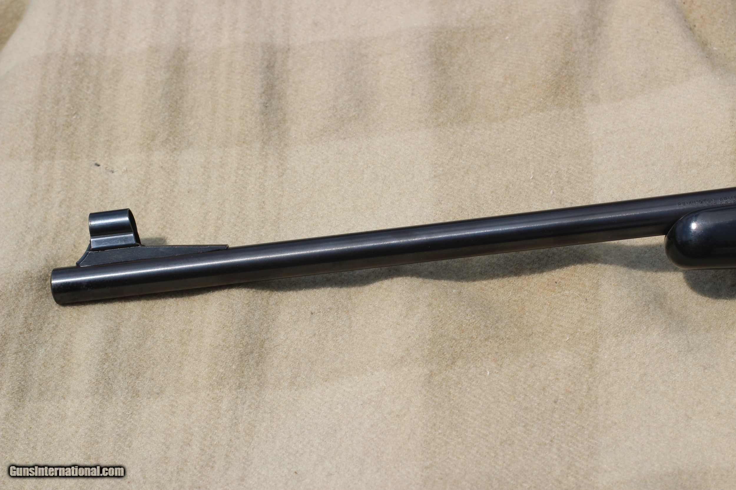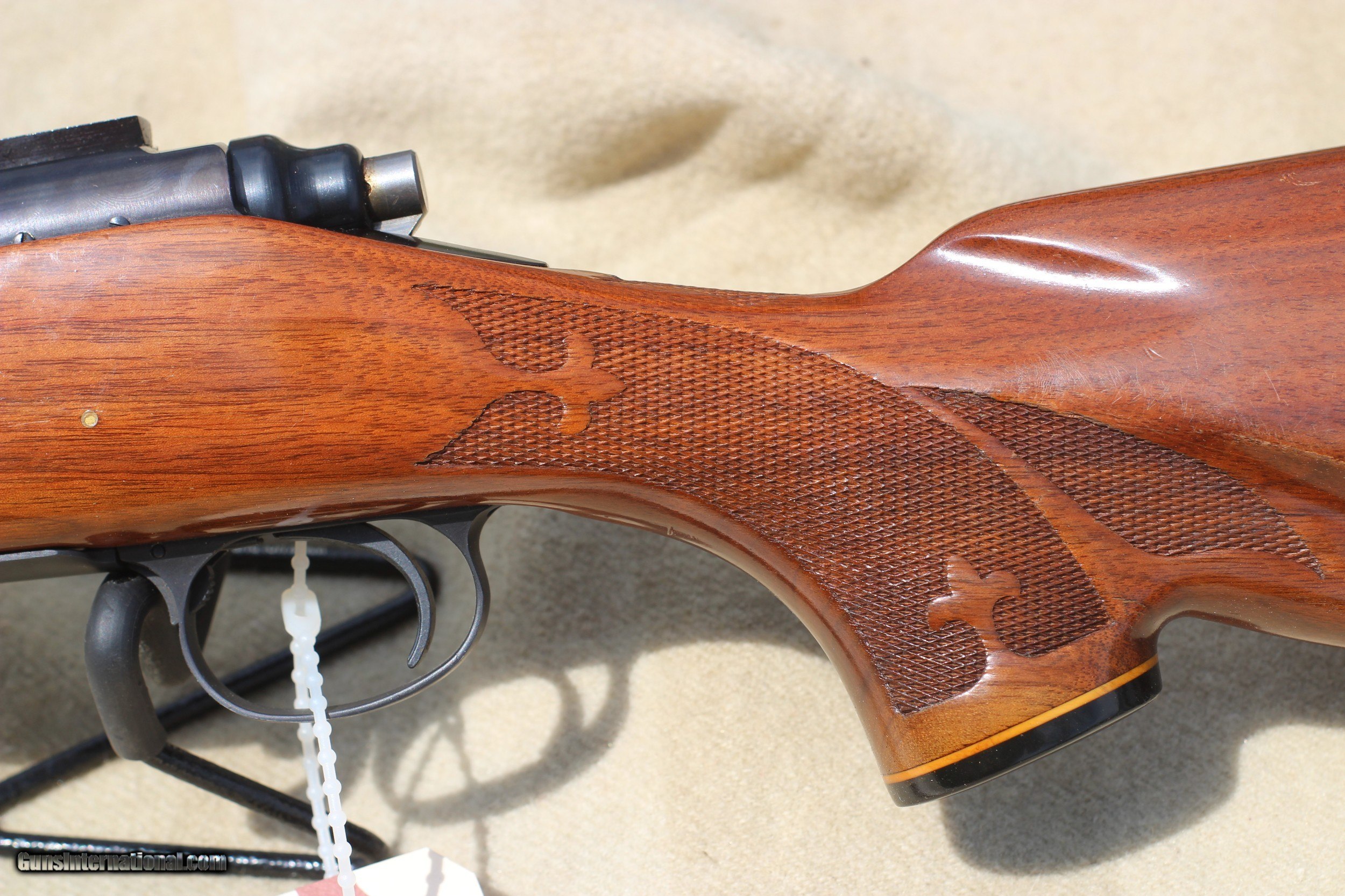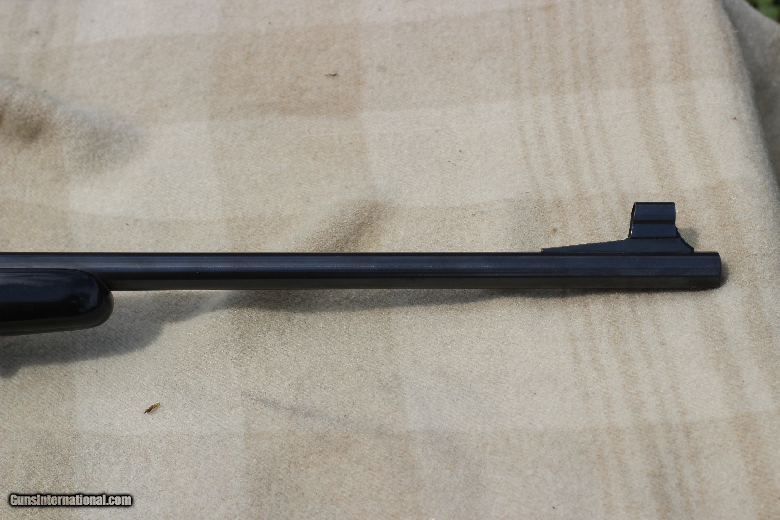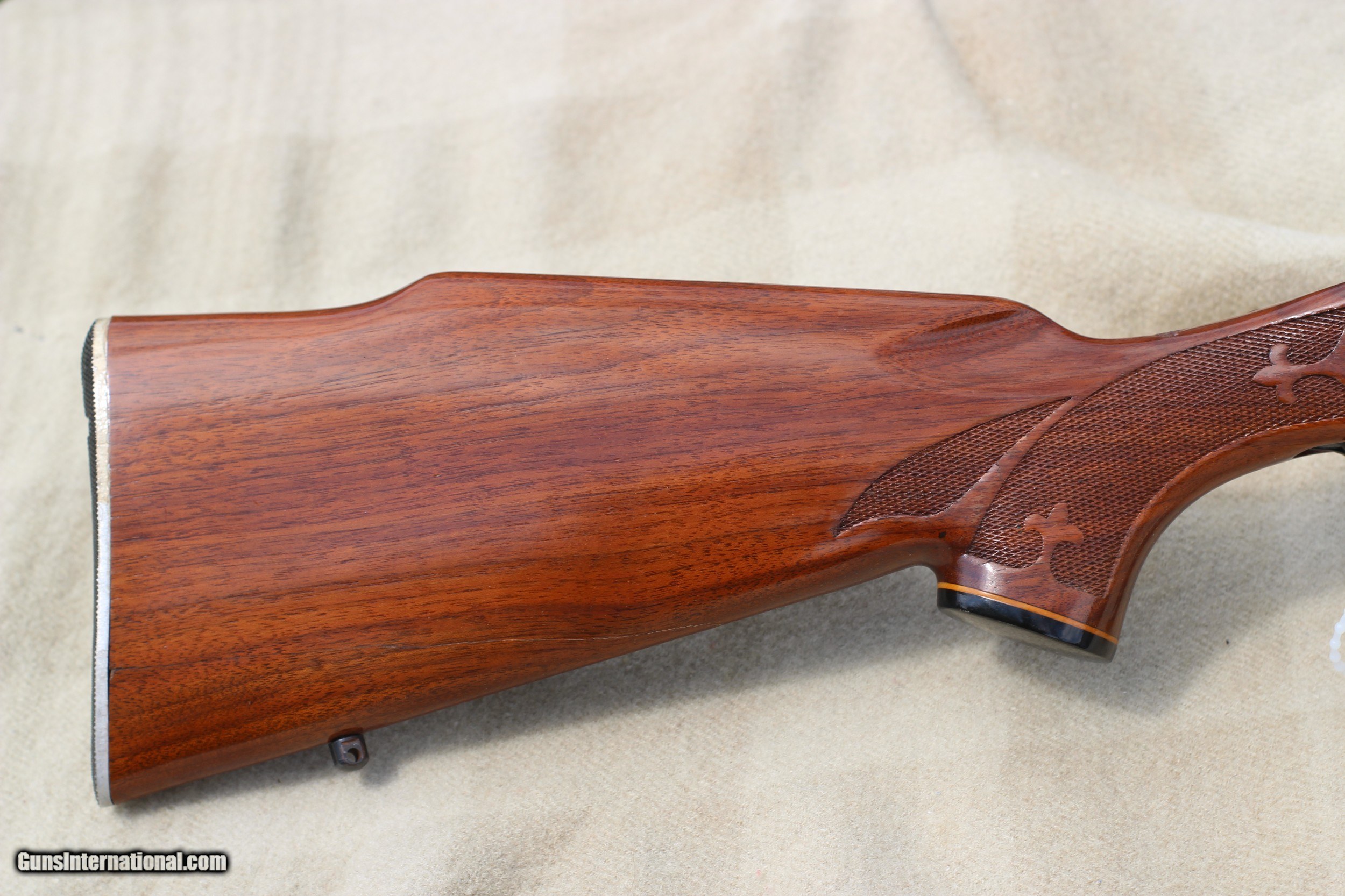Description: Standard weight barrel with very good bore 98 % factory bluing Hinged floorplate Factory front sight...rear sight included with gun (not pictured) Pressed checkering , and alumunum butt plate 98 % wood finish 1960 's production Collector condition $ 759 SOLD |