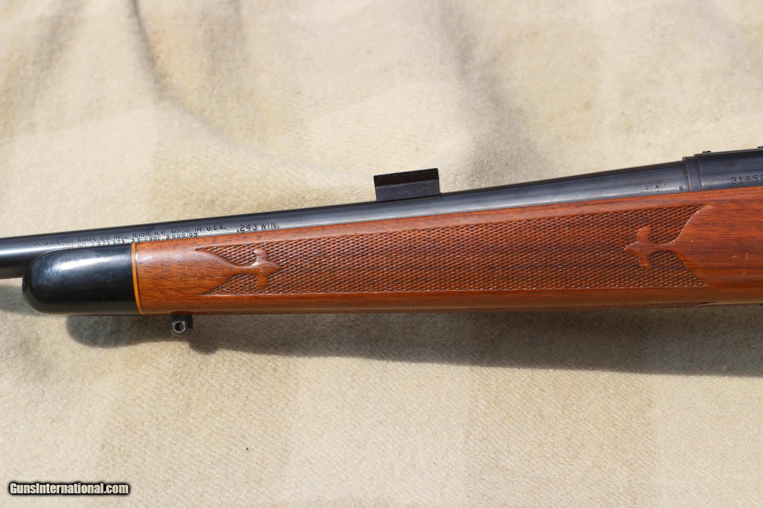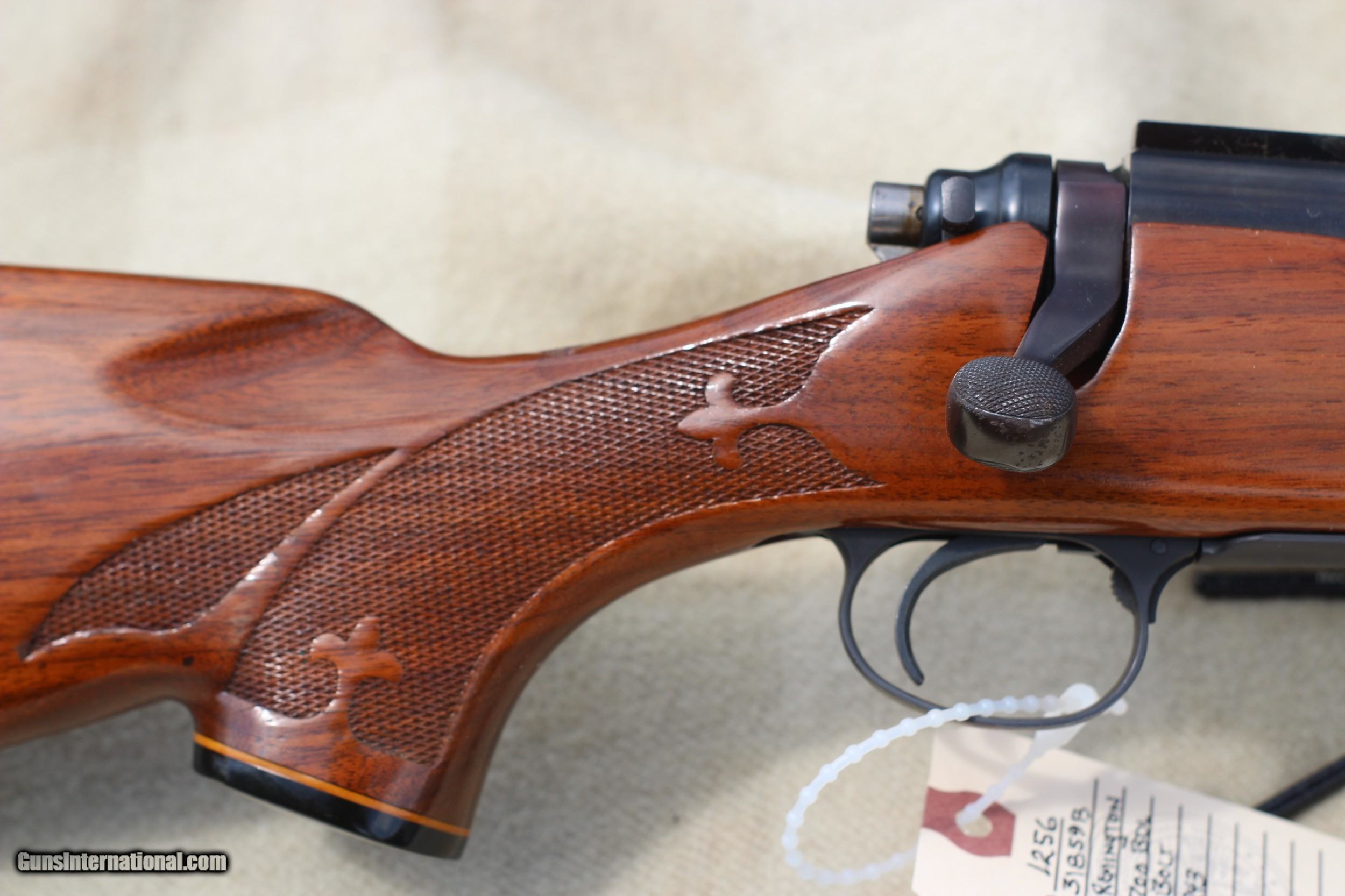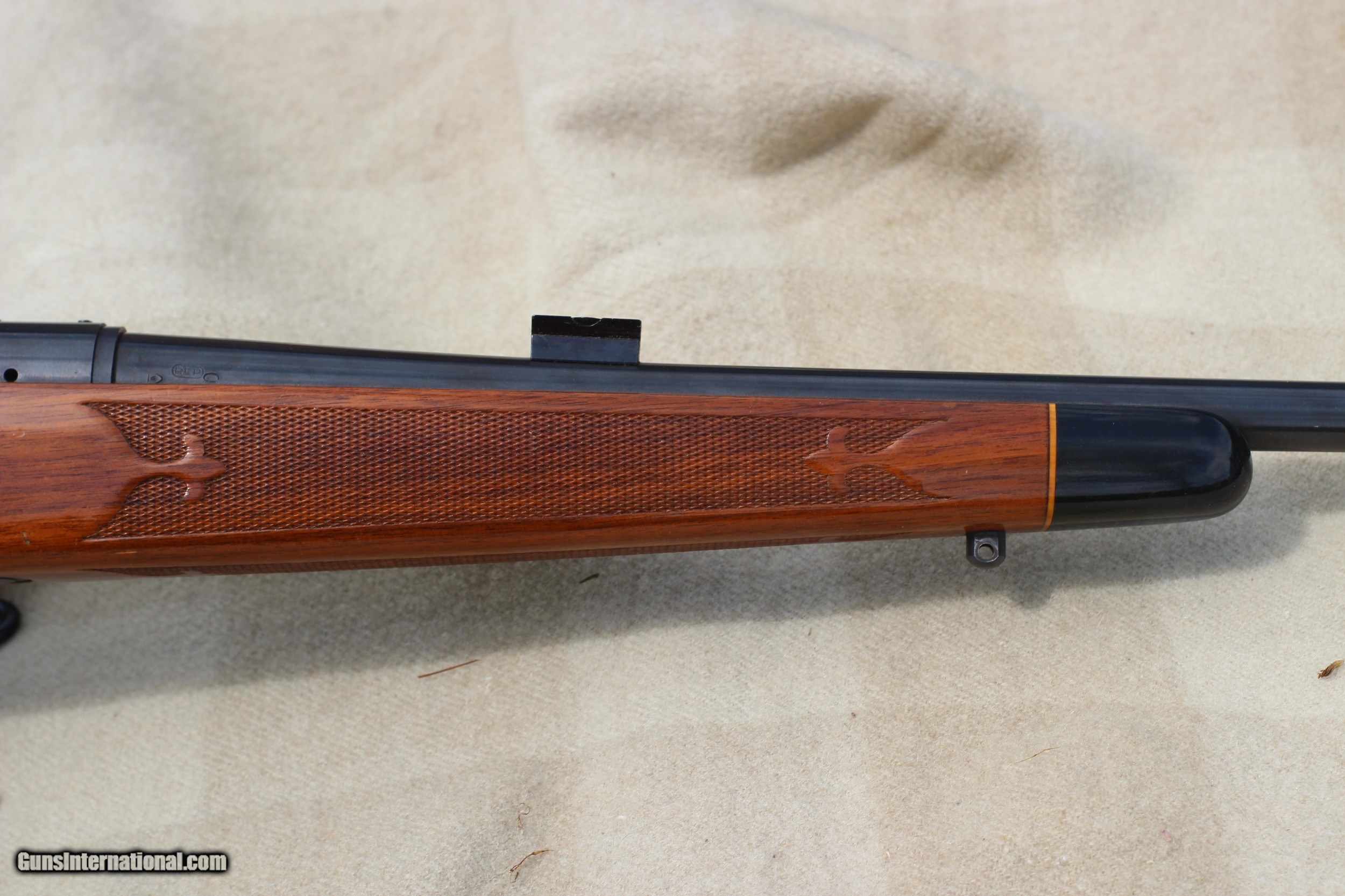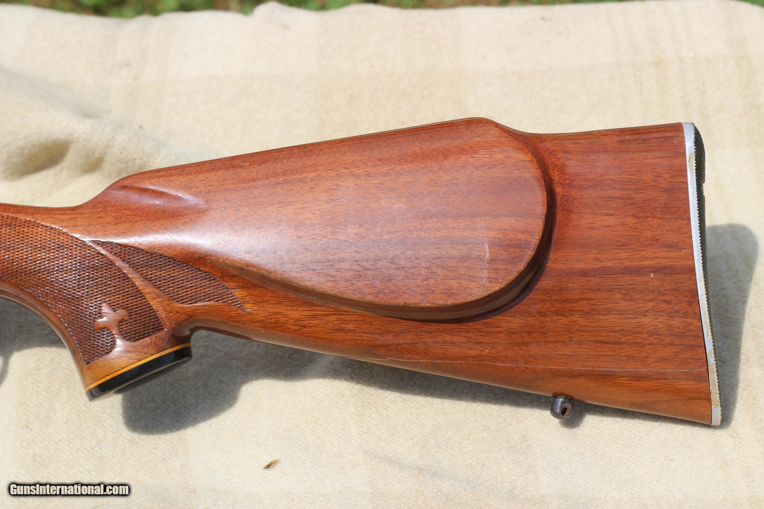 Description: Standard weight barrel with very good bore 98 % factory bluing Hinged floorplate Factory front sight...rear sight included with gun (not pictured) Pressed checkering , and alumunum butt plate 98 % wood finish 1960 's production Collector condition $ 759 SOLD |