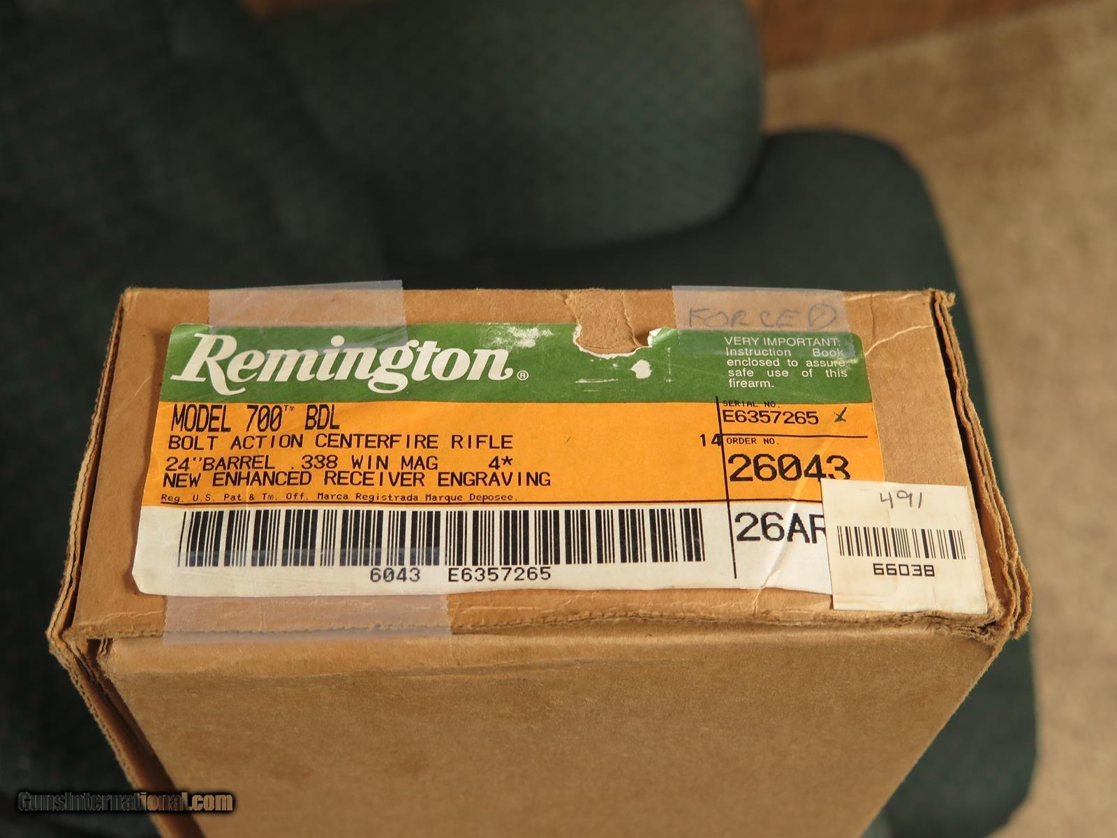 Description: Remington 700 BDL 338 Win Mag. Enhanced factory engraved. 24 inch barrel. AR barrel code. Like new condition with box and papers. Over 45 years in business, and not only do we buy guns, but we accept collections (and single/multiple guns) on consignment. SOLD Rifle Caliber: .338 Winchester Magnum |