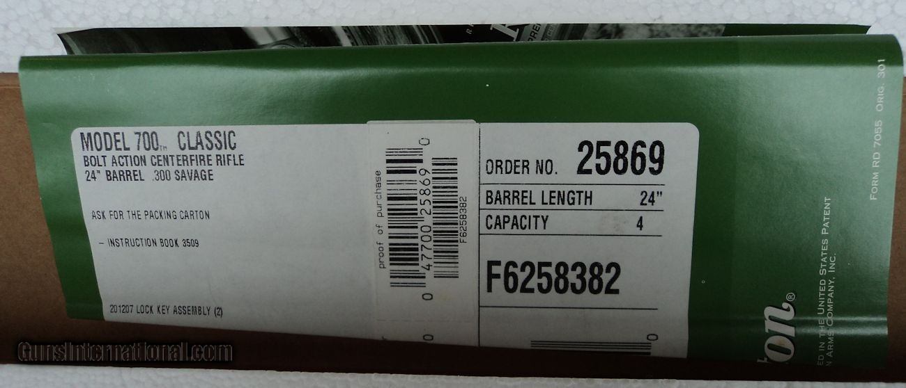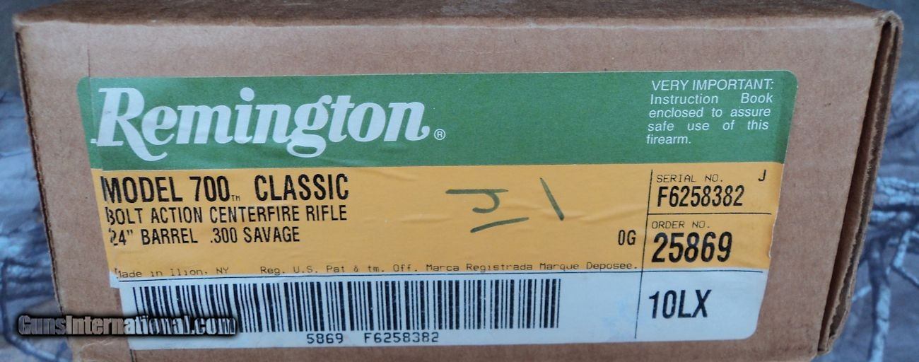 Description: *** SOLD *** SOLD *** "Collector grade" and absolutely new & unfired Remington Classic (serial # F6258382) in the old classic 300 Savage caliber with a 24" barrel. Comes with the owner's manual, small tool set in it's original factory box. Don't miss your chance to add this fine Remington to your collection. Look at the pictures! $50 S&H to most of the lower 48. Eight far west states at $60 S&H. Post office money order for payment. Consignment gun-no return. Lay-a-way is available! SOLD Manufacturer: Remington Model: 700 Classic Serial Number: F6258382 Caliber Info: 300 Savage Metal Condition: as new Wood Condition: as new Bore Condition: as new Action: bolt Extras: New in Box |