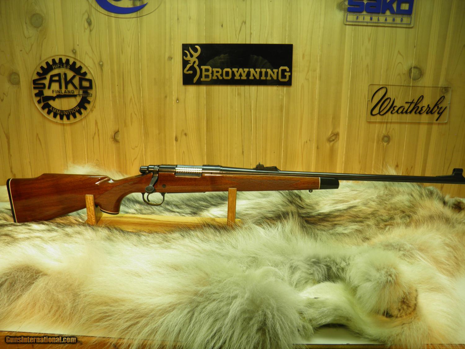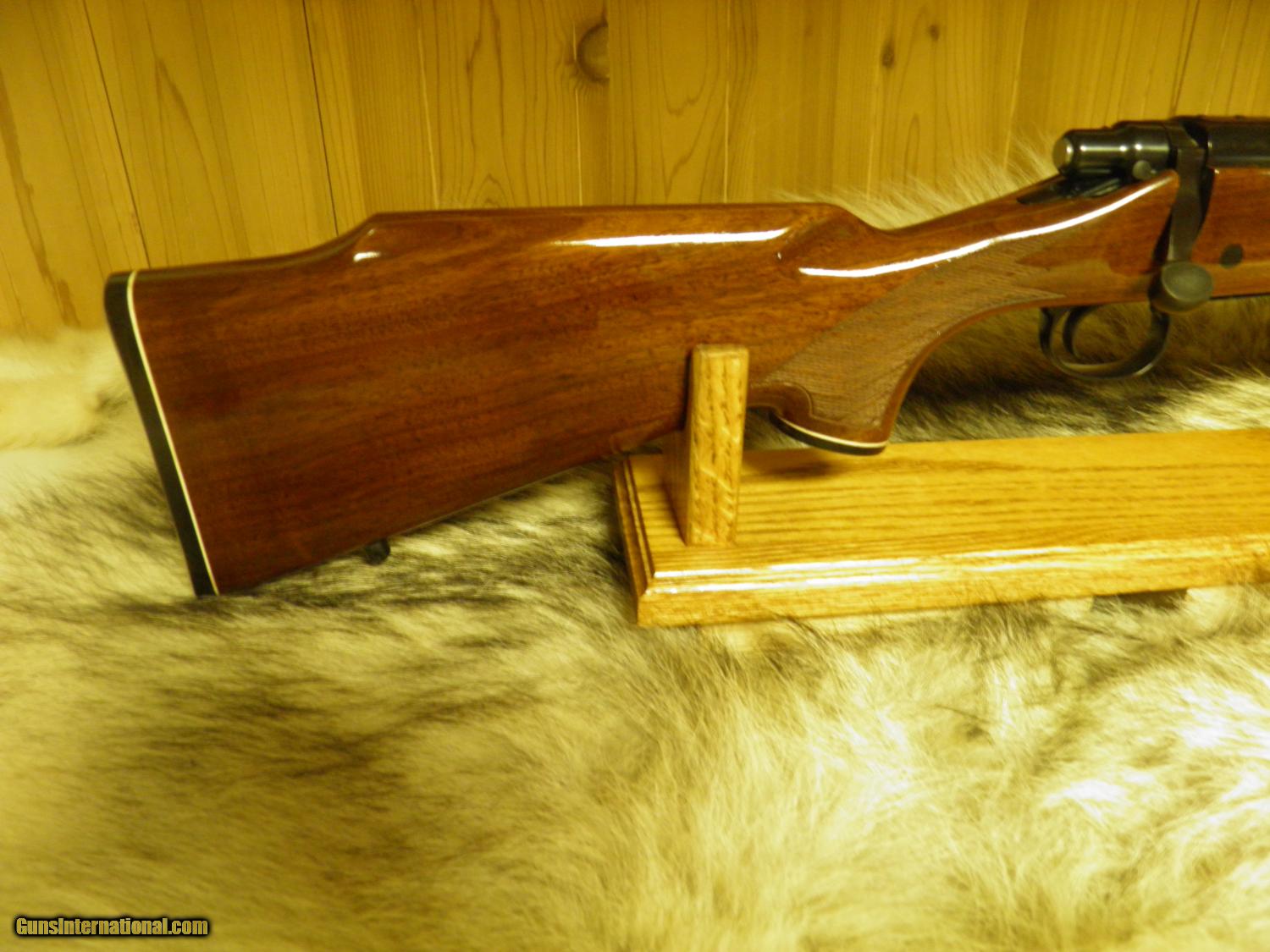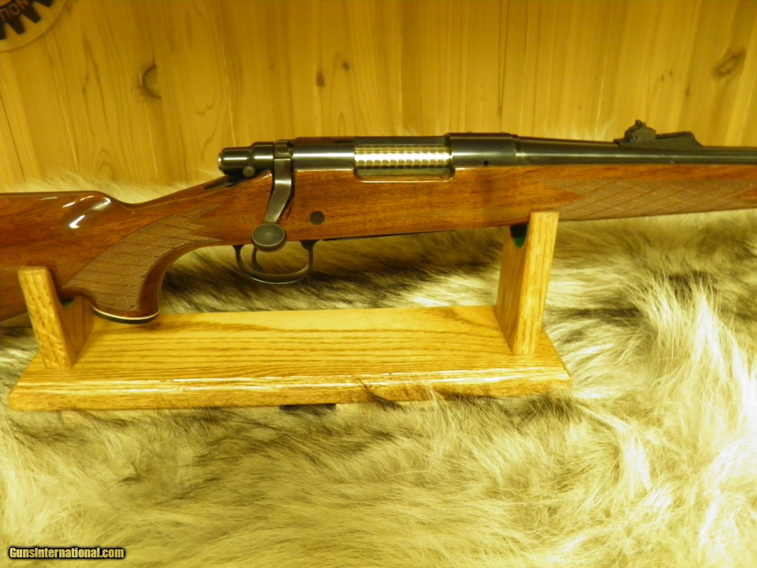 Description: REMINGTON 700 CLASSIC "LTD EDITION" CAL. 17 REM, MANF: IN 1999 ONLY, 24" BARREL WITH OPEN REAR SIGHT, FRONT SIGHT RAMPED AND HOODED, OVERALL LENGTH 43 1/2", APPROX: WEIGHT 7 1/4 LBS, LENGTH OF PULL 13 1/2", METAL SURFACES ARE MIRROR POLISH BLUEING, STOCK AMERICAN WALNUT, WITH MONTE CARLO, CHEECK PIECE, EMBELLISHED WITH BLACK PISTOL GRIP CAP AND FOREND TIP, WITH WHITE LINE SPACERS, THAT MATCH BUTT PLATE, CUT SKIP-LINE CHECKERING, ATTACHED SWIVEL STUDS, STOCK FINISHED IN HIGH GLOSS, RECEIVER DRILLED AND TAPPED FOR SCOPE BASES, NICELY JEWELLED BOLT BODY. SUPER NICE CLASSIC IN A SUPER CALIBER. "CONDITION" 100% NEW AND UNFIRED IN FACTORY BOX WITH PAPERS. SOLD |