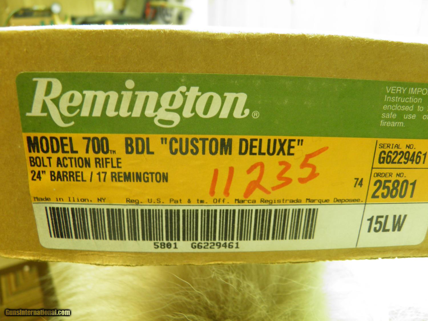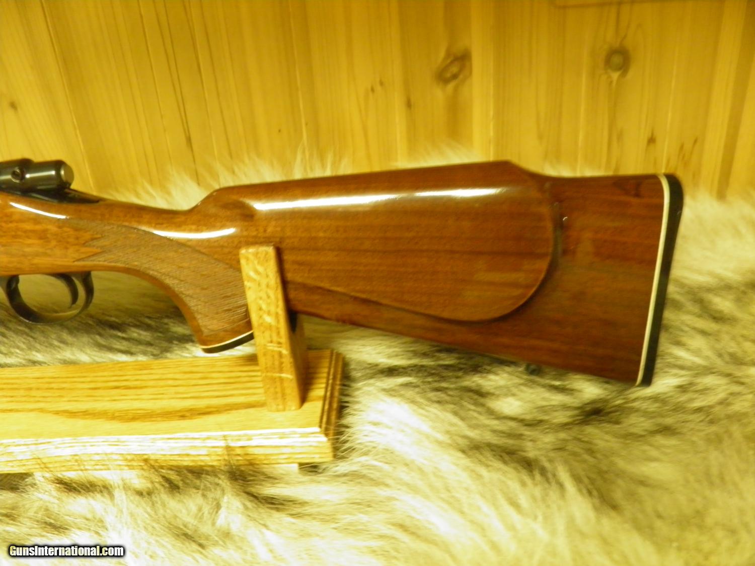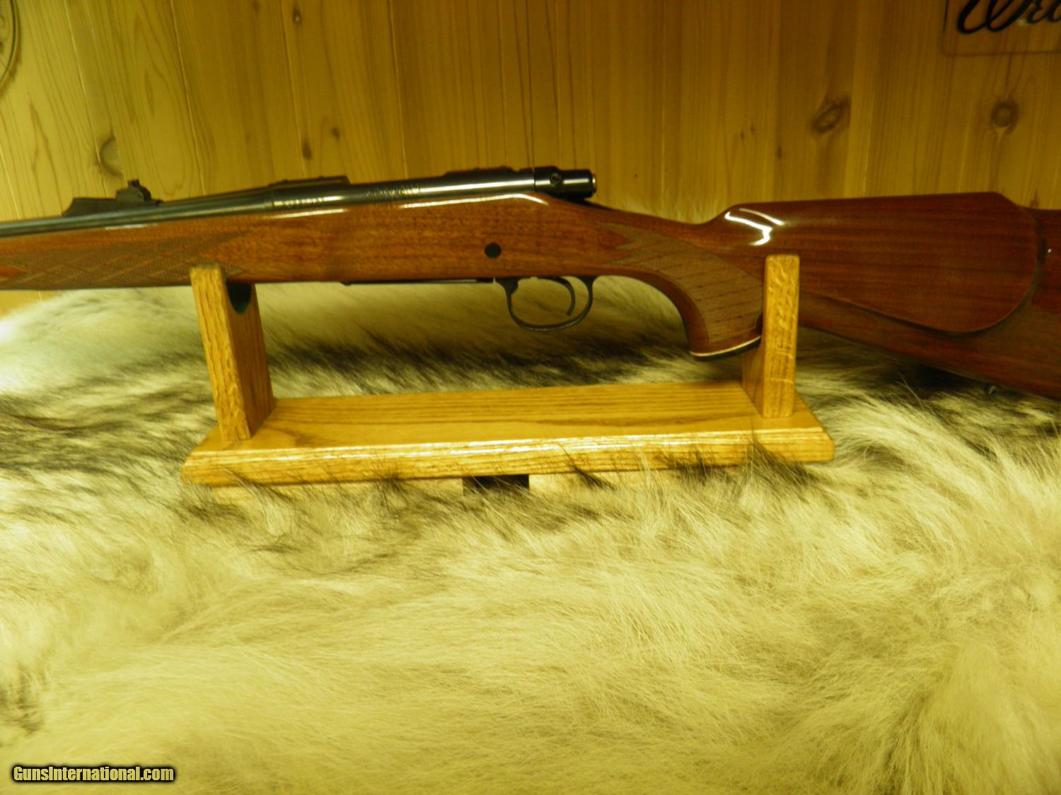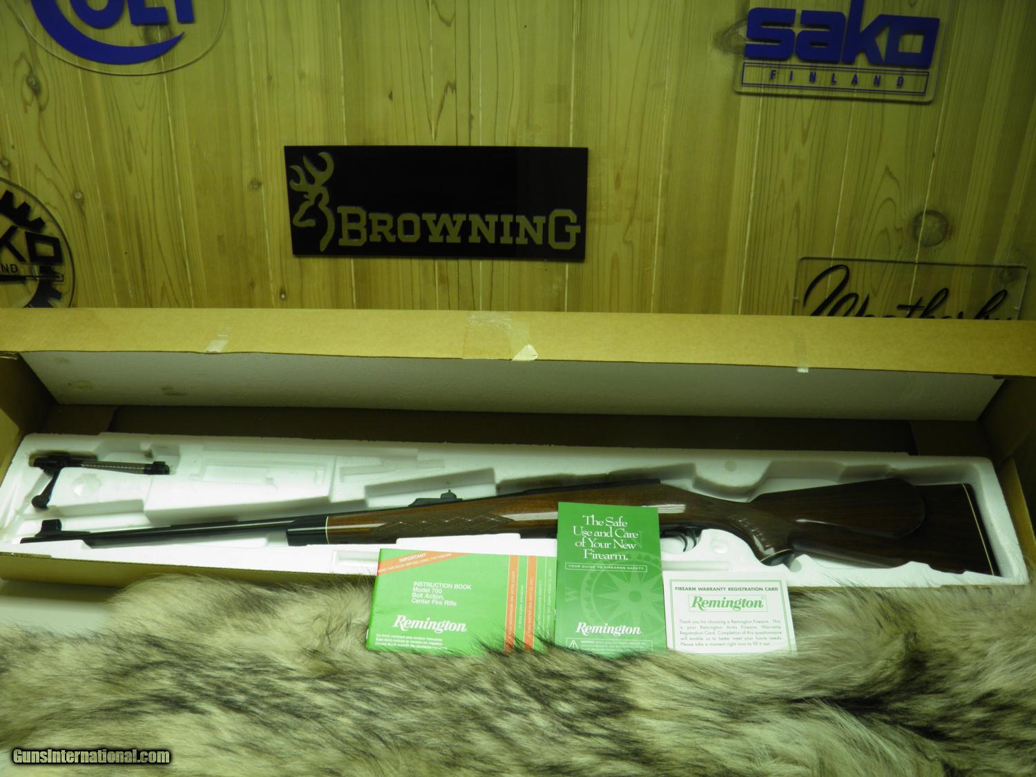 Description: REMINGTON 700 CLASSIC "LTD EDITION" CAL. 17 REM, MANF: IN 1999 ONLY, 24" BARREL WITH OPEN REAR SIGHT, FRONT SIGHT RAMPED AND HOODED, OVERALL LENGTH 43 1/2", APPROX: WEIGHT 7 1/4 LBS, LENGTH OF PULL 13 1/2", METAL SURFACES ARE MIRROR POLISH BLUEING, STOCK AMERICAN WALNUT, WITH MONTE CARLO, CHEECK PIECE, EMBELLISHED WITH BLACK PISTOL GRIP CAP AND FOREND TIP, WITH WHITE LINE SPACERS, THAT MATCH BUTT PLATE, CUT SKIP-LINE CHECKERING, ATTACHED SWIVEL STUDS, STOCK FINISHED IN HIGH GLOSS, RECEIVER DRILLED AND TAPPED FOR SCOPE BASES, NICELY JEWELLED BOLT BODY. SUPER NICE CLASSIC IN A SUPER CALIBER. "CONDITION" 100% NEW AND UNFIRED IN FACTORY BOX WITH PAPERS. SOLD |