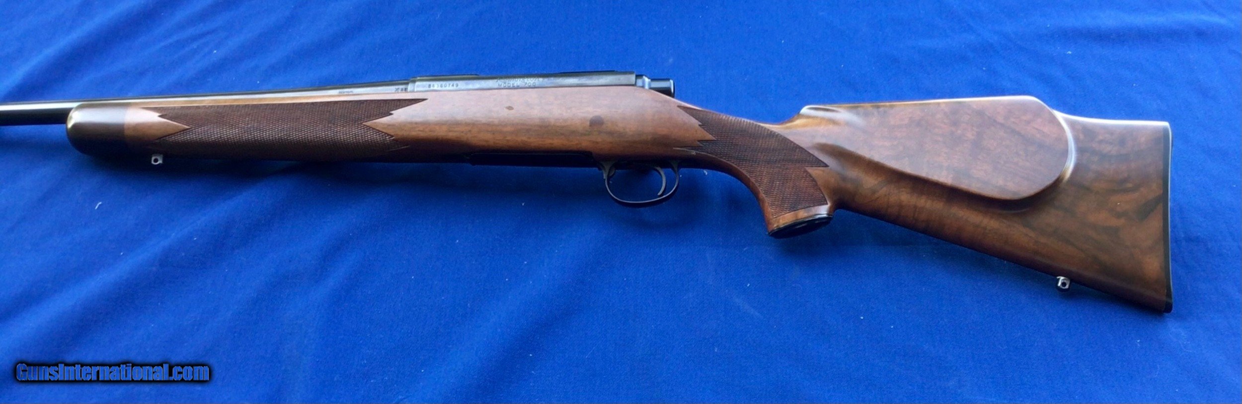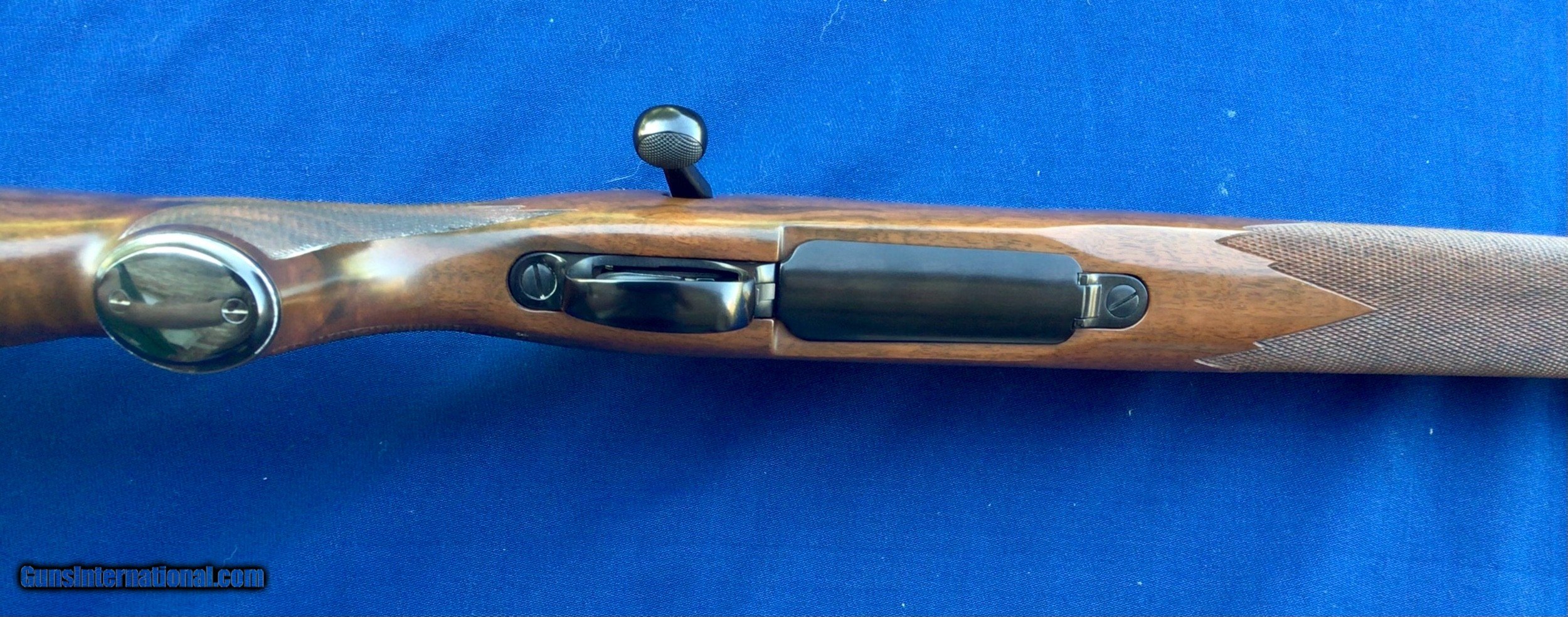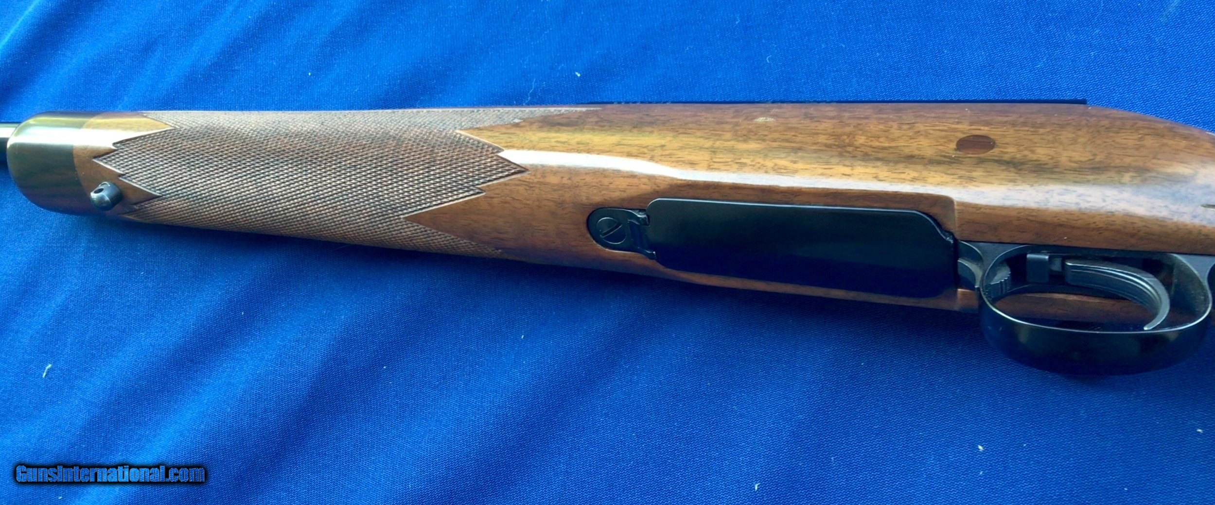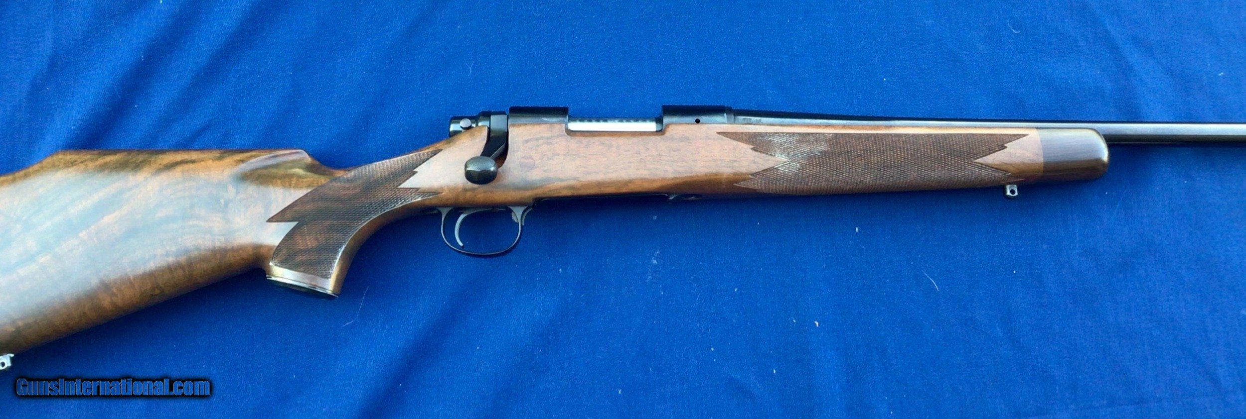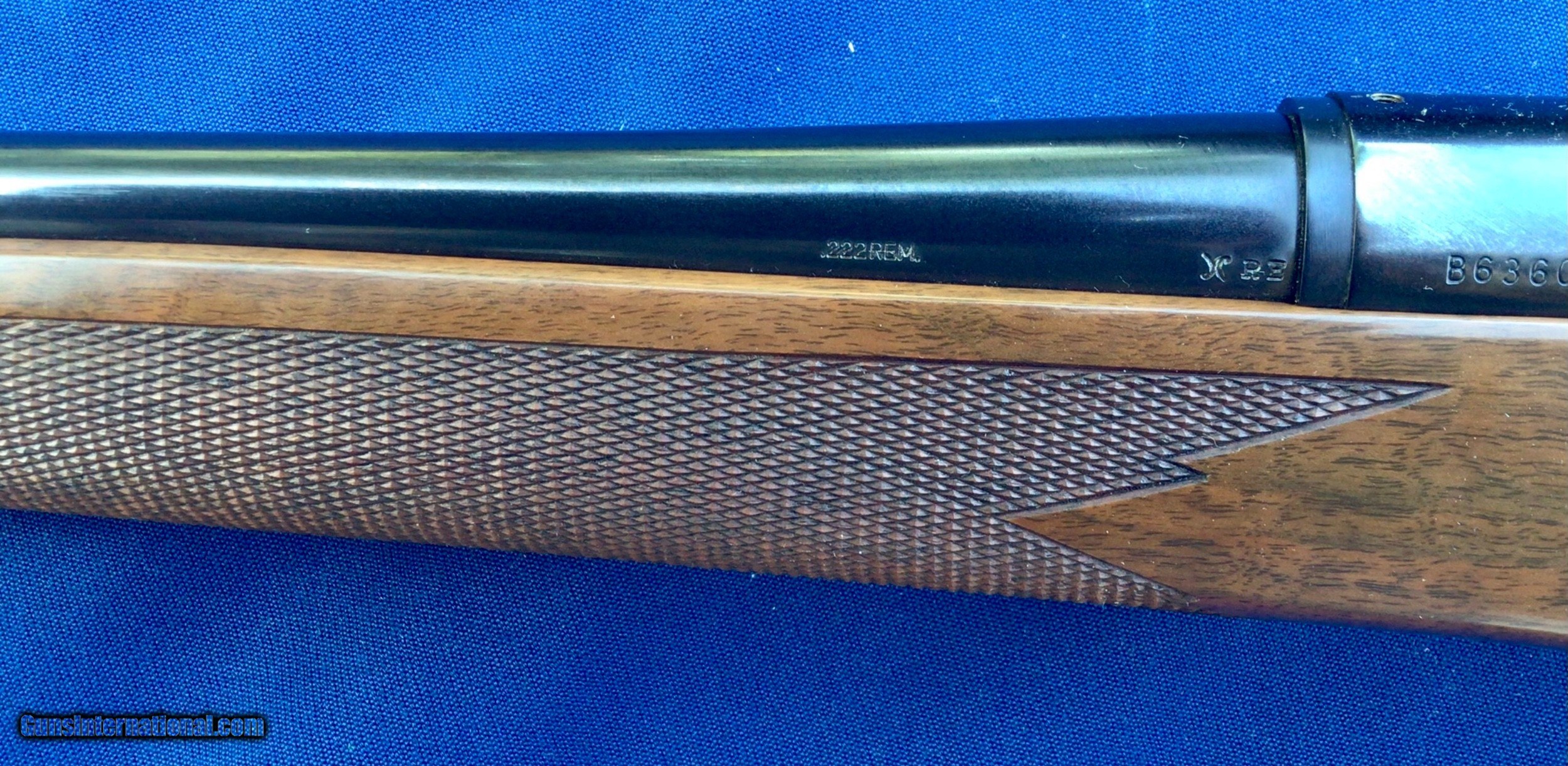 Description: Remington 700 Custom Shop Grade I in .222 Remington, made in 1984, with a 20" medium sporter weight barrel. These 1980's custom shop 700's are felt by many collectors to superior to the earlier C Grade custom shop guns in fit and finish. The metal finish remains in 99% condition and appears to be test fired only. The stock finish remains in the same condition, but does have one dent under the left side of the receiver, likely from where a bolt from another rifle bumped against it in a rack. It features an highly figured walnut stock with nice mineral streaking, ebony forend tip, steel grip cap, Monte Carlo stock, and the lovely high polish Custom Shop bluing. The photos show it honestly. This is an investment grade Remington 700 that is seldom seen. Please contact me via email, and I will respond promptly. References provided upon request. SOLD |