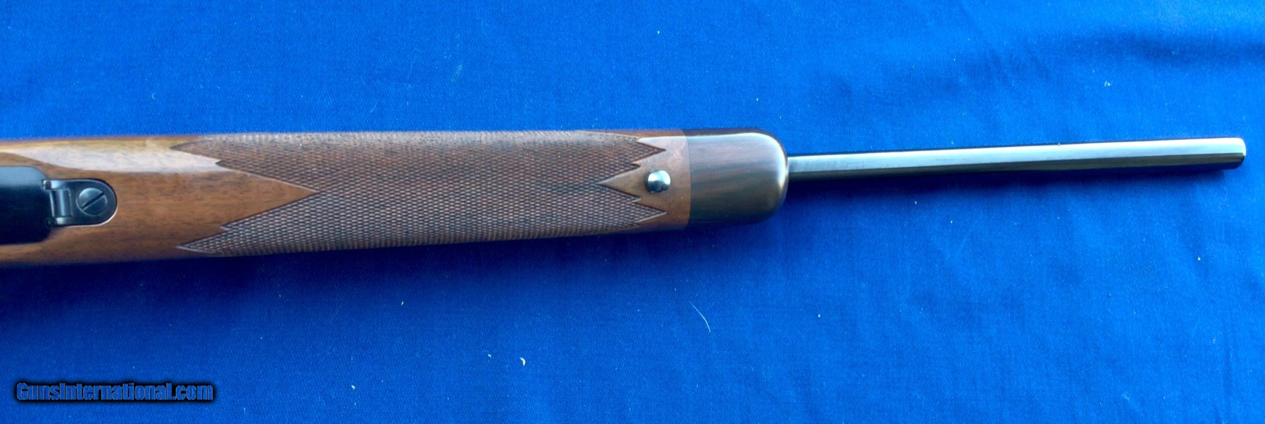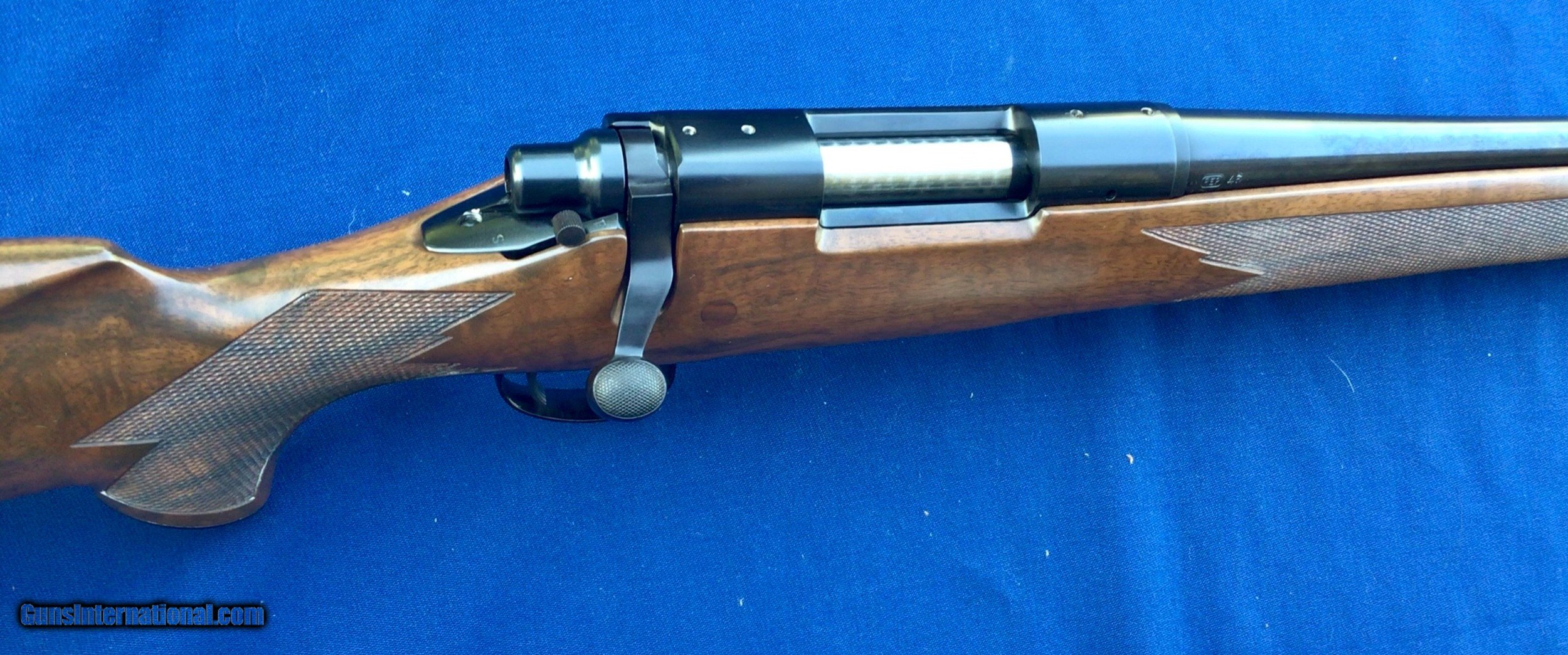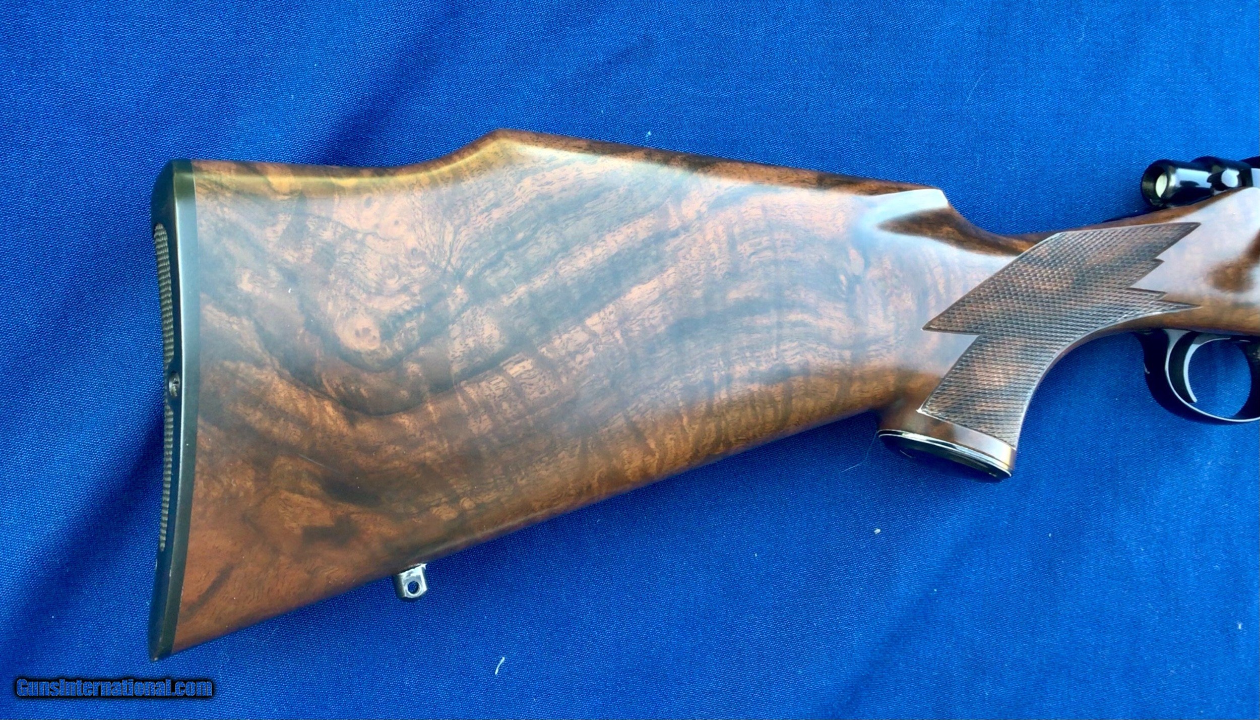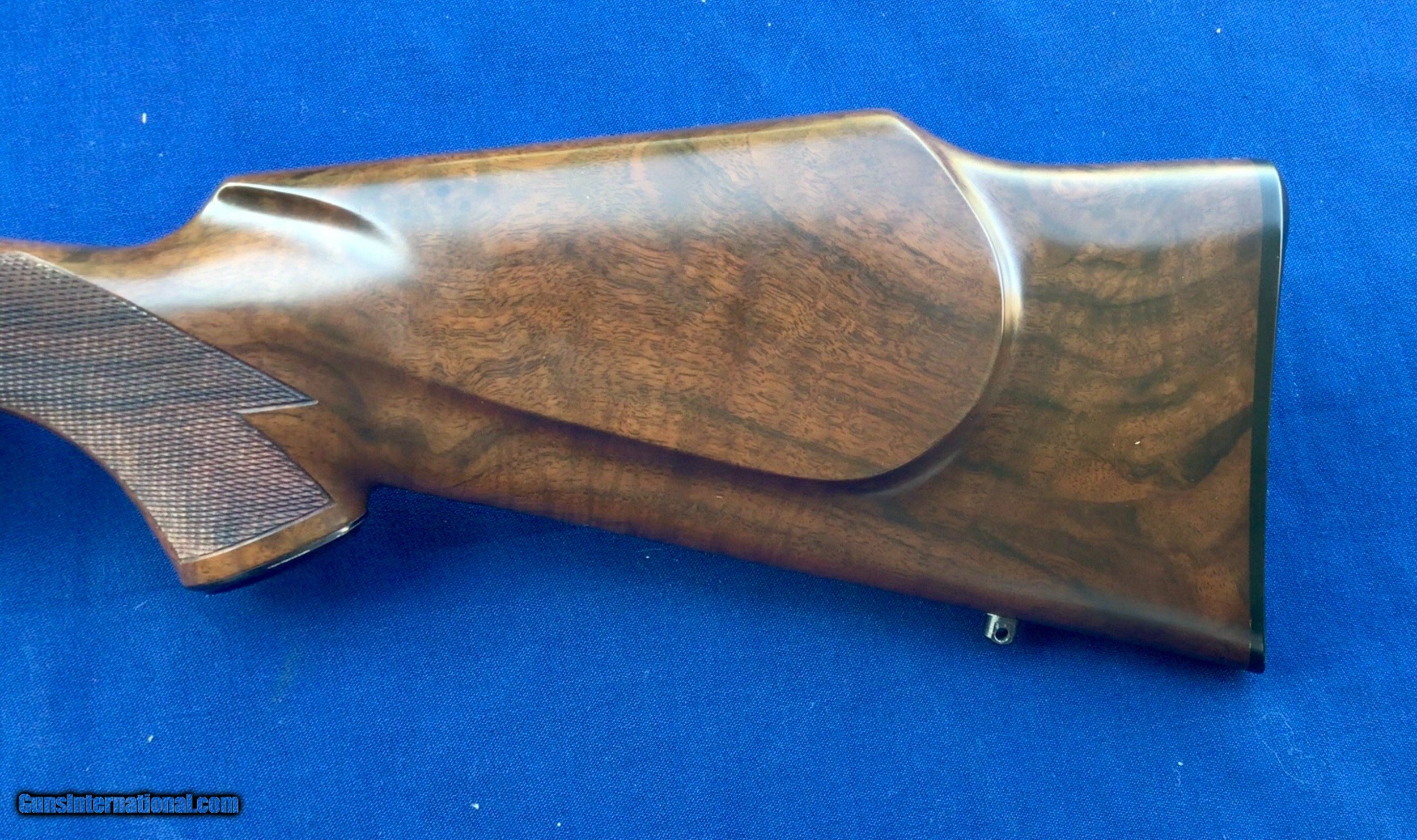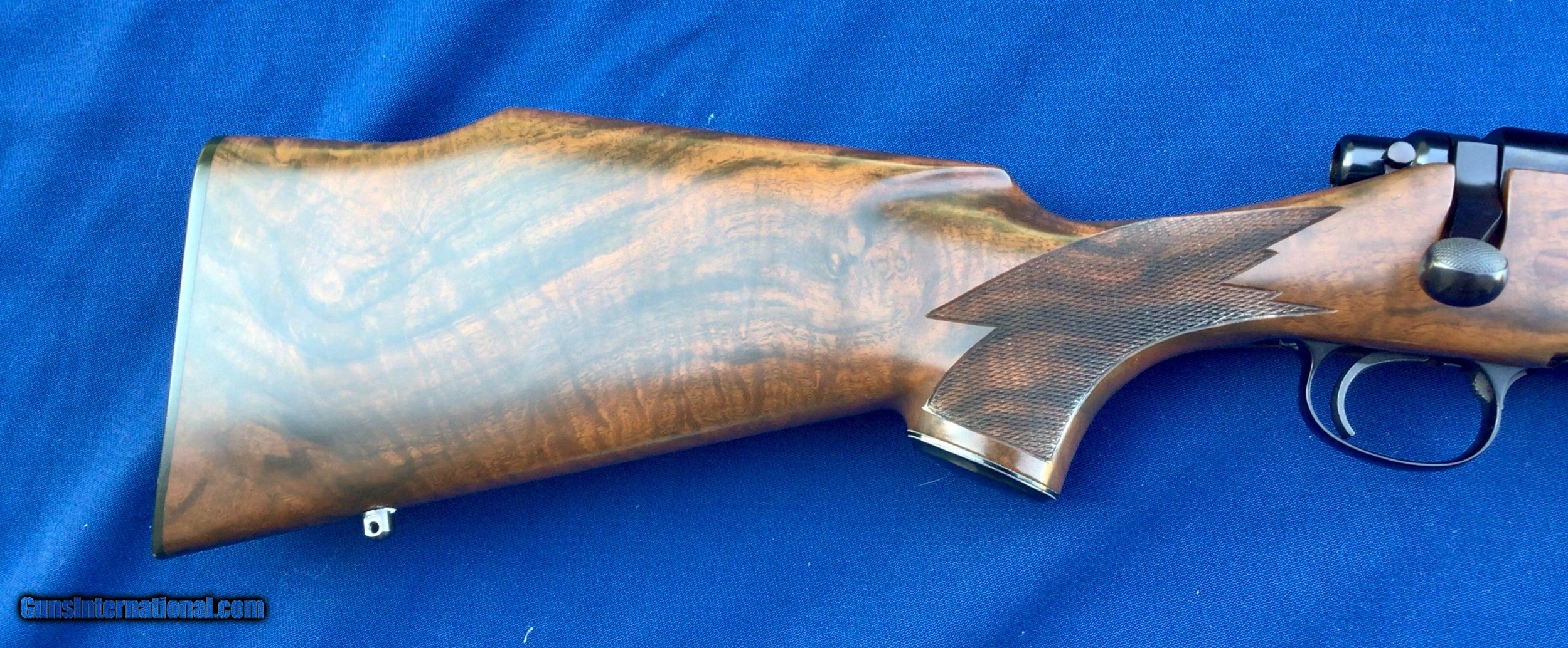 Description: Remington 700 Custom Shop Grade I in .222 Remington, made in 1984, with a 20" medium sporter weight barrel. These 1980's custom shop 700's are felt by many collectors to superior to the earlier C Grade custom shop guns in fit and finish. The metal finish remains in 99% condition and appears to be test fired only. The stock finish remains in the same condition, but does have one dent under the left side of the receiver, likely from where a bolt from another rifle bumped against it in a rack. It features an highly figured walnut stock with nice mineral streaking, ebony forend tip, steel grip cap, Monte Carlo stock, and the lovely high polish Custom Shop bluing. The photos show it honestly. This is an investment grade Remington 700 that is seldom seen. Please contact me via email, and I will respond promptly. References provided upon request. SOLD |