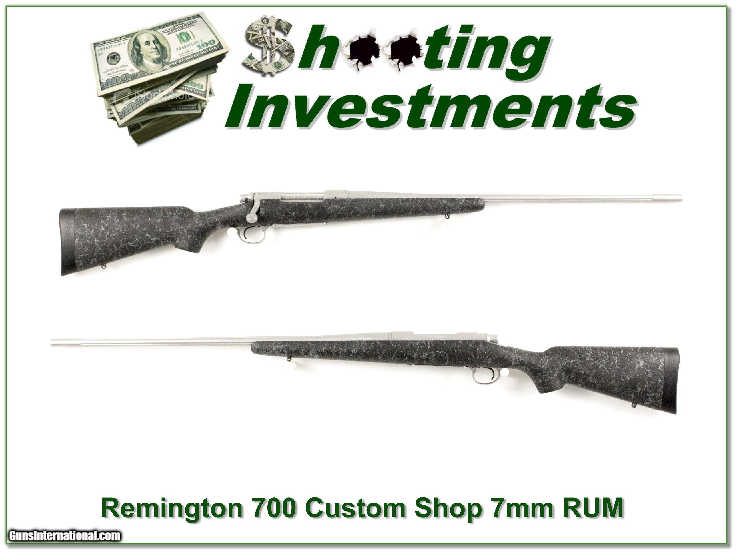 Description: Long range, hard weather hunters, this is a high-end Remington Custom Shop 700 Stainless Flutted in 7mm RUM. It is like new with no marks I see. It has a 26in barrel with super smoth bolt and crisp trigger! It you want a high-end flat shooting Remington, this is it! I am selling this one on consignment and as such, lay-a-way can’t be used. It does of course have the standard 3-day inspection. Shipping and insurance is $39 or $19 more if you want it shipped in a new Plano hard case. Please email me with any questions or larger pictures. (Consign your quality firearms with Shooting Investments for only 10%! Let me know if you have any you would like to sell!) 17-0793 Payment: Payment is by Money Order, Cashiers Check or Personal Check. I can now also accept MasterCard and Visa with a 3% convenience fee. PayPal can be used for some items but never firearms. Please let us know if you would like to pay via PayPal. Shipping: The shipping charge will be listed in each description. It is $39 for most long guns and $29 for most handguns. Some heavy guns or those insured for over $2000 will be higher. Shipments to Alaska and Hawaii are higher because air shipment is required. Most firearms are shipped on Tuesday and Thursday and usually in 5 days of receipt of payment. We package all shipments carefully and insure them. For long guns you can purchase a new Plano case for $19. They now cost us $22 when buying 100 at a time. Optics are shipped Priority Mail and most other non-firearm shipments are shipped First Class. Returns: Our return policy is simple. If for any reason you are not pleased with your purchase, you may return your item for a full refund of purchase price. Ammunition cannot be returned. It is important to us that you are happy. Guns cannot be fired or dissembled before returning them and they must be returned in the same condition as received. Notification of a return must occur with-in 3 days of receipt at your dealer. Shipping, convenience and dealer fees are not refundable and are the responsibility of the buyer. Lay-a-way: If needed, we offer a 60 day lay-a-way option on most firearms. It is 1/3 now, 1/3 in 30 days and 1/3 in 60 days. Lay-a-way firearm sales are final and if not completed the first payment cannot be returned. Consigning your firearms with Shooting Investments: We will help you get top dollar for your firearms. While most local guns shops charge 20% or more, our fee is only 10% with a minimum of $75. At your local gun shop it might take months to sell. Selling on-line provides instant access to thousands of interested buyers. You won’t find any other on-line dealer willing to sell your firearms for only 10% or listing every gun on 3 separate s. Selling through an House typically costs the seller 15% and the buyer an addition 15% (so 30%) and you have to wait several months to sell and longer to receive funds. If properly priced, we will sell your firearms in a few weeks. Send us an email or give us a call and we’ll explain how easy it is for you to get top dollar. Trading: Trading for use is really just buying your gun to re-sell. If you have a gun you want to trade, please email a picture and we will let you know what we can give or it. You will always get more if we sell it for you on consignment. Help for California Buyers: We are happy to ship to California. It is the buyer’s responsibility to make sure any item you buy is legal in your state. We are also happy to help with your purchase of a firearm from someone other than us. If you see a gun you would like to buy but the seller can’t or won’t ship to California they can ship to use and we’ll then ship it to your California dealer. The cost for this service is only $30 + shipping. Let us know if we can help! SOLD |